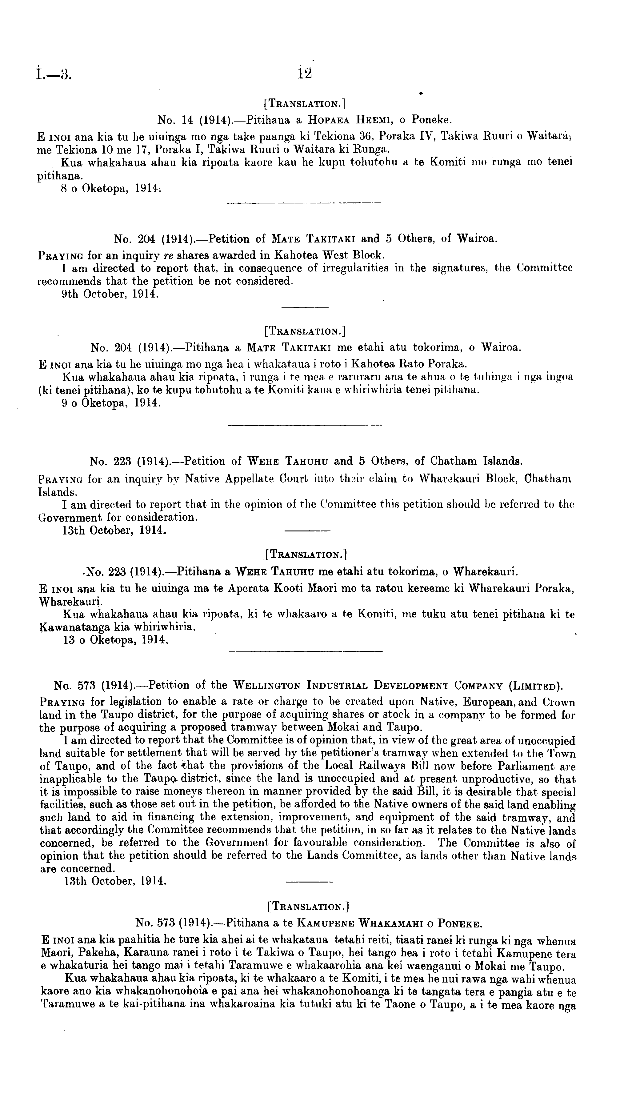 [Translation.] No. 14 (1914). —Pitihana a Hopaea Heemi, o Poneke. E inoi ana kia tv he uiuinga mo nga take paanga ki Tekiona 36, Poraka IV, Takiwa Ruuri o Waitara me Tekiona 10 me 17, Poraka I, Takiwa Ruuri o Waitara ki Runga. Kua whakahaua ahau kia ripoata kaore kau he kupu tohutohu a te Komiti mo runga mo tenei pitihana. 8 o Oketopa, 1914.