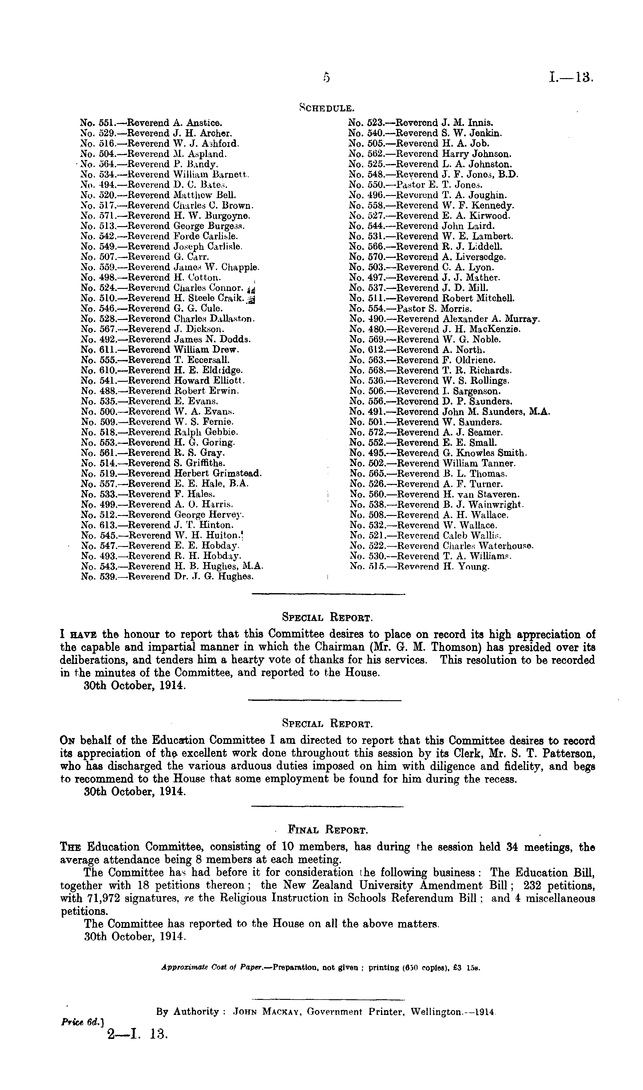 Special Report. On behalf of the Education Committee I am directed to report that this Committee desires to record its appreciation of the. excellent work done throughout this session by its Clerk, Mr. S. T. Patterson, who has discharged the various arduous duties imposed on him with diligence and fidelity, and begs to recommend to the House that some employment be found for him during the recess. 30th October, 1914.
