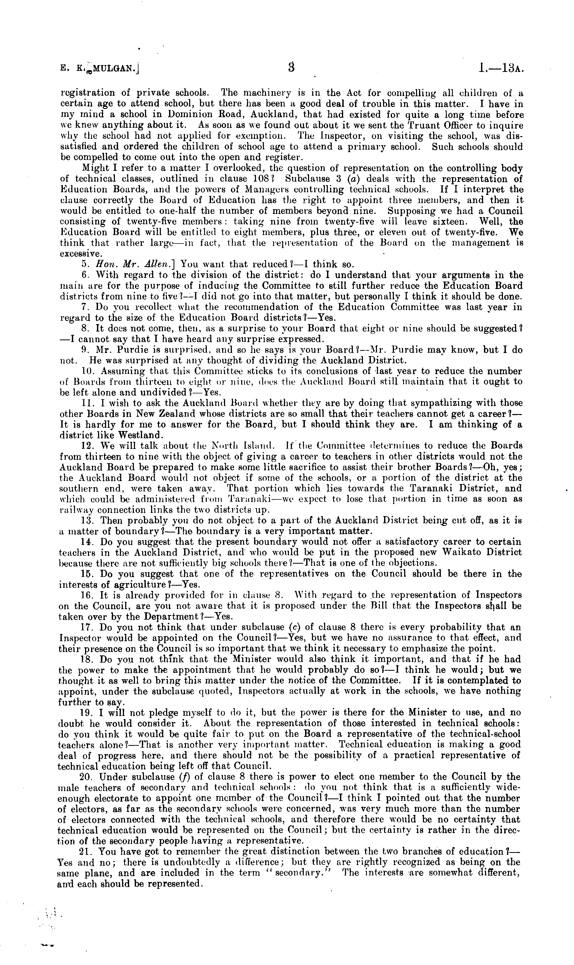 registration of private schools. The machinery is in the Act for compelling all children of a certain age to attend school, but there has been a good deal of trouble in this matter. I have in my mind a school in Dominion Road, Auckland, that had existed for quite a long time before we knew anything about it. As soon as we found out about it we sent the Truant Officer to inquire why the school had not applied for exempt ion. The Inspector, on visiting the school, was dissatisfied and ordered the children of school age to attend a primary school. Such schools should be compelled to come out into the open and register. Might I refer to a matter I overlooked, the question of representation on the controlling body of technical classes, outlined in clause 108? Subclause 3 (a) deals with the representation of Education Boards, and the powers of Managers controlling technical schools. If I interpret the clause correctly the Board of Education has the right to appoint three members, and then it would be entitled to one-half the number of members beyond nine. Supposing we had a Council consisting of twenty-five members : taking nine from twenty-five will leave sixteen. Well, the Education Board will be entitled to eight members, plus three, or eleven out of twenty-five. We think that rather large in tact, that the representation of the Board on the management is excessive. ."). Hon. Mr. Allen.] You want that reduced? —I think so. 6. With regard to the division of the district: do I understand that your arguments in the main are for the purpose of inducing the Committee to still further reduce the Education Board districts from nine to five ! —I did not go into that matter, but personally I think it should be done. 7. Do you recollect what the recommendation of the Education Committee was last year in regard to the size of the Education Board districts?— Yes. 8. It does not come, then, as a surprise to your Board that eight or nine should be suggested? —I cannot say that I have heard any surprise expressed. 9. Mr. Purdie is surprised, and so he says is your Board? —Mr. l'urdie may know, but I do not. He was surprised at any thought of dividing the Auckland District. 10. Assuming that this Committee sticks to its conclusions of last year to reduce the number of Hoards from thirteen i" eight or nine, does the Auckland Board still maintain that it ought to be left alone and undivided?— Yes. 11. I wish to ask the Auckland Board whether they are by doing that sympathizing with those other Boards in New Zealand whose districts are so small that their teachers cannot get a career?— It is hardly for me to answer for the Board, but I should think they are. I am thinking of a district like Westland. 12. We will talk about the North Island. If the Committee determines to reduce the Boards from thirteen to nine with the object of giving a career to teachers in other districts would not the Auckland Board be prepared to make some little sacrifice to assist their brother Boards?—Oh, yes; the Auckland Board would not object if some of the schools, or it portion of the district at the southern end, were taken away. That portion which lies towards the Taranaki District, and which could be administered from Taranaki - -we expect to lose that portion in time as soon as railway connection links the two districts up. 13. Then probably you do not object to a part of the Auckland District being cut off, as it is a matter of boundary?— The boundary is a very important matter. 14. Do you suggest that the present boundary would not offer a satisfactory career to certain teachers in the Auckland District, ami who would Ik- put in the proposed new Waikato District because there are not sufficiently big schools there?— That is one of the objections. 15. Do you suggest that one of the representatives on the Council should be there in the interests of agriculture?— Yes. Hi. It is already provided for in clause 8. With regard to .the representation of Inspectors on the Council, are you not aware that it is proposed under the Bill that the Inspectors shall be taken over by the Department?— Yes. 17. Do you not think that under subclause (c) of clause 8 there is every probability that an Inspector would be appointed on the Council? —Yes, but we have no assurance to that effect, and their presence on the Council is so important that we think it necessary to emphasize the point. 18. Do you not think that the Minister would also think it important, and that if he had the power to make the appointment that he would probably do so? —I think be would; but we thought it as well to bring this matter under the notice of the Committee. If it is contemplated to appoint, under the subclause quoted, Inspectors actually at work in the schools, we have nothing further to say. II). I will not pledge myself to do it, but the power is there for the Minister to use, and no doubt he would consider it. About the representation of those interested in technical schools: do you think it would be quite fair to put on the Board a representative of the technical-school teachers alone? —That is another very important matter. Technical education is making a good deal of progress here, and there should not be the possibility of a practical representative of technical education being left off that Council. 20. Under subclause (/) of clause 8 there is power to elect one member to the Council by the male teachers of secondary and technical schools: do you not think that is a sufficiently wideenough electorate to appoint one member of the Council?—l think I pointed out that the number of electors, as far as the secondary schools were concerned, was very much more than the number of electors connected with the technical schools, and therefore there would be no certainty that technical education would be represented on the Council; but the certainty is rather in the direction of the secondary people having a representative. 21. You have