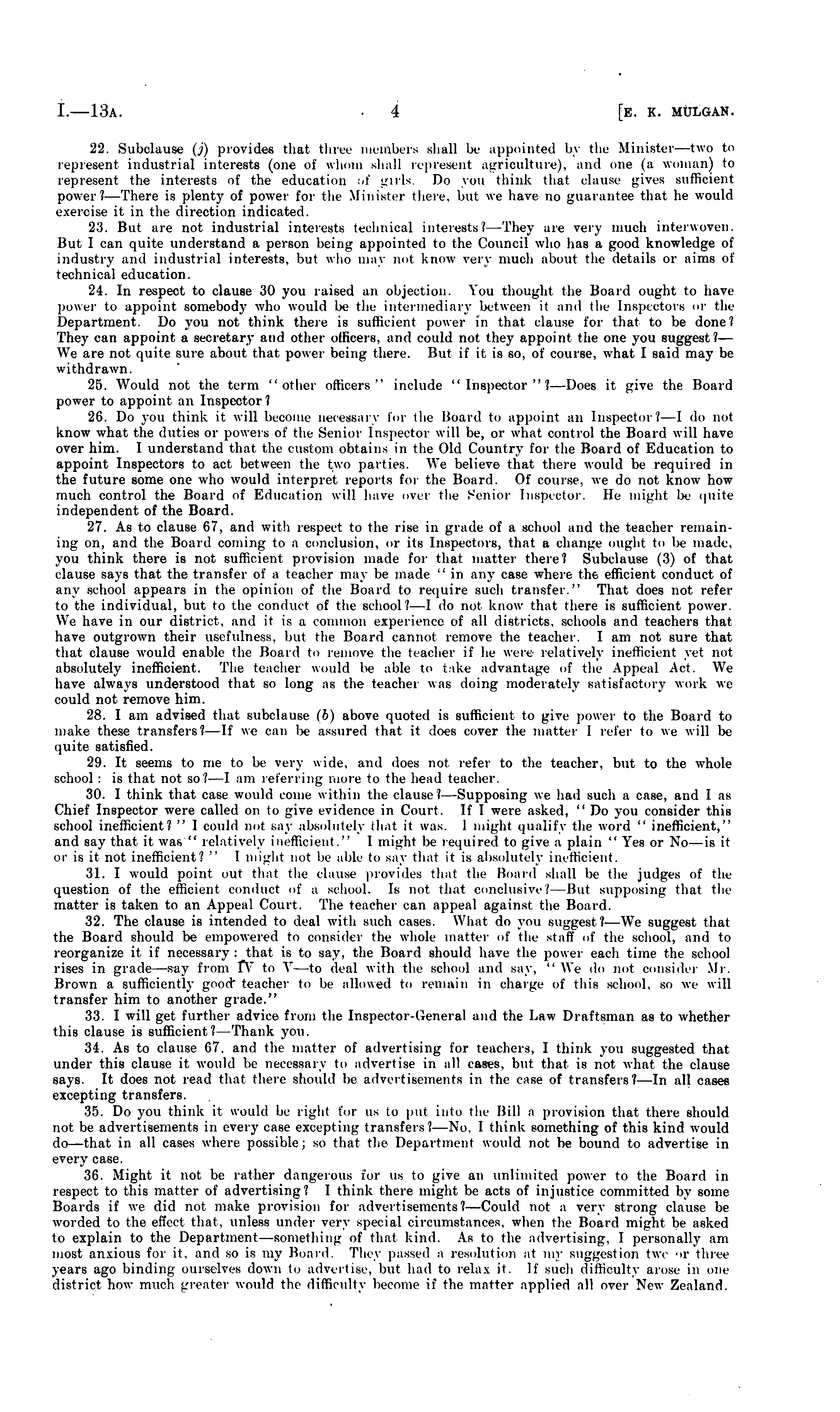 22. Subclause (j) provides that three members shall be appointed by the Minister —two to represent industrial interests (one of whom shall represent agriculture), and one (a woman) to represent the interests of the education of girls Do you think that clause gives sufficient power?— There is plenty of power for the Minister there, but we have no guarantee that he would exercise it in the direction indicated. 23. But are not industrial interests technical interests/ —They are very much interwoven. But I can quite understand a person being appointed to the Council who has a good knowledge of industry and industrial interests, but who may not know very much about the details or aims of technical education. 24. In respect to clause 30 you raised an objection. You thought the Board ought to have power to appoint somebody who would be the intermediary between it and the Inspectors or the Department. Do you not think there is sufficient power in that clause for that to be done? They can appoint a secretary and other officers, and could not they appoint the one you suggest?— We are not quite sure about that power being there. But if it is so, of course, what I said may be withdrawn. 25. Would not the term "other officers" include "Inspector"?— Does it give the Board power to appoint an Inspector ? 26. Do you think it will become necessary for the board to appoint an Inspector?—l do not know what the duties or powers of the Senior Inspector will be, or what control the Board will have over him. I understand that the custom obtains in the Old Country for the Board of Education to appoint Inspectors to act between the two parties. We believe that there would be required in the future some one who would interpret reports for the Board. Of course, we do not know how much control the Board of Education will have over the Senior Inspector. He might Ik- quite independent of the Board. 27. As to clause 67, and with respect to the rise in grade of a school and the teacher remaining on, and the Board coming to a conclusion, or its Inspectors, that a change ought to be made. you think there is not sufficient provision made for that matter there] Subclause (3) of that clause says that the transfer of a teacher may be made " in any case where the efficient conduct of any school appears in the opinion of the Board to require such transfer." That does not refer to the individual, but to the conduct of the school? —I do not know that there is sufficient power. We have in our district, and it is a common experience of all districts, schools and teachers that have outgrown their usefulness, but the Board cannot remove the teacher. I am not sure that that clause would enable the Board to remove the teacher if he were relatively inefficient yet not absolutely inefficient. The teacher would be able to take advantage of the Appeal Act. We have always understood that so long as the teacher was doing moderately satisfactory work we could not remove him. 28. I am advised that subclause (/*) above quoted is sufficient to give power to the Board to make these transfers? —If we can Ik- assured that it does cover the matter I refer to we will be quite satisfied. 29. It seems to me to be very wide, and does not refer to the teacher, but to the whole school : is that not so?—I am referring more to the head teacher. 30. I think that case would come within the clause?— Supposing we had such a case, and I as Chief Inspector were called on to give evidence in Court. If I were asked, "Do you consider this school inefficient? " I could not say absolutely that it was. 1 might qualify the word " inefficient," and say that it was " relatively inefficient." 1 might be required to give a plain " Yes or No —is it or is it not inefficient? " 1 might not be able to say that it is absolutely inefficient. 31. I would point out that the clause provides that the Board shall be the judges of tinquestion of the efficient conduct of a school. Is not that conclusive .'--But supposing that the matter is taken to an Appeal Court. The teacher can appeal against the Board. 32. The clause is intended to deal with such cases. What do you suggest?—We suggest that the Board should be empowered to consider the whole matter of the staff of the school, and to reorganize it if necessary: that is to say. the Board should have the power each time the school rises in grade—say from IT to V—to deal with the school and say, " We do not consider Mr. Brown a sufficiently good" teacher to be allowed to remain in charge of this school, so we will transfer him to another grade." 33. I will get further advice from the Inspector-General and the Law Draftsman as to whether this clause is sufficient?— Thank you. 34. As to clause 67, and the matter of advertising for teachers. I think you suggested that under this clause it would be necessary to advertise in all eases, but that is not what the clause says. It does not read that there should be advertisements in the case of transfers? —In all cases excepting transfers. 35. Do you think it would be right for us to put into the Bill a provision that there should not be advertisements in every case excepting transfers?—No, I think something of this kind would do—that in all cases where possible; so that the Department would not be bound to advertise in every case. 36. Might it not be rather dangerous for us to give an unlimited power to the Board in respect to this matter of advertising? I think there might be acts of injustice committed by some Boards if we did not make provision for advertisements?— Could not a very strong clause be worded to the effect that, unless under very special circumstances, when the Board might be asked to explain to the Department—something of that kind. As to the advertising. I personally am most anxious for it. and so is my Board. They passed a resolution at niv suggestion twe or three years ago binding ourselves down to advertise, but had to relax it. If suc