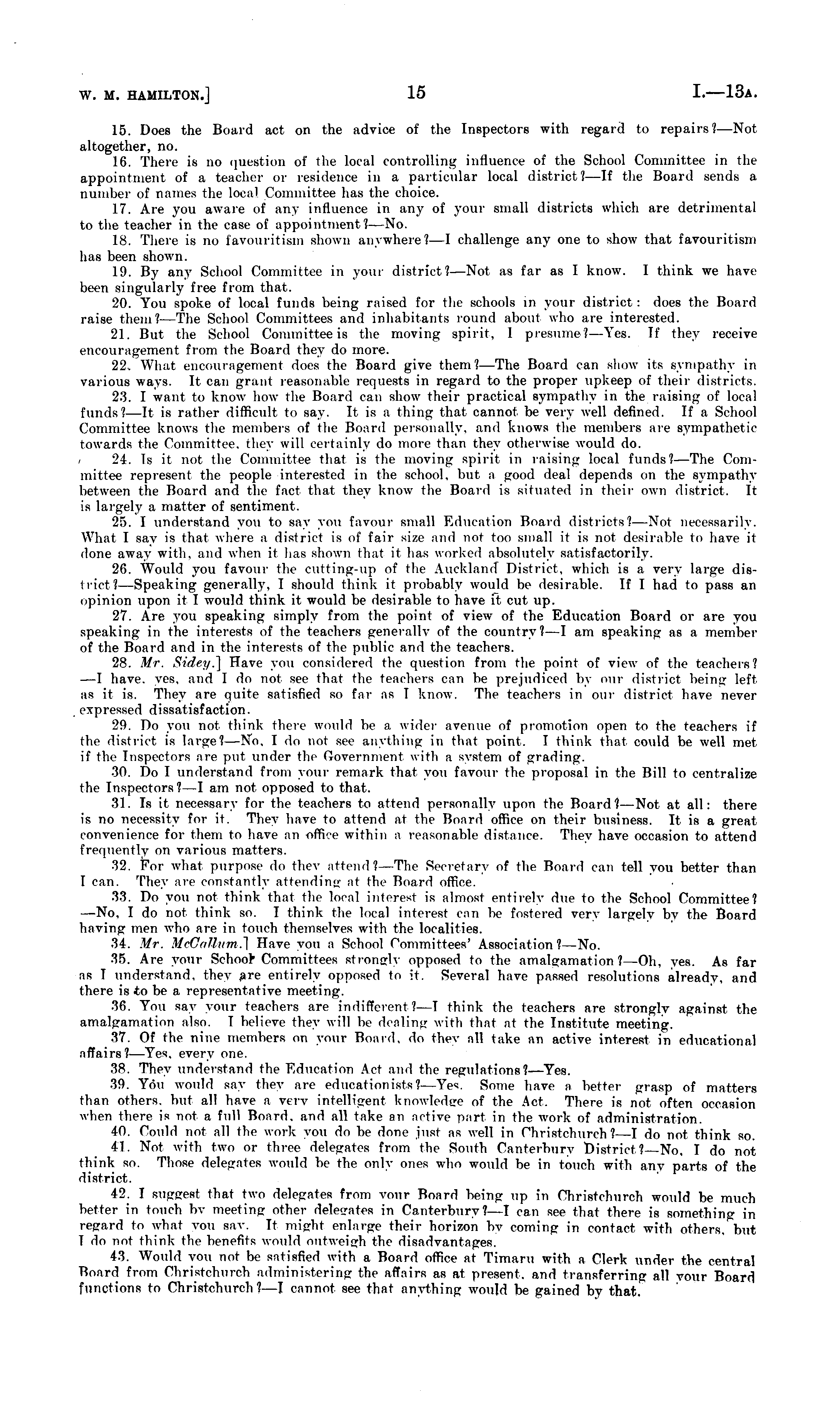 15. Does the Board act on the advice of the Inspectors with regard to repairs?— Not altogether, no. 16. There is no question of the local controlling influence of the School Committee in the appointment of a teacher or residence in a particular local district?—lf the Board sends a number of names the local Committee has the choice. 17. Are you aware of any influence in any of your small districts which are detrimental to the teacher in the case of appointment?— No. 18. There is no favouritism shown anywhere?—l challenge any one to show that favouritism has been shown. 19. By any School Committee in your district?— Not as far as I know. I think we have been singularly free from that. 20. You spoke of local funds being raised for the schools in your district: does the Board raise them?— The School Committees and inhabitants round about who are interested. 21. But the School Committee is the moving spirit, I presume? —Yes. If they receive encouragement from the Board they do more. 22. What encouragement does the Board give them I —The Board can show its sympathy in various ways. It can grant reasonable requests in regard to the proper upkeep of their districts. 23. I want to know how the Board can show their practical sympathy in the raising of local funds?—lt is rather difficult to say. It is a thing thai cannot be very well defined. If a School Committee knows the members of the Board personally, and knows the members are sympathetic towards the Committee, they will certainly do more than they otherwise would do. / 21. Is it not the Committee that is the moving spirit in raising local funds?— The Committee represent the people interested in the school, but a good deal depends on the sympathy between the Board and the fact that they know the Board is situated ill their own district. It is largely a matter of sentiment. 25. I understand you to say you favour small Education Board districts?— Not necessarily. What I sax- is that where a district is of fair size and not too small it is not desirable to have it done away with, and when it has shown that it has worked absolutely satisfactorily. 26. Would you favour the cutting-up of the Auckland District, which is a very large district ?—Speaking generally. I should think it probably would be desirable. If I bad to pass an opinion upon it I would think it would be desirable to have it cut up. 27. Are you speaking simply from the point of view of the Education Board or are you speaking in the interests of the teachers generally of the country?—l am speaking as a member of the Board and in the interests of the public and the teachers. 28. .1//. Sidey.] Have you considered the question from the point of view of the teachers.' —I have, yes, and I do not see that the teachers can be prejudiced by our district being left as it is. They are quite satisfied so far as I know. The teachers in our district have never expressed dissatisfaction. 29. Do you not think there would be a wider avenue of promotion open to the teachers if the district is large?— No. Ido not see anything in that point. I think that could be well met if th<- Inspectors are put under the Government with a system of grading. 30. Do I understand from your remark that you favour (he proposal in the Bill to centralize the Inspectors?—l am not opposed to that. 31. Is it necessary for the teachers to attend personally upon the Board?— Not at all: there is no necessity for it. They have to attend at the Board office on their business. Tt is a great convenience for them to have an office within a reasonable distance. They have occasion to attend frequently on various matters. 32. For what purpose do they attend?— The Secretary of the Board can tell you better than 1 can. They are constantly attending at the Board office. 33. Do you not think that the local interest is almost entirely due to the School Committee? —No, I do not think so. I think the local interest can be fostered very largely by the Board having men who are in touch themselves with the localities. 34. Mr. MrCallnm .l Dave you a School Committees' Association?— No. 35. Are your School- Committees strongly opposed to the amalgamation?—Oh, yes. As far as I understand, they are entirely opposed to it. Several have passed resolutions already, and there is to be a representative meeting. 36. You say your teachers are indifferent?—l think the teachers are strongly against the amalgamation also. T believe they will be dealing with that at the Institute meeting. 37. Of the nine members on your Board, do they all take an active interest in educational a (Tail's?— Yes, every one. 38. They understand the Education Act ami the regulations?— Yes. 39. You would say they are educationists?— Yes. Some have a better grasp of matters than others, but all have a very intelligent knowledge of the Act. There is not often occasion when there is not a full Board, and all take an artive part in the work of administration. 40. Could not all the work you do be done just as well in Christchurch ?— T do not think so. 41. Not with two or three delegates from the South Canterbury District?— No. I do not think so. Those delegates would be the only ones who would be in touch with any parts of the district. 42. I suggest that two delegates from your Board being up in Christchurch would be much belter in touch by meeting other delegates in Canterbury?—l can see that there is something in regard to what you say. Tt might enlarge their horizon by coming in contact with others, but I do not think the benefits would outweigh the disadvantages. 43. Would you not be satisfied with a Board office at Timaru with a Clerk under the central Board from Christchurch administering the affairs as at present, and transferring all your Board functions to Christchurch?—l cannot see that anything would be gained by that.