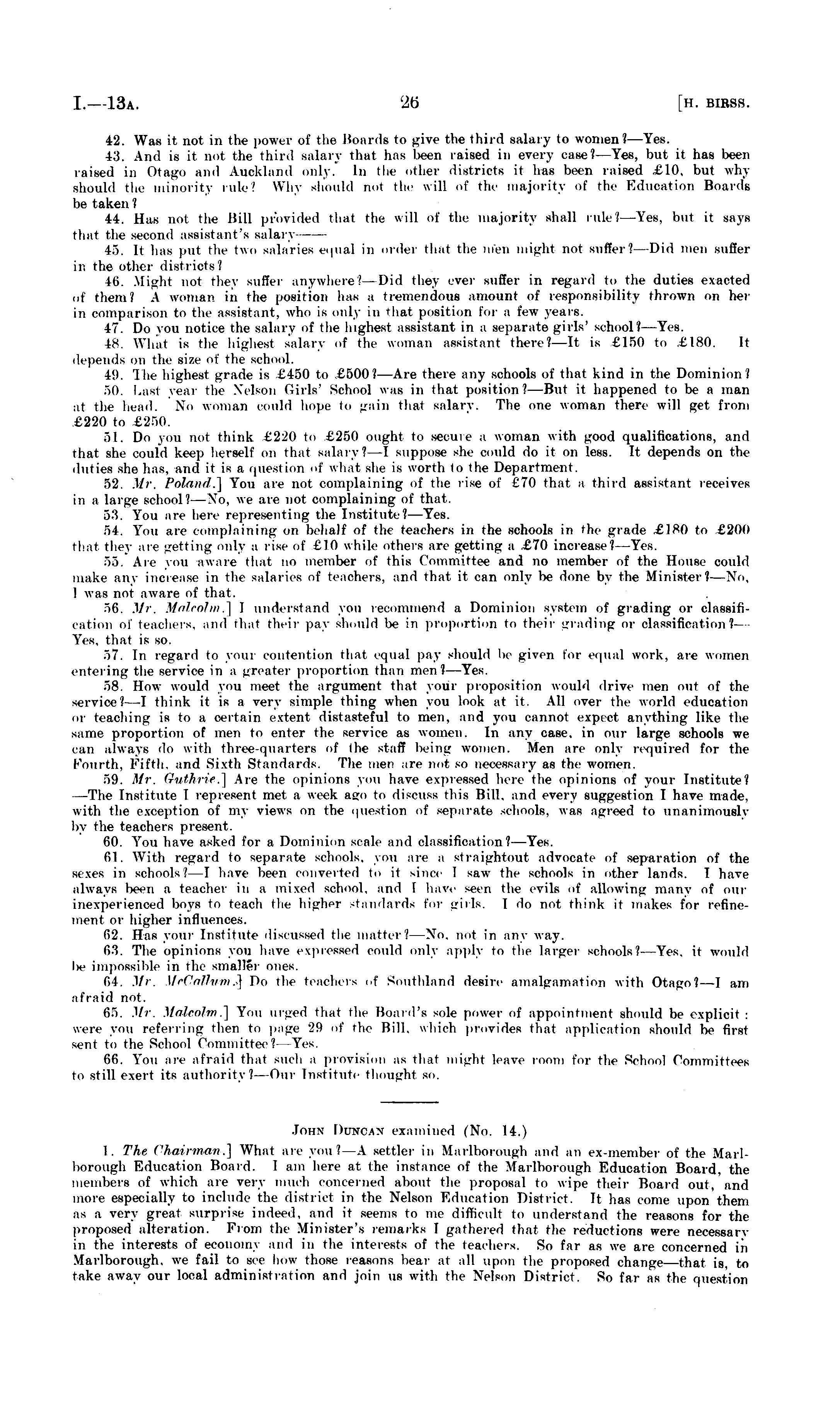 42. Was it not in the power of the Hoards to give the third salary to women?— Yes. 13. And is it not the third salary that has been raised in every case?— Yes, but it has been raised in Otago and Auckland only. In the other districts it has been raised £10, but why should the minority rule' Why should not the will of the majority of the Education Boards be taken 1 44. Has not the Bill provided that the will of the majority shall ink'?— Yes, but it says that the second assistant's salary 45. It has put the two salaries equal in order that the men might not suffer?—Did men suffer in the other districts? 46. Might not they suffer anywhere.' -Did they ever suffer in regard to the duties exacted of them.' A woman in the position has a tremendous amount of responsibility thrown on her in comparison to the assistant, who is only in that position for a few years. 47. Do you notice the salary of the highest assistant in a separate girls' school?—Yes. 18. What is the highest salary of the woman assistant there?—It is £150 to £180. It depends on the size of the school. 49. 'I he highest grade is £450 to £500?— Are then- any schools of that kind in the Dominion? oil. Last year the Nelson Girls' School was in that position?— But it happened to be a man at the head. No woman could hope to gain that salary. The one woman there will get from £220 to £250. 51. Do \ou not think £220 to £250 ought to secure a woman with good qualifications, and that she could keep herself on that salary?—I suppose she could do it on less. It depends on the duties she has. and it is a question of what she is worth to the Department. 52. .1//. Poland.] You are not complaining of the rise of £70 that a third assistant receives in a large school?— No. we are not complaining of that. 53. You are here representing the Institute?— Yes. 54. You are complaining on behalf of the teachers in the schools in the grade £180 to £200 that they are getting only a rise of £10 while others are getting a £70 increase?—Yes. 55. Ari' you aware that no member of this Committee and no member of the House could make any increase in the salaries of teachers, and that it can only be done by the Minister?—No, I was not aware of that. 56. Mr. Malcolm.] I understand you recommend a Dominion system of grading or classification of teachers, and that their pay should be in proportion to their grading or classification?-Y<-s. that is so. 57. In regard to mm contention that equal pay should be given for equal work, are women entering the service in a greater proportion than men?— Yes. 58. How would you meet the argument that your proposition would drive men out of the service?—I think it is a very simple thing when you look at it. All over the world education or teaching is to a certain extent distasteful to men, and you cannot expect anything like the same proportion of men to enter the service as women. In any case, in our large schools we can always do with three-quarters of the staff being women. Men are only required for the Fourth, fifth, and Sixth Standards. The men are not so necessary as the women. 59. Mr. Guthrie.] Are the opinions you have expressed lure the opinions of your Institute? —The Institute T represent met a week ago to discuss this Bill, and every suggestion I have made, with the exception of my views on the question of separate schools, was agreed to unanimously by the teachers present. 60. You have asked for a Dominion scale and classification?—Yes. 61. With regard to separate schools, you are a straightout advocate of separation of the sixes in schools.' I have been converted to it since I saw the schools in other lands. I have always been a teacher in a mixed school, and I have seen the evils of allowing many of our inexperienced boys to teach the higher standards for girls. I do not think it makes for refinement or higher influences. 62. Has your Institute discussed the matter?-—No. not in any way. 63. The opinions you have expressed could only apply to the larger schools?— Yes. it would lie impossible in the smaller ones. HI. Mr. Mi-Callnm .) Do the teachers of Southland desire amalgamation with Otago?--! am afraid not. 65. Mr. Malcolm.] You urged that the Hoard's sole power of appointment should be explicit : were you referring then to page 29 of the Hill, which provides that application should be first sent to the School Committee? Yes. 66. You are afraid that such a provision as that might leave room for the School Committees lo still exert its authority? Our Institute thought so.