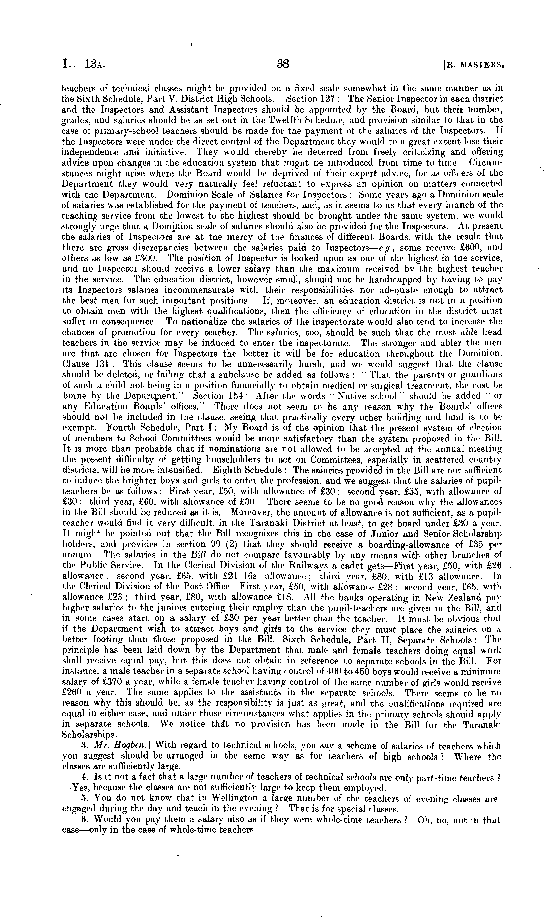 teachers of technical classes might be provided on a fixed scale somewhat in the same manner as in the Sixth Schedule, Part V, District High Schools. Section 127 : The Senior Inspector in each district and the Inspectors and Assistant Inspectors should be appointed by the Board, but their number, grades, and salaries should be as set out in the Twelfth Schedule, and provision similar to that in the case of primary-school teachers should be made Eor the paymeni of the salaries of the Inspectors. If the Inspectors were under the direct control of the Department they would to a great extent lose their independence and initiative. They would thereby be deterred from freely criticizing and offering advice upon changes in the education system that might be introduced from time to time. Circumstances might arise where the Board would be deprived of their expert advice, Eor as officers of the Department they would very naturally feel reluctant to express an opinion on matters connected with the Department. Dominion Scale of Salaries for Inspectors : Some years ago a Dominion scale of salaries was established for the payment of teachers, and, as it seems to us that every branch of the teaching service from the lowest to the highest should be brought under the same system, we would strongly urge that a Dominion scale of salaries should also be provided for the Inspectors. At present the salaries of Inspectors are at the mercy of the finances of different Boards, with the result that there are gross discrepancies between the salaries paid to Inspectors — e.g., some receive £600, and others as low as £300. The position of Inspector is looked upon as one of the highest in the service, and no Inspector should receive a lower salary than the maximum received by the highest teacher in the service. The education district, however small, should not be handicapped by having to pay its Inspectors salaries incommensurate with their responsibilities nor adequate enough to attract the best men for such important positions. If, moreover, an education district is not in a position to obtain men with the highest qualifications, then the efficiency of education in the district must suffer in consequence. To nationalize the salaries of the inspectorate would also tend to increase the chances of promotion for every teacher. The salaries, too, should be such that the most able head teachers in the service may be induced to enter the inspectorate. The stronger and abler the men are that are chosen for Inspectors the better it will be Eor education throughout the Dominion. Clause 131 : This clause seems to be unnecessarily harsh, and we would suggest that the clause should be deleted, or failing that a subclause be added as follows : " That the parents or guardians of such a child not being in a position financially to obtain medical or surgical treatment, the cost be borne by the Department." Section 154: After the words "Native school" should be added "or any Education Boards' offices." There does not seem to be any reason why the Boards' offices should not be included in the clause, seeing that practically every other building and laud is to be exempt. Fourth Schedule, Part I: My Board is of the opinion that the present system of election of members to School Committees would be more satisfactory than the system proposed in the Bill. It is more than probable that if nominations are not allowed to be accepted at the annual meeting the present difficulty of getting householders to act on Committees, especially in scattered country districts, will be more intensified. Eighth Schedule : The salaries provided in the Bill are not sufficient to induce the brighter boys and girls to enter the profession, and we suggest that the salaries of pupilteachers be as follows: First pear, £50, with allowance of £30; second year, £55. with allowance of £30 : third year, £60, with allowance of £30. There seems to be no good reason why the allowances in the Bill should be reduced as it is. Moreover, the amount of allowance is not sufficient, as a pupilteacher would find it very difficult, in the Taranaki District at least, to get board under £30 a year. It might be pointed out that the Bill recognizes this in the case of Junior and Senior Scholarship holders, and provides in section 99 (2) that they should receive a boarding-allowance of £35 per annum. The salaries in the Bill do not compare favourably by any means with other branches of the Public Service. In the Clerical Division of the Railways a cadet gets —First year, £50, with £26 allowance; second year, £65, with £2f 16s. allowance; "third year. £80, with £13 allowance. In the Clerical Division of the I'ost Office First year. £50, with allowance £28; second year, £65, with allowance £23; third year, £80, with allowance £18. All the banks operating in New Zealand pay higher salaries to the juniors entering their employ than the pupil-teachers are given in the Bill, and in some cases start on a salary of £30 per year better than the teacher. It must be obvious that if the Department wish to attract boys and girls to the service they must place the salaries on a better footing than those proposed in the Bill. Sixth Schedule, Part IT, Separate Schools: The principle has been laid down by the Department that male and female teachers doing equal work shall receive equal pay, but this does not obtain in reference to separate schools in the Bill. For instance, a male teacher in a separate school having control of 400 to 450 boys would receive a minimum salary of £370 a year, while a female teacher having control of the same number of girls would receive £260 a year. The same applies to the assistants in the separate schools. There seems to be no reason why this should be, as the responsibility is just as great, and the qualifications required are equal in either case, and under those circumstances what applies in the primary schools should apply in separate 
