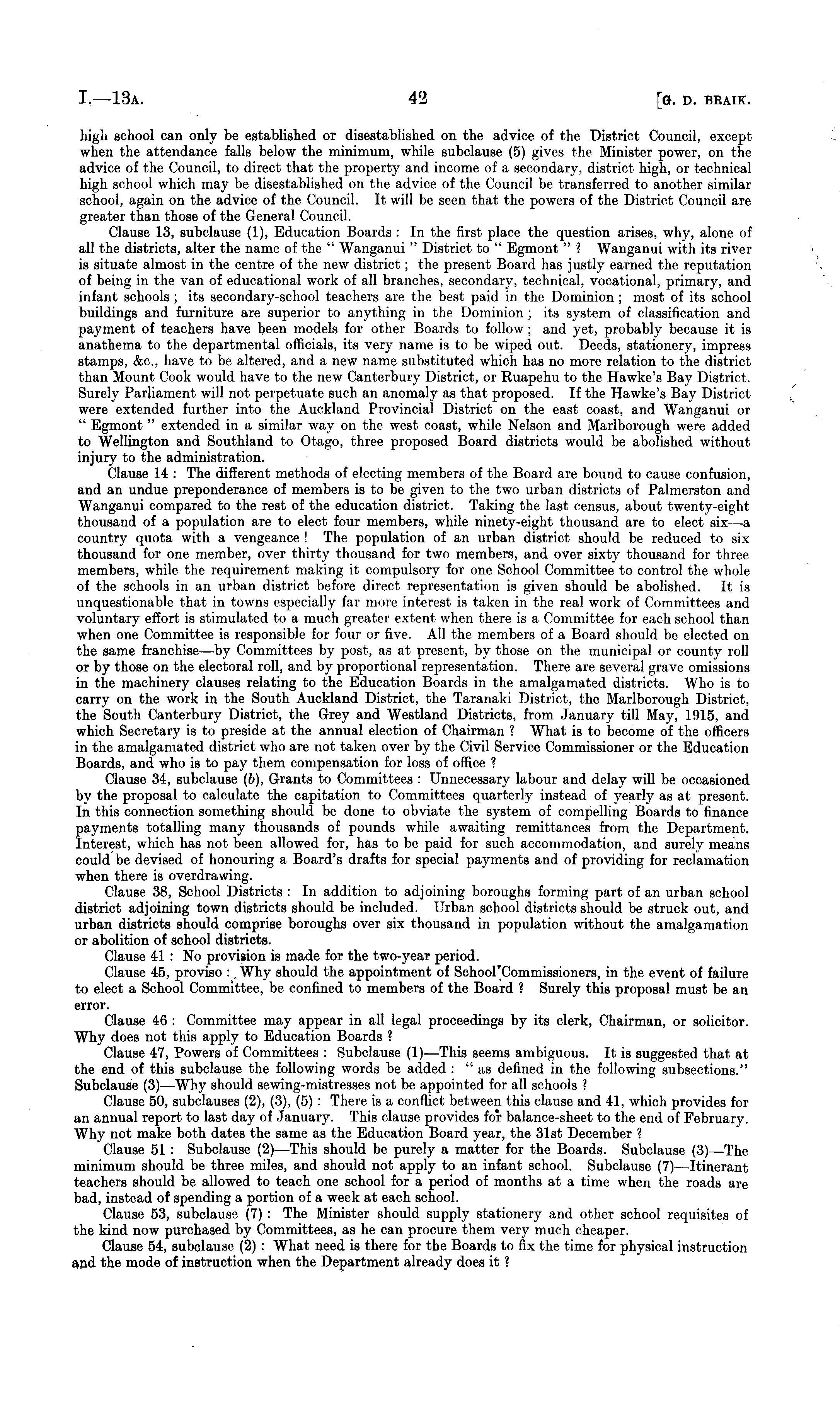 high school can only be established or disestablished on the advice of the District Council, except when the attendance falls below the minimum, while subclause (5) gives the Minister power, on the advice of the Council, to direct that the property and income of a secondary, district high, or technical high school which may be disestablished on the advice of the Council be transferred to another similar school, again on the advice of the Council. It will be seen that the powers of the District Council are greater than those of the General Council. Clause 13, subclause (1), Education Boards : In the first place the question arises, why, alone of all the districts, alter the name of the " Wanganui " District to " Egmont " ? Wanganui with its river is situate almost in the centre of the new district; the present Board has justly earned the reputation of being in the van of educational work of all branches, secondary, technical, vocational, primary, and infant schools ; its secondary-school teachers are the best paid in the Dominion ; most of its school buildings and furniture are superior to anything in the Dominion ; its system of classification and payment of teachers have been models for other Boards to follow; and yet, probably because it is anathema to the departmental officials, its very name is to be wiped out. Deeds, stationery, impress stamps, &c, have to be altered, and a new name substituted which has no more relation to the district than Mount Cook would have to the new Canterbury District, or Ruapehu to the Hawke's Bay District. Surely Parliament will not perpetuate such an anomaly as that proposed. If the Hawke's Bay District were extended further into the Auckland Provincial District on the east coast, and Wanganui or " Egmont " extended in a similar way on the west coast, while Nelson and Marlborough were added to Wellington and Southland to Otago, three proposed Board districts would be abolished without injury to the administration. Clause 14 : The different methods of electing members of the Board are bound to cause confusion, and an undue preponderance of members is to be given to the two urban districts of Palmerston and Wanganui compared to the rest of the education district. Taking the last census, about twenty-eight thousand of a population are to elect four members, while ninety-eight thousand are to elect six—a country quota with a vengeance ! The population of an urban district should be reduced to six thousand for one member, over thirty thousand for two members, and over sixty thousand for three members, while the requirement making it compulsory for one School Committee to control the whole of the schools in an urban district before direct representation is given should be abolished. It is unquestionable that in towns especially far more interest is taken in the real work of Committees and voluntary effort is stimulated to a much greater extent when there is a Committee for each school than when one Committee is responsible for four or five. All the members of a Board should be elected on the same franchise—by Committees by post, as at present, by those on the municipal or county roll or by those on the electoral roll, and by proportional representation. There are several grave omissions in the machinery clauses relating to the Education Boards in the amalgamated districts. Who is to carry on the work in the South Auckland District, the Taranaki District, the Marlborough District, the South Canterbury District, the Grey and Westland Districts, from January till May, 1915, and which Secretary is to preside at the annual election of Chairman ? What is to become of the officers in the amalgamated district who are not taken over by the Civil Service Commissioner or the Education Boards, and who is to pay them compensation for loss of office ? Clause 34, subclause (6), Grants to Committees : Unnecessary labour and delay will be occasioned by the proposal to calculate the capitation to Committees quarterly instead of yearly as at present. In this connection something should be done to obviate the system of compelling Boards to finance payments totalling many thousands of pounds while awaiting remittances from the Department. Interest, which has not been allowed for, has to be paid for such accommodation, and surely means could be devised of honouring a Board's drafts for special payments and of providing for reclamation when there is overdrawing. Clause 38, School Districts : In addition to adjoining boroughs forming part of an urban school district adjoining town districts should be included. Urban school districts should be struck out, and urban districts should comprise boroughs over six thousand in population without the amalgamation or abolition of school districts. Clause 41 : No provision is made for the two-year period. Clause 45, proviso : „ Why should the appointment of SchoorCommissioners, in the event of failure to elect a School Committee, be confined to members of the Board ? Surely this proposal must be an error. Clause 46 : Committee may appear in all legal proceedings by its clerk, Chairman, or solicitor. Why does not this apply to Education Boards ? Clause 47, Powers of Committees : Subclause (1) —This seems ambiguous. It is suggested that at the end of this subclause the following words be added : " as defined in the following subsections." Subclause (3) —Why should sewing-mistresses not be appointed for all schools ? Clause 50, subclauses (2), (3), (5) : There is a conflict between this clause and 41, which provides for an annual report to last day of January. This clause provides for balance-sheet to the end of February. Why not make both dates the same as the Education Board year, the 31st December ? Clause 51 : Subclause (2) —This should be purely a matter for the Boards. Subclause (3) —The minimum should be three miles, and should not apply to an infant school. Subclause (7) —Itinerant teachers should be allowed to teach one sc