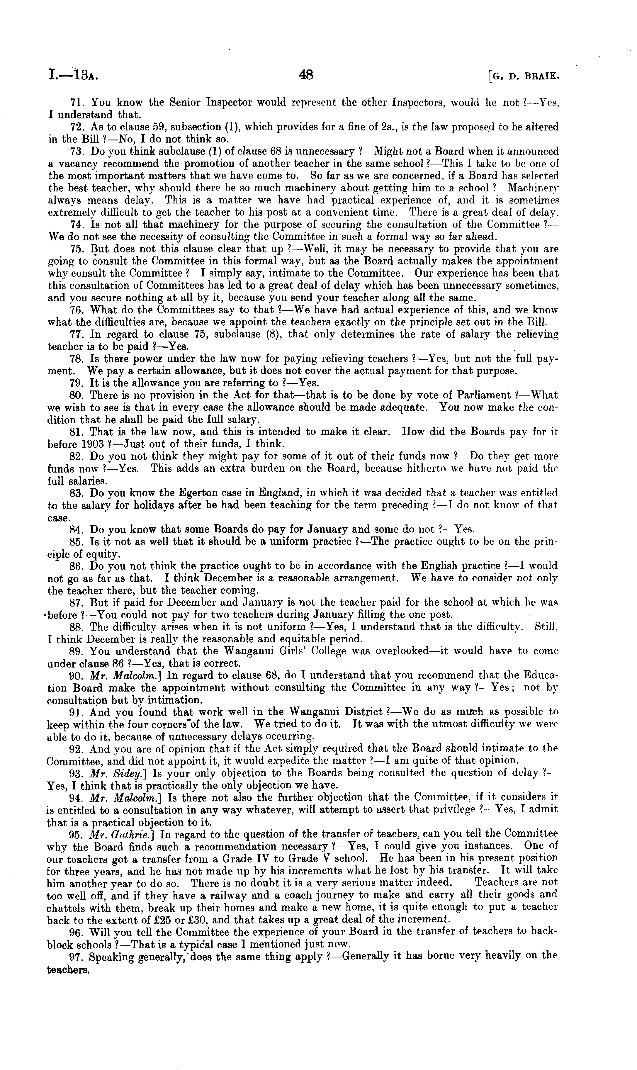 71. You know the Senior Inspector would represent the other Inspectors, would he not ?- Yes. I understand that. 72. As to clause 59, subsection (1), which provides for a fine of 25., is the law proposed to be altered in the Bill ? —No, I do not think so. 73. Do you think subclause (1) of clause 68 is unnecessary ? Might not a Board when it announced a vacancy recommend the promotion of another teacher in the same school ? —This I take to be one of the most important matters that we have come to. So far as we are concerned, if a Board has selected the best teacher, why should there be so much machinery about getting him to a school ? Machil always means delay. This is a matter we have had practical experience of, and it is sometimes extremely difficult to get the teacher to his post at a convenient time. There is a great deal of delay. 74. Is not all that machinery for the purpose of securing the consultation of the Committee ? — We do not see the necessity of consulting the Committee in such a formal way so far ahead. 75. But does not this clause clear that up ?—Well, it may be necessary to provide that you are going to consult the Committee in this formal way, but as the Board actually makes the appointment why consult the Committee ? I simply say, intimate to the Committee. Our experience has been that this consultation of Committees has led to a great deal of delay which has been unnecessary sometimes, and you secure nothing at all by it, because you send your teacher along all the same. 76. What do the Committees say to that ? —We have had actual experience of this, and we know what the difficulties are, because we appoint the teachers exactly on the principle set out in the Bill. 77. In regard to clause 75, subclause (8), that only determines the rate of salary the relieving teacher is to be paid ?—Yes. 78. Is there power under the law now for paying relieving teachers ? —Yes, but not the full payment. We pay a certain allowance, but it does not cover the actual payment for that purpose. 79. It is the allowance you are referring to ?—Yes. 80. There is no provision in the Act for that —that is to be done by vote of Parliament ? —What we wish to see is that in every case the allowance should be made adequate. You now make the condition that he shall be paid the full salary. 81. That is the law now, and this is intended to make it clear. How did the Boards pay lor it before 1903 ?—Just out of their funds, I think. 82. Do you not think they might pay for some of it out of their funds now ? Do they get more funds now ?—Yes. This adds an extra burden on the Board, because hitherto we have not paid the lull salaries. 83. Do you know the Egerton case in England, in which it was decided that a teacher was entitled to the salary for holidays after he had been teaching for the term preceding ?—I do not know of thai case. 84. Do you know that some Boards do pay for January and some do not ? —Yes. 85. Is it not as well that it should be a uniform practice ?—The practice ought to be on the principle of equity. 86. Do you not think the practice ought to be in accordance with the English practice ? —I would not go as far as that. I think December is a reasonable arrangement. We have to consider not only the teacher there, but the teacher comins;. 87. But if paid for December and January is not the teacher paid for the school at which he was ■before ? —You could not pay for two teachers during January filling the one post. 88. The difficulty arises when it is not uniform ? —Yes, I understand that is the difficulty. Still. I think December is really the reasonable and equitable period. 89. You understand that the Wanganui Girls' College was overlooked— it would have to come under clause 86 ?—Yes, that is correct. 90. Mr. Malcolm.] In regard to clause 68, do I understand that you recommend that the Education Board make the appointment without consulting the Committee in any way ?— Yes ; not by consultation but by intimation. 91. And you found that work well in the Wanganui District?—We do as much as possible to keep within the four corners'of the law. We tried to do it. It was with the utmost difficulty we were able to do it, because of unnecessary delays occurring. 92. And you are of opinion that if the Act simply required that the Board should intimate to the Committee, and did not appoint it, it would expedite the matter ? —I am quite of that opinion. 93. Mr. Sidey.] Is your only objection to the Boards being consulted the question of delay ?— Yes, I think that is practically the only objection we have. 94. Mr. Malcolm.] Is there not also the further objection that the Committee, if it considers it is entitled to a consultation in any way whatever, will attempt to assert that privilege '. Yes, I admit that is a practical objection to it. 95. Mr. Guthrie.] In regard to the question of the transfer of teachers, can you tell the Committee why the Board finds such a recommendation necessary? —Yes, I could give you instances. One of our teachers got a transfer from a Grade IV to Grade V school. He has been in his present position for three years, and he has not made up by his increments what he lost by his transfer. It will take him another year to do so. There is no doubt it is a very serious matter indeed. Teachers are not too well off, and if they have a railway and a coach journey to make and carry all their goods and chattels with them, break up their homes and make a new home, it is quite enough to put a teacher back to the extent of £25 or £30, and that takes up a great deal of the increment. 96. Will you tell the Committee the experience of your Board in the transfer of teachers to backblock schools ?—That is a typical case I mentioned just now. 97. Speaking generally," does the same thing apply ?—Generally it has borne very heavily on the teachers.
