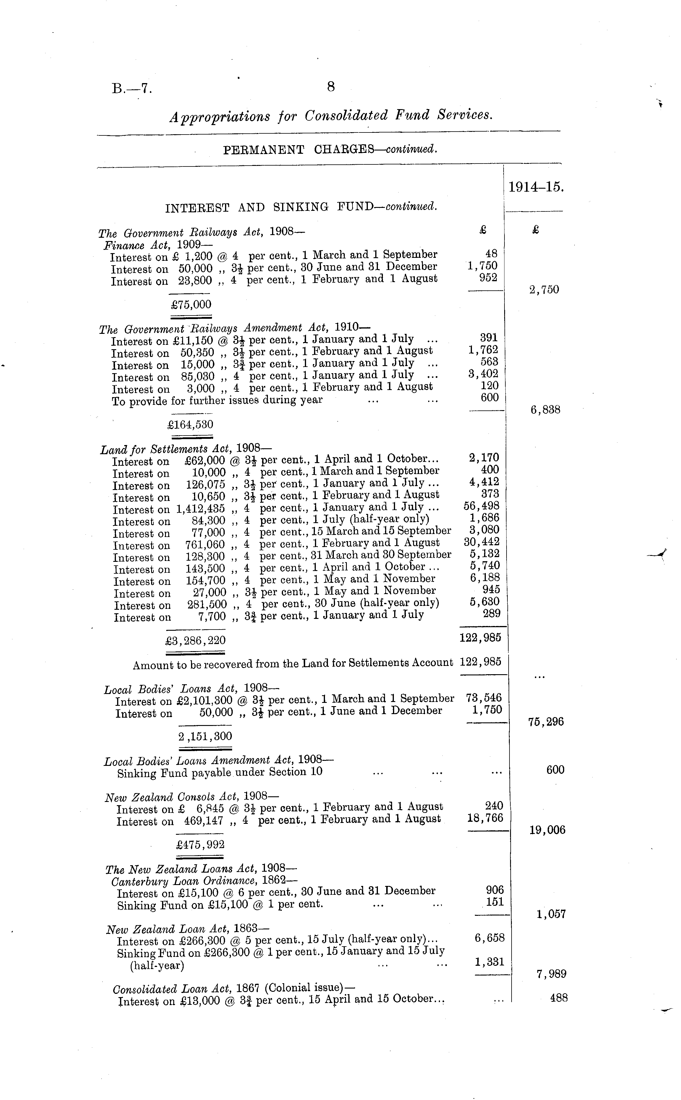 1914-15. INTEREST AND SINKING FUND— continued. The Government Railways Act, 1908 — £ Finance Act, 1909— Interest on £ 1,200 @ 4 per cent., 1 March and 1 September 48 Interest on 50,000 „ 3J per cent., 30 June and 31 December 1,750 Interest on 23,800 ,, 4 per cent., 1 February and 1 August 952 £ 2,750 £75,000 The Government Railways Amendment Act, 1910— Interest on £11,150 @ 3| per cent., 1 January and 1 July ... 391 Interest on 50,350 „ 3| per cent., 1 February and 1 August 1,762 Interest on 15,000 ,, 3f per cent., 1 January and 1 July ... 563 Interest on 85,030 „ 4 per cent., 1 January and 1 July ... 3,402 Interest on 3,000 „ 4 per cent., 1 February and 1 August 120 To provide for further issues during year ... ... 600 6,838 £164,530 Land for Settlements Act, 1908— Interest on £62,000 @ 3$ per cent., 1 April and 1 October... 2,170 Interest on 10,000 „ 4 per cent., 1 March and 1 September 400 Interest on 126,075 „ 3£ per cent., 1 January and 1 July ... 4,412 Interest on 10,650 ,, 3£ per cent., 1 February and 1 August 373 Interest on 1,412,435 „ 4 per cent., 1 January and 1 July ... 56,498 Interest on 84,300 ,, 4 per cent., 1 July (half-year only) 1,686 Interest on 77,000 ,, 4 per cent., 15 March and 15 September 3,080 Interest on 761,060 „ 4 per cent., 1 February and 1 August 30,442 Interest on 128,300 ,, 4 per cent., 31 March and 30 September 5,132 Interest on 143,500 ,, 4 per cent., 1 April and 1 October ... 5,740 Interest on 154,700 ,, 4 per cent., 1 May and 1 November 6,188 Interest on 27,000 ,, 3J per cent., 1 May and 1 November 945 Interest on 281,500 ,, 4 per cent., 30 June (half-year only) 5,630 Interest on 7,700 „ 3f per cent., 1 January and 1 July 289 £3,286,220 122,985 Amount to be recovered from the Land for Settlements Account 122,985 Local Bodies' Loans Act, 1908 — Interest on £2,101,300 @ 3£ per cent., 1 March and 1 September 73,546 Interest on 50,000 „ 3£ per cent., 1 June and 1 December 1,750 75,296 2,151,300 Local Bodies Loans Amendment Act, 1908— Sinking Fund payable under Section 10 600 New Zealand Consols Act, 1908— Interest on £ 6,845 @ 3£ per cent., 1 February and 1 August 240 Interest on 469,147 „ 4 per cent., 1 February and 1 August 18,766 19,006 £475,992 The New Zealand Loans Act, 1908 — Canterbury Loan Ordinance, 1862— Interest on £15,100 @ 6 per cent., 30 June and 31 December 906 Sinking Fund on £15,100 @ 1 per cent. ... ... 151 1,057 New Zealand Loan Act, 1863 — Interest on £266,300 @ 5 per cent., 15 July (half-year only)... 6,658 Sinking Fund on £266,300 @ 1 per cent., 15 January and 15 July (half-year) ••• •■• 1,331 7,989 Consolidated Loan Act, 1867 (Colonial issue) — Interest on £13,000 @ 3f per cent., 15 April and 15 October... ... 488