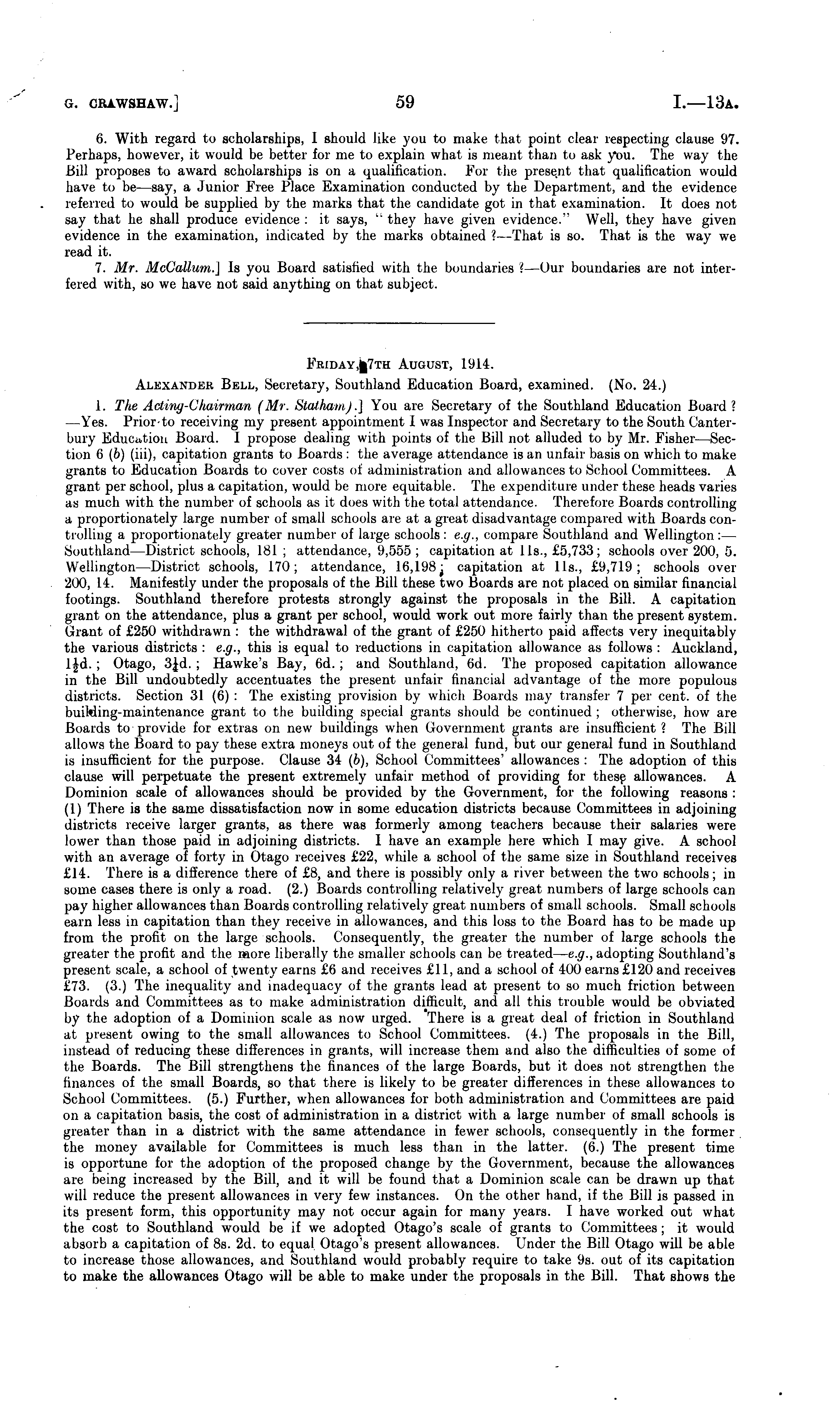 Friday,|7th August, 1914. Alexander Bell, Secretary, Southland Education Board, examined. (No. 24.) 1. The Acting-Chairman (Mr. Statham).] You are Secretary of the Southland Education Board ? —Yes. Prior-to receiving my present appointment I was Inspector and Secretary to the South Canterbury Education Board. I propose dealing with points of the Bill not alluded to by Mr. Fisher—SecI ion (i (6) (iii), capitation grants to Boards : the average attendance is an unfair basis on which to make grants to Education Boards to cover costs of administration and allowances to School Committees. A grant per school, plus a capitation, would be more equitable. The expenditure under these heads varies as much with the number of schools as it does with the total attendance. Therefore Boards controlling a proportionately large number of small schools are at a great disadvantage compared with Boards controlling a proportionately greater number of large schools: e.g., compare Southland and Wellington:— Southland—District schools, 181 ; attendance, 9,555 ; capitation at lis., £5,733; schools over 200, 5. Wellington —District schools, 170; attendance, 16,198 j capitation at lis., £9,719; schools over 200, 14. Manifestly under the proposals of the Bill these two Boards are not placed on similar financial footings. Southland therefore protests strongly against the proposals in the Bill. A capitation grant on the attendance, plus a grant per school, would work out more fairly than the present system. Grant of £250 withdrawn : the withdrawal of the grant of £250 hitherto paid affects very inequitably the various districts : e.g., this is equal to reductions in capitation allowance as follows : Auckland, lid.; Otago, 2>\A.\ Hawke's Bay, 6d. ; and Southland, fid. The proposed capitation allowance in the Bill undoubtedly accentuates the present unfair financial advantage of the more populous districts. Section 31 (6) : The existing provision by which Boards may transfer 7 per cent, of the building-maintenance grant to the building special grants should be continued ; otherwise, how are Boards to provide for extras on new buildings when Government grants are insufficient ? The Bill allows the Board to pay these extra moneys out of the general fund, but our general fund in Southland is insufficient for the purpose. Clause 34 (6), School Committees' allowances : The adoption of this clause will perpetuate the present extremely unfair method of providing for these allowances. A Dominion scale of allowances should be provided by the Government, for the following reasons: (I) There is the same dissatisfaction now in some education districts because Committees in adjoining districts receive larger giants, as there was formerly among teachers because their salaries were lower than those paid in adjoining districts. 1 have an example here which I may give. A school with an average of forty in Otago receives £22, while a school of the same size in Southland receives £14. There is a difference there of £8, and there is possibly only a river between the two schools; in some cases there is only a road. (2.) Boards controlling relatively great numbers of large schools can pay higher allowances than Boards controlling relatively great numbers of small schools. Small schools earn less in capitation than they receive in allowances, and this loss to the Board has to be made up from the profit on the large schools. Consequently, the greater the number of large schools the greater the profit and the more liberally the smaller schools can be treated— e.g., adopting Southland's present scale, a school of twenty earns £6 and receives £11, and a school of 400 earns £120 and receives £73. (3.) The inequality and inadequacy of the grants lead at present to so much friction between Boards and Committees as to make administration difficult, and all this trouble would be obviated by the adoption of a Dominion scale as now urged. There is a great deal of friction in Southland al present owing to the small allowances to School Committees. (4.) The proposals in the Bill, instead of reducing these differences in grants, will increase them and also the difficulties of some of the Boards. The Bill strengthens the finances of the large Boards, but it does not strengthen the finances of the small Boards, so that there is likely to be greater differences in these allowances to School Committees. (5.) Further, when allowances for both administration and Committees are paid on a capitation basis, the cost of administration in a district with a large number of small schools is greater than in a district with the same attendance in fewer schools, consequently in the former the money available for Committees is much less than in the latter. (6.) The present time is opportune for the adoption of the proposed change by the Government, because the allowances are being increased by the Bill, and it will be found that a Dominion scale can be drawn up that will reduce the present allowances in very few instances. On the other hand, if the Bill is passed in its present form, this opportunity may not occur again for many years. 1 have worked out what the cost to Southland would be if we adopted Otago's scale of grants to Committees; it would absorb a capitation of Bs. 2d. to equal Otago's present allowances. Under the Bill Otago will be able to increase those allowances, and Southland would probably require to take 9s. out of its capitation to make the allowances Otago will be able to make under the proposals in the Bill. That shows the