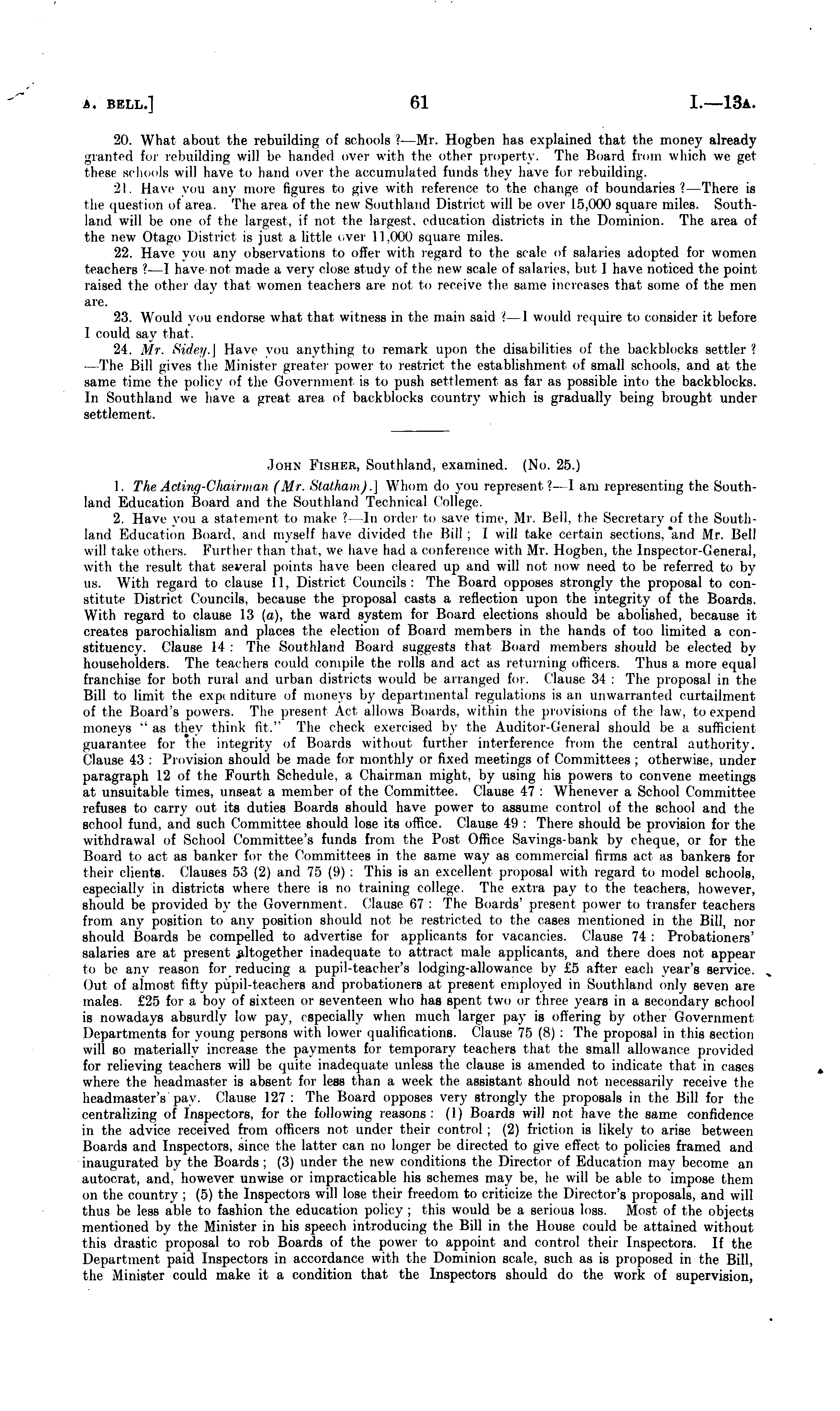 John Fisher, Southland, examined. (No. 25.) 1. The Acting-Chairman (Mr. Statham).] Whom do you represent?—l am representing the Southland Education Board and the .Southland Technical College. 2. Have you a statement to make ?—ln order to save lime. .Air. Bell, the Secretary of the Southland Education Board, and myself have divided the Bill ; I will take certain sections, and Mr. Bell will take others. Further than that, we have had a conference with Mr. Hogben, the Inspector-General, with the result that several points have been cleared up and will nut now need to be referred to by us. With regard to clause 11, District Councils: The Board opposes strongly the proposal to constitute District Councils, because the proposal casts a reflection upon tin 1 integrity of the Boards. With regard to clause 13 (a), the wanl system for Board elections should be abolished, because it creates parochialism and places the election of Board members in the hands of ton limited a constituency. Clause II : The Southland Board suggests that Board members should lie elected by householders. The teachers could compile the rolls atid act as returning officers. Thus a more equal franchise for both rural and urban districts would be arranged for. Clause 34 : The proposal in the Bill to limit the expenditure of moneys l>v departmental regulations is an unwarranted curtailment of the Board's powers. The present Act allows Boards, within the provisions of the law, to expend moneys "as they think fit." The check exercised by the Auditor-General should be a sufficient guarantee for the integrity of Boards without further interference from the central authority. Clause 43 : Provision should be made for monthly or fixed meetings of Committees ; otherwise, under paragraph 12 of the Fourth Schedule, a Chairman might, by using his powers to convene meetings at unsuitable times, unseat a member (if the Committee. Clause 47 : Whenever a School Committee refuses to carry out its duties Boards should have power to assume control of the scl 1 and the school fund, and such Committee should lose its office. Clause 49 : There should be provision for the withdrawal of School Committee's funds from the Post Office Savings-bank by cheque, or for the Board to act as banker for the Committees in the same way as commercial firms act as bankers for their clients. Clauses 53 (2) and 75 (9) : This is an excellent proposal with regard to model schools, especially in districts where there is no training college. The extra pay to the teachers, however, should lie provided by the Government. Clause 67 : The Boards' present power to transfer teachers from any position to any position should not be restricted to the cases mentioned in the Bill, nor should Boards be compelled to advertise for applicants for vacancies. Clause 74 : Probationers' salaries are at present altogether inadequate to attract male applicants, and there does not appear to be any reason for reducing a pupil-teacher's lodging-allowance by £6 after each year's service. Out of almost fifty pupil-teachers and probationers at present employed in Southland only seven are males. £25 for a boy of sixteen or seventeen who has spent two or three years in a secondary school is nowadays absurdly low pay, especially when much larger pay is offering by other Government Departments for young persons with lower qualifications. Clause 75 (8) : The proposal in this section will so materially increase the payments for temporary teachers that the small allowance provided for relieving teachers will be quite inadequate unless the clause is amended to indicate that in cases where the headmaster is absent for less than a week the assistant should not necessarily receive the headmaster's'pay. Clause 127: The Board opposes very strongly the proposals in the Bill for the centralizing of Inspectors, for the following reasons: (1) Boards will not have the same confidence in the advice received from officers not under their control ; (2) friction is likely to arise between Boards and Inspectors, since the latter can no longer be directed to give effect to policies framed and inaugurated by Ihe Boards; (3) under the new conditions the Director of Education may become an autocrat, and. however unwise or impracticable his schemes may be, he will be able to impose them on the country : (5) the Inspectors will lose their freedom to criticize the Director's proposals, and will thus be less able to fashion the education policy ; this would be a serious loss. Most of the objects mentioned by the Minister in his speech introducing the Bill in the House could be attained without this drastic proposal to rob Boards of the power to appoint and control their Inspectors. If the Department paid Inspectors in accordance with the Dominion scale, such as is proposed in the Bill, the Minister could make it a condition that the Inspectors should do the work of supervision,