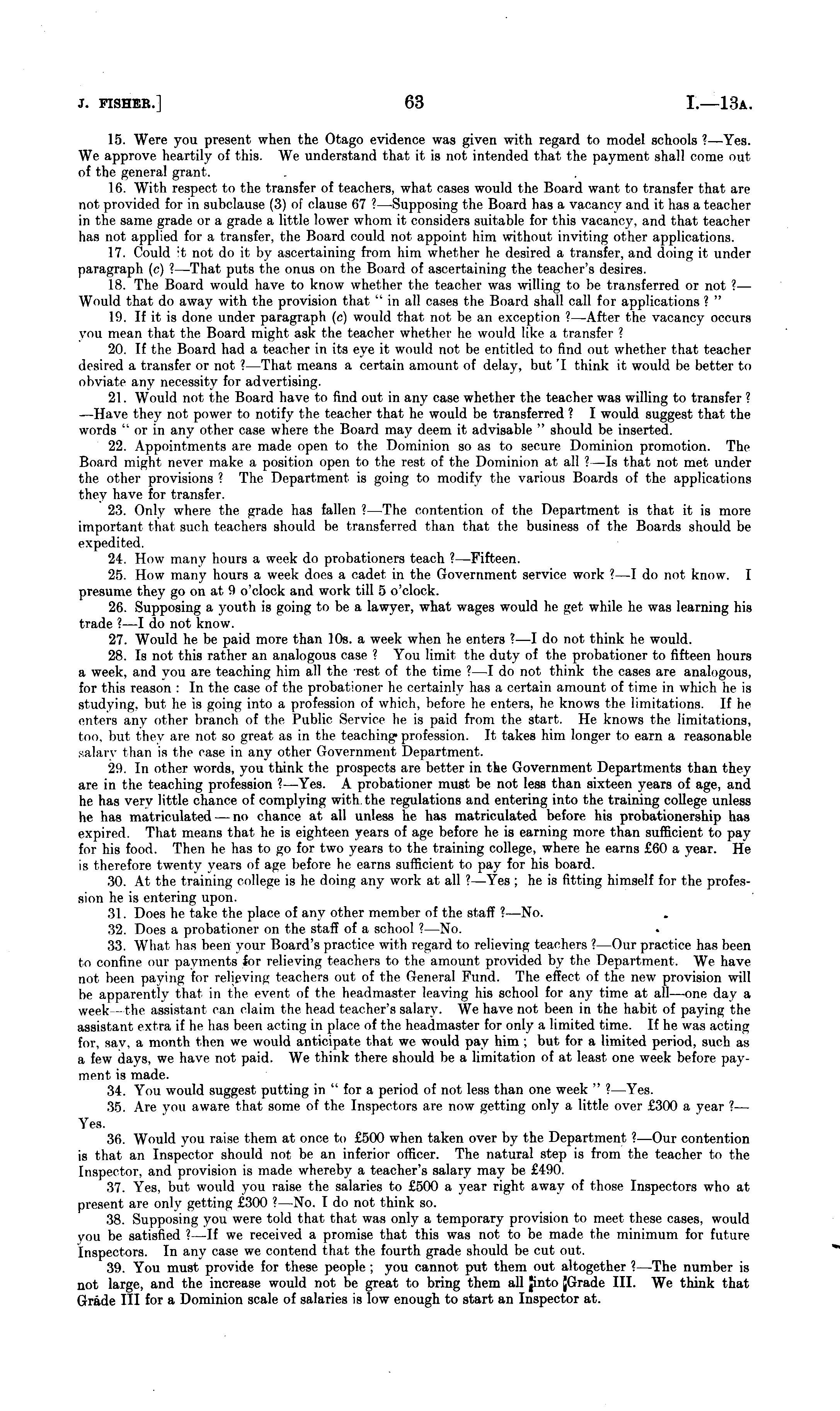 15. Were you present when the Otago evidence was given with regard to model schools ?—Yes. We approve heartily of this. We understand that it is not intended that the payment shall come out of the general grant. 16. With respect to the transfer of teachers, what cases would the Board want to transfer that are not provided for in subclause (3) of clause 67 ?—Supposing the Board has a vacancy and it has a teacher in the same grade or a grade a little lower whom it considers suitable for this vacancy, and that teacher has not applied for a transfer, the Board could not appoint him without inviting other applications. 17. Could it not do it by ascertaining from him whether he desired a transfer, and doing it tinder paragraph (c) ?—That puts the onus on the Board of ascertaining the teacher's desires. 18. The Board would have to know whether the teacher was willing to be transferred or not ?— Would that do away with the provision that " in all cases the Board shall call for applications ? " 19. If it is done under paragraph (c) would that not be an exception ?—After the vacancy occurs you mean that the Board might ask the teacher whether he would like a transfer '. 20. If the Board had a teacher in its eye it would not be entitled to find out whether that teacher desired a transfer or not ?—That means a certain amount of delay, but T think it would be better to obviate any necessity for advertising. 21. Would not the Board have to find out in any case whether the teacher was willing to transfer ? —Have they not power to notify the teacher that he would be transferred ? I would suggest that the words " or in any other case where the Board may deem it advisable " should be inserted. 22. Appointments are made open to the Dominion so as to secure Dominion promotion. The Board might never make a position open to the rest of the Dominion at all ?—ls that not met under the other provisions ? The Department is going to modify the various Boards of the applications they have for transfer. 23. Only where the grade has fallen ?—The contention of the Department is that it is more important that such teachers should be transferred than that the business of the Boards should be expedited. 24. How many hours a week do probationers teach ?—Fifteen. 25. How many hours a week does a cadet in the Government service work ?—I do not know. I presume they go on at 9 o'clock and work till 5 o'clock. 26. Supposing a youth is going to be a lawyer, what wages would he get while he was learning his trade ?—I do not know. 27. Would he be paid more than 10s. a week when he enters ?—I do not think he would. 28. Is not this rather an analogous case ? You limit the duty of the probationer to fifteen hours a week, and you are teaching him all the rest of the time ?—I do not think the cases are analogous, for this reason : In the case of the probationer he certainly has a certain amount of time in which he is studying, but he is going into a profession of which, before he enters, he knows the limitations. If he enters any other branch of the Public Service he is paid from the start. He knows the limitations, too, but they are not so great as in the teaching-profession. It takes him longer to earn a reasonable salary than is the case in any other Government Department. 29. In other words, you think the prospects are better in the Government Departments than they are in the teaching profession ?—Yes. A probationer must be not less than sixteen years of age, and he has very little chance of complying with the regulations and entering into the training college unless he has matriculated —no chance at all unless he has matriculated before his probationership has expired. That means that he is eighteen years of age before he is earning more than sufficient to pay for his food. Then he has to go for two years to the training college, where he earns £60 a year. He is therefore twenty years of age before he earns sufficient to pay for his board. 30. At the training college is he doing any work at all ?—Yes ; he is fitting himself for the profession he is entering upon. 31. Does he take the place of any other member of the staff ?—No. 32. Does a probationer on the staff of a school ?—No. 33. What has been your Board's practice with regard to relieving teachers ? —Our practice has been to confine our payments for relieving teachers to the amount provided by the Department. We have not been paving for relieving teachers out of the General Fund. The effect of the new provision will be apparently that in the event of the headmaster leaving his school for any time at all—one day a week the assistant can claim the head teacher's salary. We have not been in the habit of paying the assistant extra if he has been acting in place of the headmaster for only a limited time. If he was acting for. say, a month then we would anticipate that we would pay him : but for a limited period, such as a few days, we have not paid. We think there should be a limitation of at least one week before payment is made. 34. You would suggest putting in " for a period of not less than one week " ?—Yes. 35. Are you aware that some of the Inspectors are now getting only a little over £300 a year ?— Yes. 36. Would you raise them at once to £500 when taken over by the Department ?—Our contention is that an Inspector should not be an inferior officer. The natural step is from the teacher to the Inspector, and provision is made whereby a teacher's salary may be £490. 37. Yes, but would you raise the salaries to £500 a year right away of those Inspectors who at present are only getting £300 ?—No. I do not think so. 38. Supposing you were told that that was only a temporary provision to meet these cases, would you be satisfied ?—lf we received a promise that this was not to he made the minimum for future Inspectors. In any case we contend that the fourth grade should be cut out. 39. You must provide for these people ; y