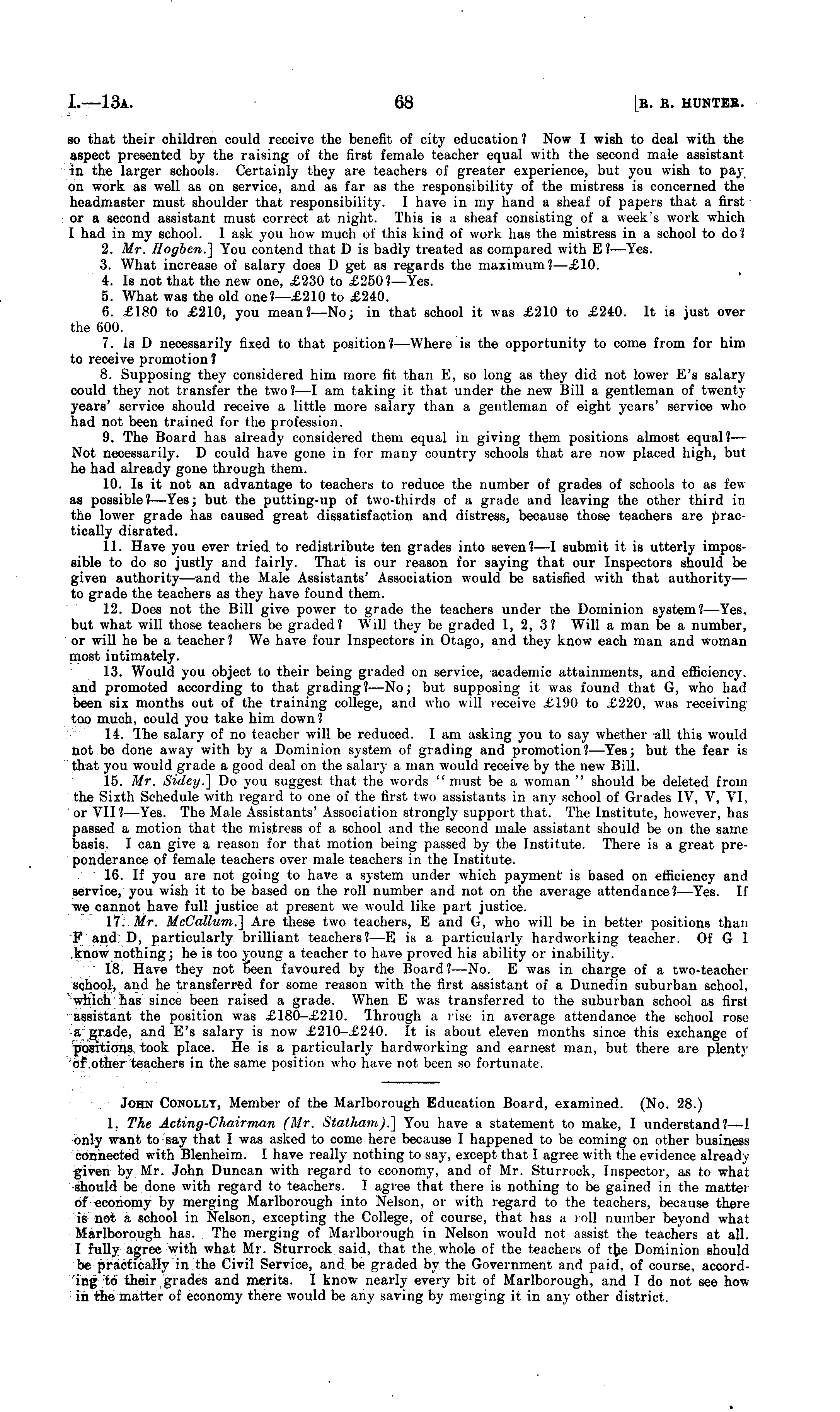 so that their children could receive the benefit of city education ? Now I wish to deal with the aspect presented by the raising of the first female teacher equal with the second male assistant in the larger schools. Certainly they are teachers of greater experience, but you wish to pay on work as well as on service, and as far as the responsibility of the mistress is concerned the headmaster must shoulder that responsibility. I have in my hand a sheaf of papers that a first or a second assistant must correct at night. This is a sheaf consisting of a week's work which I had in my school. I ask you how much of this kind of work has the mistress in a school to do? 2. Mr. Hogben.] You contend that D is badly treated as compared with E?—Yes. 3. What increase of salary does D get as regards the maximum?—£lo. 4. Is not that the new one, £230 to £250?— Yes. 5. What was the old one?—£2lo to £240. 6. £180 to £210, you mean?—No; in that school it was £210 to £240. It is just over the 600. 7. Is D necessarily fixed to that position?—Where is the opportunity to come from for him to receive promotion 1 8. Supposing they considered him more fit than E, so long as they did not lower E's salary could they not transfer the two?—l am taking it that under the new Bill a gentleman of twenty years' service should receive a little more salary than a gentleman of eight years' service who had not been trained for the profession. 9. The Board has already considered them equal in giving them positions almost equal? — Not necessarily. D could have gone in for many country schools that are now placed high, but he had already gone through them. 10. Is it not an advantage to teachers to reduce the number of grades of schools to as few as possible?— Yes; but the putting-up of two-thirds of a grade and leaving the other third in the lower grade has caused great dissatisfaction and distress, because those teachers are practically disrated. 11. Have you ever tried to redistribute ten grades into seven ?—I submit it is utterly impossible to do so justly and fairly. That is our reason for saying that our Inspectors should be given authority—and the Male Assistants' Association would be satisfied with that authority — to grade the teachers as they have found them. 12. Does not the Bill give power to grade the teachers under the Dominion system?-—Yes, but what will those teachers be graded? Will they be graded 1, 2, 3? Will a man be a number, or will he be a teacher ? We have four Inspectors in Otago, and they know each man and woman most intimately. 13. Would you object to their being graded on service, academic attainments, and efficiency, and promoted according to that grading?—No; but supposing it was found that G, who had been six months out of the training college, and who will receive £190 to £220, was receiving too much, could you take him down? 14. The salary of no teacher will be reduced. lam asking you to say whether all this would not be done away with by a Dominion system of grading and promotion?— Yes; but the fear is that you would grade a good deal on the salary a man would receive by the new Bill. 15. Mr. Sidey.] Do you suggest that the words " must be a woman " should be deleted from the Sixth Schedule with regard to one of the first two assistants in any school of Grades IV, V, VI, or VII ?—Yes. The Male Assistants' Association strongly support that. The Institute, however, has passed a motion that the mistress of a school and the second male assistant should be on the same basis. I can give a reason for that motion being passed by the Institute. There is a great preponderance of female teachers over male teachers in the Institute. 16. If you are not going to have a system under which payment is based on efficiency and service, you wish it to be based on the roll number and not on the average attendance?—Yes. If we cannot have full justice at present we would like part justice. 17. Mr. McCallum.] Are these two teachers, E and G, who will be in better positions than F and D, particularly brilliant teachers?—E is a particularly hardworking teacher. Of G I know nothing; he is too young a teacher to have proved his ability or inability. 18. Have they not Seen favoured by the Board?— No. E was in charge of a two-teacher school, and he transferred for some reason with the first assistant of a Dunedin suburban school, which has since been raised a grade. When E was transferred to the suburban school as first assistant the position was £180-£2lO. Ihrough a rise in average attendance the school rose a grade, and E's salary is now £210-£240. It is about eleven months since this exchange of positions took place. He is a particularly hardworking and earnest man, but there are plenty of other teachers in the same position who have not been so fortunate.