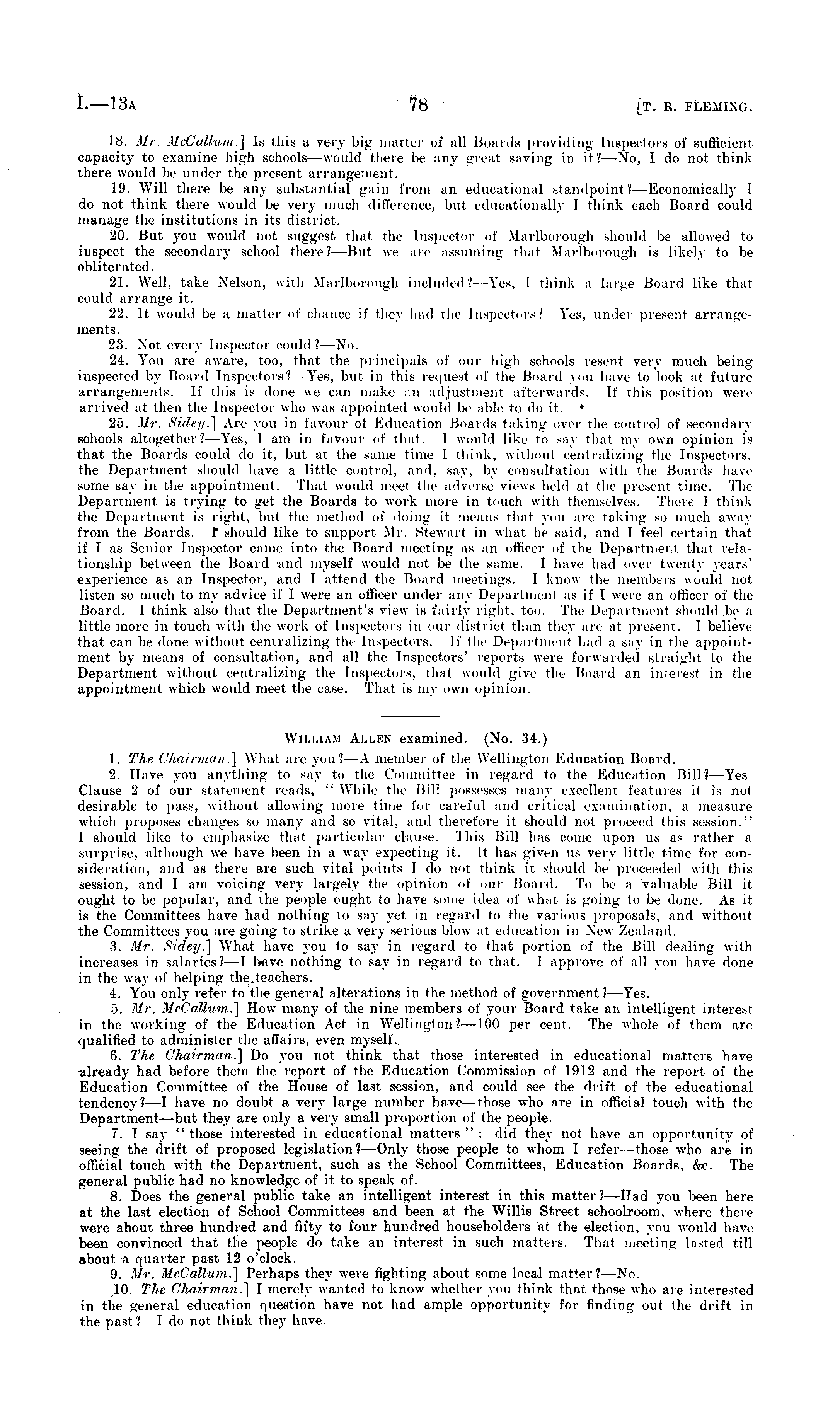 William Allen examined. (No. 34.) 1. The Chairman .] What are you < —A member of the Wellington Education Board. 2. Have you anything to say to the Committee in regard to the Education Bill? —Yes. Clause 2 of our statement -reads, " While the Bill possesses many excellent features it is not desirable to pass, without allowing more time for careful and critical examination, a measure which proposes changes so many and so vital, and therefore it should not proceed this session." I should like to emphasize that particular clause. This Bill has come upon us as rather a surprise, although we have been in a way expecting it. It has given us very little time for consideration, and as there are such vital points I do not think it should be proceeded with this session, and I am voicing very largely the opinion of our Board. To be a valuable Bill it ought to be popular, and the people ought to have some idea of what is going to be done. As it is the Committees have had nothing to say yet in regard to the various proposals, and without the Committees you are going to strike a very serious blow at education in New Zealand. 3. Mr. Sidey.] What have you to say in regard to that portion of the Bill dealing with increases in salaries? —I have nothing to say in regard to that. I approve of all you have done in the way of helping the„teachers. 4. You only refer to the general alterations in the method of government?— Yes. 5. Mr. McCallum.] How many of the nine members of your Board take an intelligent interest in the working of the Education Act in Wellington?—loo per cent. The whole of them are qualified to administer the affairs, even myself.. 6. The Chairman.] Do you not think that those interested in educational matters have already had before them the report of the Education Commission of 1912 and the report of the Education Committee of the House of last session, and could see the drift of the educational tendency?—l have no doubt a very large number hay who are in official touch with the Department —but they are only a very small proportion of the people. 7. I say " those interested in educational matters " : did they not have an opportunity of seeing the drift of proposed legislation?— Only those people to whom I refer—those who are in official touch with the Department, such as the School Committees, Education Boards, <fee. The general public had no knowledge of it to speak of. 8. Does the general public take an intelligent interest in this matter?— Had you been here at the last election of School Committees and been at the Willis Street schoolroom, where there were about three hundred and fifty to four hundred householders at the election, you would have been convinced that the people do take an interest in such matters. That meeting lasted till about a quarter past 12 o'clock. 9. Mr. McCallum.] Perhaps they were fighting about some local matter?— No. 10. The Chairman.] I merely wanted to know whether you think that those who are interested in the general education question have not had ample opportunity for finding out the drift in the past ?—I do not think they have.