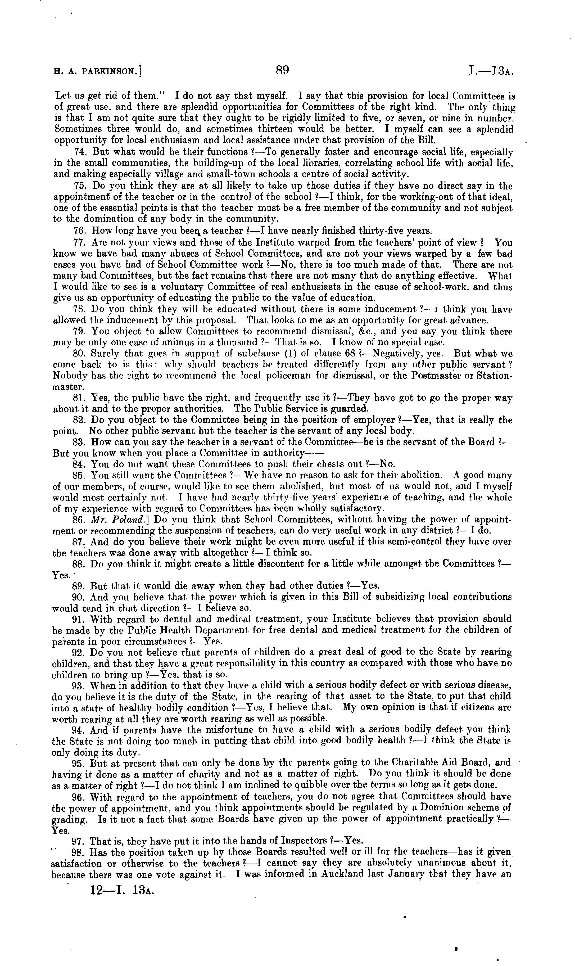 Let us get rid of them." Ido not say that myself. I say that this provision for local Committees is of great use, and there are splendid opportunities for Committees of the right kind. The only thing is that I am not quite sure that they ought to be rigidly limited to five, or seven, or nine in number. Sometimes three would do, and sometimes thirteen would be better. I myself can see a splendid opportunity for local enthusiasm and local assistance under that provision of the Bill. 74. But what would be their functions ?—To generally foster and encourage social life, especially in the small communities, the building-up of the local libraries, correlating school life with social life, and making especially village and small-town schools a centre of social activity. 75. Do you think they are at all likely to take up those duties if they have no direct say in the appointment of the teacher or in the control of the school ?—I think, for the working-out of that ideal, one of the essential points is that the teacher must be a free member of the community and not subject to the domination of any body in the community. 76. How long have you been, a teacher ? —I have nearly finished thirty-five years. 77. Are not your views and those of the Institute warped from the teachers' point of view ? You know we have had many abuses of School Committees, and are not your views warped by a few bad cases you have had of School Committee work ?—No, there is too much made of that. There are not many bad Committees, but the fact remains that there are not many that do anything effective. What I would like to see is a voluntary Committee of real enthusiasts in the cause of school-work, and thus give us an opportunity of educating the public to the value of education. 78. Do you think they will be educated without there is some inducement ? — i think you have allowed the inducement by this proposal. That looks to me as an opportunity for great advance. 79. You object to allow Committees to recommend dismissal, &c, and you say you think there may be only one case of animus in a thousand ?— That is so. I know of no special case. 80. Surely that goes in support of subclause (1) of clause 68 ? —Negatively, yes. But what we come back to is this : why should teachers be treated differently from any other public servant ? Nobody has the right to recommend the local policeman for dismissal, or the Postmaster or Stationmaster. 81. Yes, the public have the right, and frequently use it ?—They have got to go the proper way about it and to the proper authorities. The Public Service is guarded. 82. Do you object to the Committee being in the position of employer ?—Yes, that is really the point. No other public servant but the teacher is the servant of any local body. 83. How can you say the teacher is a servant of the Committee—he is the servant of the Board ?— But you know when you place a Committee in authority 84. You do not want these Committees to push their chests out ?—No. 85. You still want the Committees ?—We have no reason to ask for their abolition. A good many of our members, of course, would like to see them abolished, but most of us would not, and I myself would most certainly not. I have had nearly thirty-five years' experience of teaching, and the whole of my experience with regard to Committees has been wholly satisfactory. 86. Mr. Poland.] Do you think that School Committees, without having the power of appointment or recommending the suspension of teachers, can do very useful work in any district ?—I do. 87. And do you believe their work might be even more useful if this semi-control they have over the teachers was done away with altogether ?—I think so. 88. Do you think it might create a little discontent for a little while amongst the Committees ?— Yes. 89. But that it would die away when they had other duties ?—Yes. 90. And you believe that the power which is given in this Bill of subsidizing local contributions would tend in that direction ?—I believe so. 91. With regard to dental and medical treatment, your Institute believes that provision should be made by the Public Health Department for free dental and medical treatment for the children of parents in poor circumstances ?—Yes. 92. Do you not belieye that parents of children do a great deal of good to the State by rearing children, and that they have a great responsibility in this country as compared with those who have no children to bring up ?—Yes, that is so. 93. When in addition to that they have a child with a serious bodily defect or with serious disease, do you believe it is the duty of the State, in the rearing of that asset to the State, to put that child into a state of healthy bodily condition ? —Yes, I believe that. My own opinion is that if citizens are worth rearing at all they are worth rearing as well as possible. 94. And if parents have the misfortune to have a child with a serious bodily defect you think the State is not doing too much in putting that child into good bodily health ?—I think the State is only doing its duty. 95. But at present that can only be done by the parents going to the Charitable Aid Board, and having it done as a matter of charity and not as a matter of right. Do you think it should be done as a matter of right ?—I do not think lam inclined to quibble over the terms so long as it gets done. 96. With regard to the appointment of teachers, you do not agree that Committees should have the power of appointment, and you think appointments should be regulated by a Dominion scheme of grading. Is it not a fact that some Boards have given up the power of appointment practically ?— Yes. 97. That is, they have put it into the hands of Inspectors ?—Yes. 98. Has the position taken up by those Boards resulted well or ill for the teachers—has it given satisfaction or otherwise to the teachers ?—I cannot say they are absolutely unanimous about it, because there was one vot