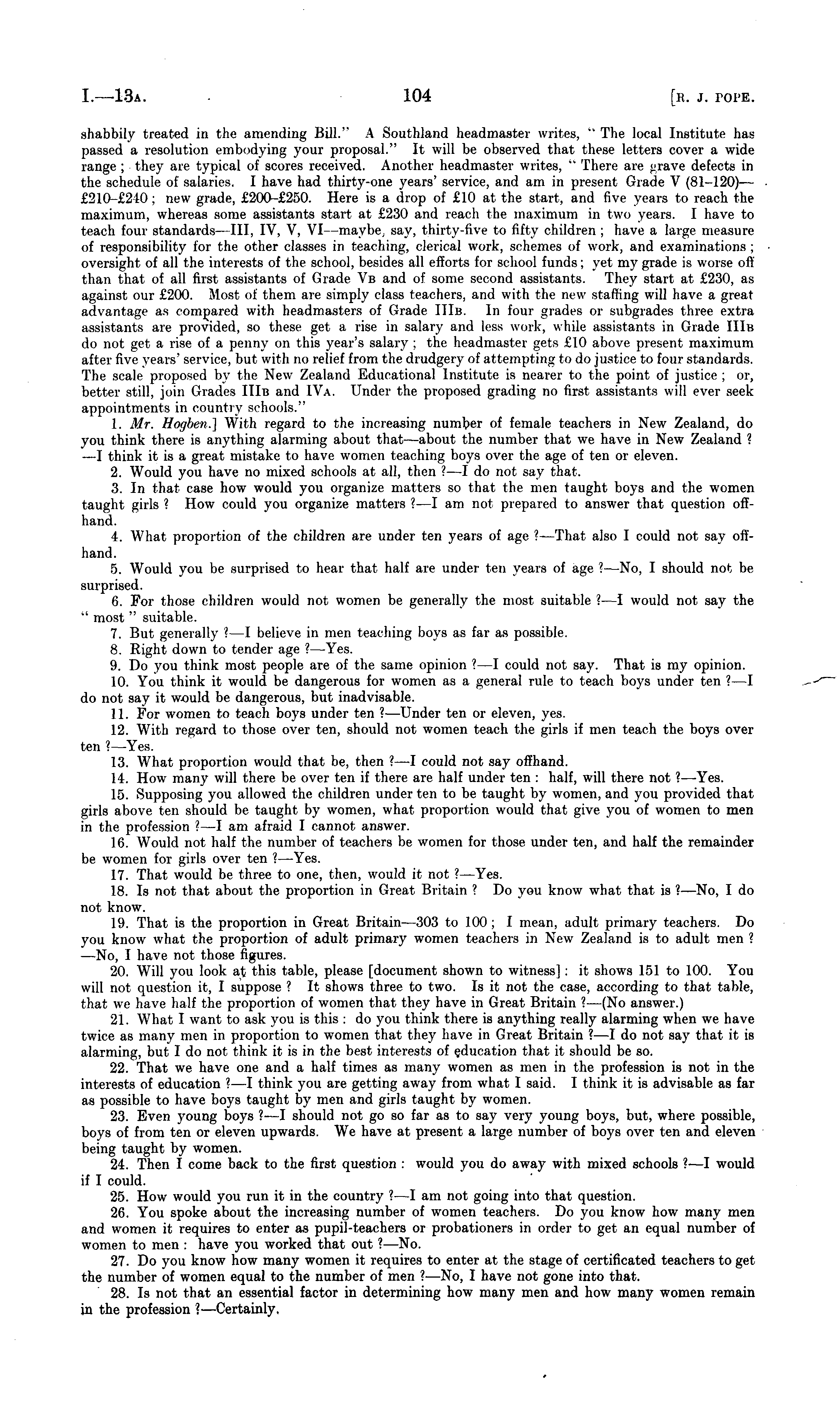 shabbily treated in the amending Bill." A Southland headmaster writes, " The local Institute has passed a resolution embodying your proposal." It will be observed that these letters cover a wide range ; they are typical of scores received. Another headmaster writes, " There are grave defects in the schedule of salaries. I have had thirty-one years' service, and am in present Grade V (81-120) — £210-£240 ; new grade, £200-£250. Here is a drop of £10 at the start, and five years to reach the maximum, whereas some assistants start at £230 and reach the maximum in two years. I have to teach four standards —111, IV, V, VI —maybe, say, thirty-five to fifty children ; have a large measure of responsibility for the other classes in teaching, clerical work, schemes of work, and examinations ; oversight of all the interests of the school, besides all efforts for school funds; yet my grade is worse off than that of all first assistants of Grade Vb and of some second assistants. They start at £230, as against our £200. Most of them are simply class teachers, and with the new staffing will have a great advantage as compared with headmasters of Grade lIIb. In four grades or subgrades three extra assistants are provided, so these get a rise in salary and less work, while assistants in Grade lIIb do not get a rise of a penny on this year's salary : the headmaster gets £10 above present maximum after five yea is' service, but with no relief from the drudgery of attempting to do justice to four standards. The scale proposed by the New Zealand Educational Institute is nearer to the point of justice; or, better still, join Grades lIIb and IVa. Under the proposed grading no first assistants will ever seek appointments in country schools." 1. Mr. Hogben.] With regard to the increasing number of female teachers in New Zealand, do you think there is anything alarming about that —about the number that we have in New Zealand ? —I think it is a great mistake to have women teaching boys over the age of ten or eleven. 2. Would you have no mixed schools at all, then ?—I do not say that. 3. In that case how would you organize matters so that the men taught boys and the women taught girls ? How could you organize matters ?—I am not prepared to answer that question offhand. 4. What proportion of the children are under ten years of age ?—That also I could not say offhand. 5. Would you be surprised to hear that half are under ten years of age ? —No, I should not be surprised. 6. For those children would not women be generally the most suitable ? —I would not say the " most " suitable. 7. But generally ? —I believe in men teaching boys as far as possible. 8. Right down to tender age ? —Yes. 9. Do you think most people are of the same opinion ?—I could not say. That is my opinion. 10. You think it would be dangerous for women as a general rule to teach boys under ten ? —I do not say it would be dangerous, but inadvisable. 11. For women to teach boys under ten ? —Under ten or eleven, yes. 12. With regard to those over ten, should not women teach the girls if men teach the boys over ten ? —Yes. 13. What proportion would that be, then ?—I could not say offhand. 14. How many will there be over ten if there are half under ten : half, will there not ?—Yes. 15. Supposing you allowed the children under ten to he taught by women, and you provided that girls above ten should be taught by women, what proportion would that give you of women to men in the profession ? —I am afraid I cannot answer. 16. Would not half the number of teachers be women for those under ten, and half the remainder be women for girls over ten ? —Yes. 17. That would be three to one, then, would it not ?—Yes. 18. Is not that about the proportion in Great Britain ? Do you know what that is ?—No, Ido not know. 19. That is the proportion in Great Britain —303 to 100; I mean, adult primary teachers. Do you know what the proportion of adult primary women teachers in New Zealand is to adult men ? —No, I have not those figures. 20. Will you look at this table, please [document shown to witness] : it shows 151 to 100. You will not question it, I suppose ? It shows three to two. Is it not the case, according to that table, that we have half the proportion of women that they have in Great Britain ?—(No answer.) 21. What I want to ask you is this : do you think there is anything really alarming when we have twice as many men in proportion to women that they have in Great Britain ? —I do not say that it is alarming, but I do not think it is in the best interests of education that it should be so. 22. That we have one and a half times as many women as men in the profession is not in the interests of education ?—I think you are getting away from what I said. I think it is advisable as far as possible to have boys taught by men and girls taught by women. 23. Even young boys ?—I should not go so far as to say very young boys, but, where possible, boys of from ten or eleven upwards. We have at present a large number of boys over ten and eleven being taught by women. 24. Then I come back to the first question : would you do away with mixed schools ?—I would if I could. 25. How would you run it in the country ?—I am not going into that question. 26. You spoke about the increasing number of women teachers. Do you know how many men and women it requires to enter as pupil-teachers or probationers in order to get an equal number of women to men : have you worked that out ? —No. 27. Do you know how many women it requires to enter at the stage of certificated teachers to get the number of women equal to the number of men ? —No, I have not gone into that. 28. Is not that an essential factor in determining how many men and how many women remain in the profession ? —Certainly.