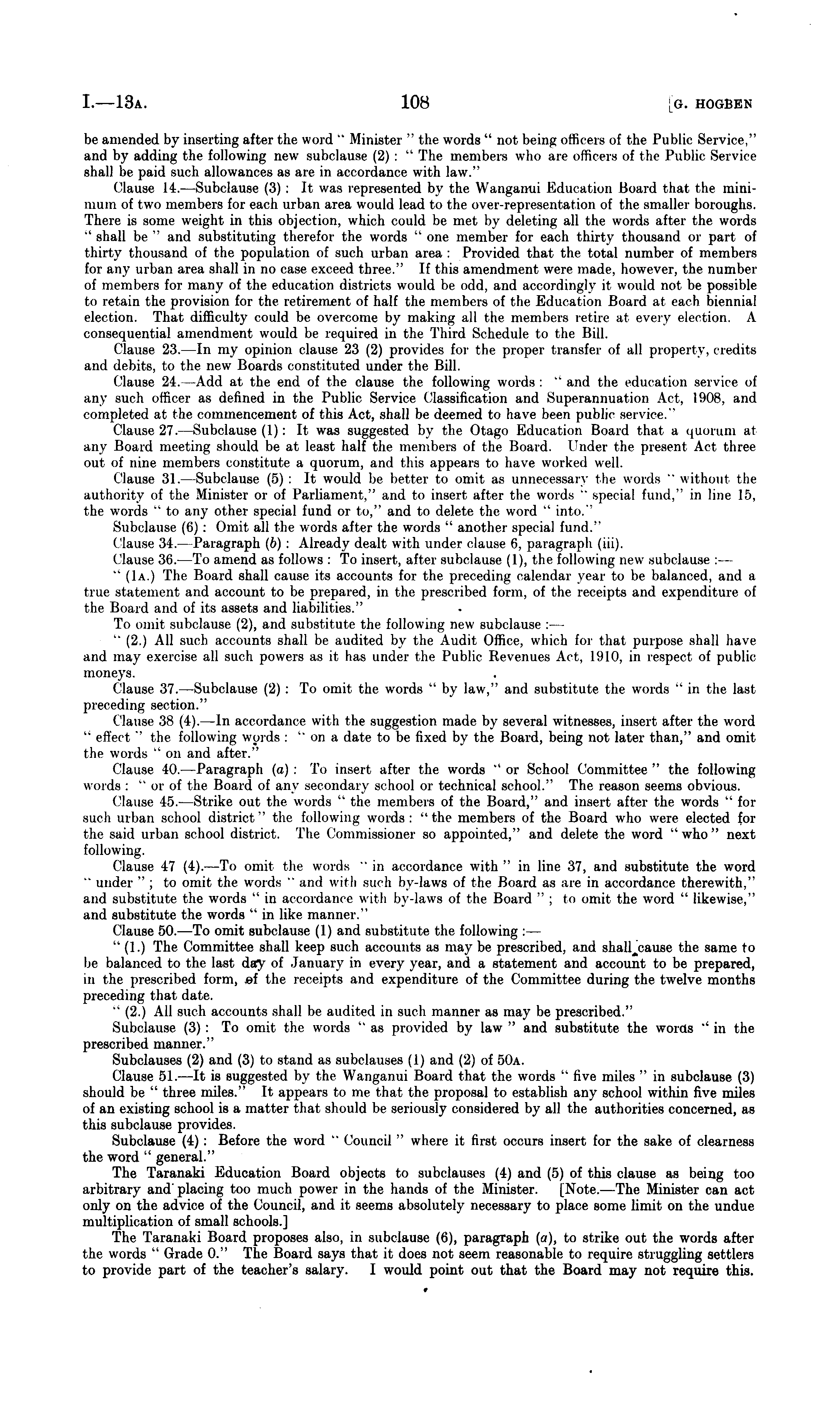 be amended by inserting after the word " Minister " the words " not being officers of the Public Service," and by adding the following new subclause (2) : " The members who are officers of the Public Service shall be paid such allowances as are in accordance with law." Clause 14.—Subclause (3) : It was represented by the Wangamii Education Board that the miniiiiiini of two members for each urban area would lead to the over-representation of the smaller boroughs. There is some weight in this objection, which could be met by deleting all the words after the words " shall be " and substituting therefor the words " one member for each thirty thousand or part of thirty thousand of the population of such urban area : Provided that the total number of members for any urban area shall in no case exceed three." If this amendment were made, however, the number of members for many of the education districts would be odd, and accordingly it would not be possible to retain the provision for the retirement of half the members of the Education Board at each biennial election. That difficulty could be overcome by making all the members retire at every election. A consequential amendment would be required in the Third Schedule to the Bill. Clause 23. —In my opinion clause 23 (2) provides for the proper transfer of all property, credits and debits, to the new Boards constituted under the Bill. Clause 24.—Add at the end of the clause the following words : " and the education service of any such officer as defined in the Public Service Classification and Superannuation Act, 1908, and completed at the commencement of this Act, shall be deemed to have been public service." Clause 27. —Subclause (1): It was suggested by the Otago Education Board that a quorum at any Board meeting should be at least half the members of the Board. Under the present Act three out of nine members constitute a quorum, and this appears to have worked well. Clause 31. —Subclause (5) : It would be better to omit as unnecessary the winds " without the authority of the Minister or of Parliament," and to insert after the words " special fund," in line 15, the words " to any other special fund or to," and to delete the word " into. Subclause (6) : Omit all the words after the words " another special fund." Clause 34. —Paragraph (6) : Already dealt with under clause 6, paragraph (iii). Clause 36. —To amend as follows :To insert, after subclause (I), the following new subclause :— *' (la.) The Board shall cause its accounts for the preceding calendar year to be balanced, and a true statement and account to be prepared, in the prescribed form, of the receipts and expenditure of the Board and of its assets and liabilities." To omit subclause (2), and substitute the following new subclause : —■ " (2.) All such accounts shall be audited by the Audit Office, which for that purpose shall have and may exercise all such powers as it has under the Public Revenues Act, 1910, in respect of public moneys. Clause 37. —Subclause (2) : To omit the words " by law," and substitute the words " in the last preceding section." Clause 38 (4). —In accordance with the suggestion made by several witnesses, insert after the word " effect " the following words : " on a date to be fixed by the Board, being not later than," and omit the words " on and after." Clause 40.—Paragraph (a) : To insert after the words " or School Committee " the following words :"or of the Board of any secondary school or technical school." The reason seems obvious. Clause 45. —Strike out the words " the members of the Board," and insert after the words " for such urban school district" the following words: "the members of the Board who were elected for the said urban school district. The Commissioner so appointed," and delete the word "who" next following. Clause 47 (4). —To omit the words " in accordance with " in line 37, and substitute the word " under " ; to omit the words " and with such by-laws of the Board as are in accordance therewith," and substitute the words " in accordance with by-laws of the Board " ; to omit the word " likewise," and substitute the words " in like manner.'' Clause 50. —To omit subclause (1) and substitute the following : — "(1.) The Committee shall keep such accounts as may be prescribed, and the same to be balanced to the last day of January in every year, and a statement and account to be prepared, in the prescribed form, ,ef the receipts and expenditure of the Committee during the twelve months preceding that date. "' (2.) All such accounts shall be audited in such manner as may be prescribed." Subclause (3) : To omit the words " as provided by law " and substitute the words "' in the prescribed manner." Subclauses (2) and (3) to stand as subclauses (1) and (2) of 50a. Clause 51. —It is suggested by the Wanganui Board that the words " five miles " in subclause (3) should be " three miles." It appears to me that the proposal to establish any school within five miles of an existing school is a matter that should be seriously considered by all the authorities concerned, as this subclause provides. Subclause (4) : Before the word " Council " where it first occurs insert for the sake of clearness the word " general." The Taranaki Education Board objects to subclauses (4) and (5) of this clause as being too arbitrary and' placing too much power in the hands of the Minister. [Note. —The Minister can act only on the advice of the Council, and it seems absolutely necessary to place some limit on the undue multiplication of small schools.] The Taranaki Board proposes also, in subclause (6), paragraph (a), to strike out the words after the words " Grade 0." The Board says that it does not seem reasonable to require struggling settlers to provide part of the teacher's salary. I would point out that the Board may not require this.