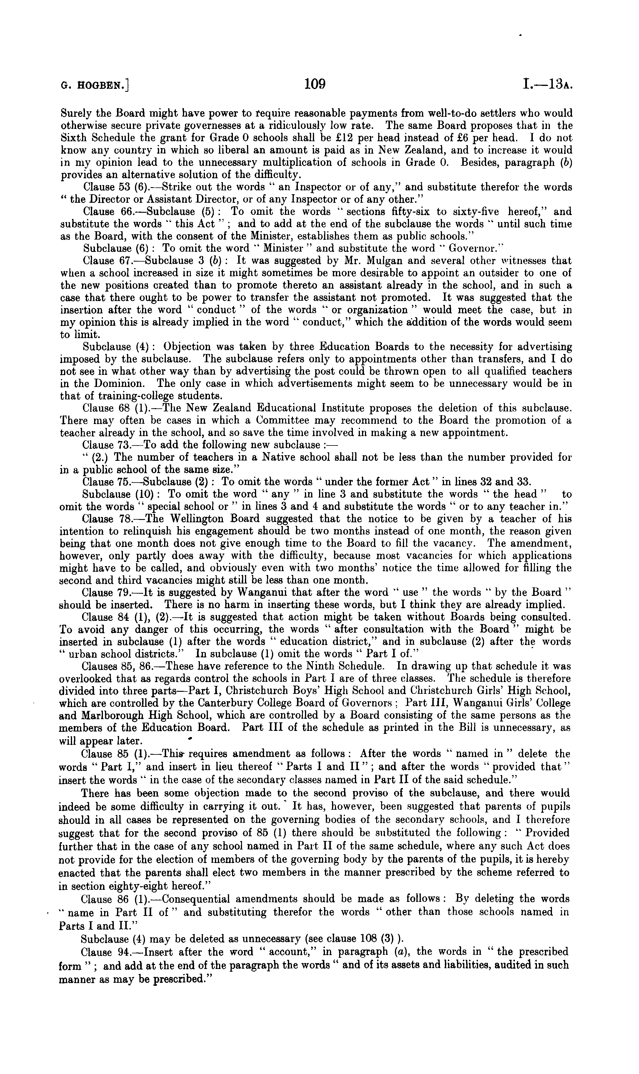 Surely the Board might have power to require reasonable payments from well-to-do settlers who would otherwise secure private governesses at a ridiculously low rate. The same Board proposes that in the Sixth Schedule the grant for Grade 0 schools shall be £12 per head instead of £6 per head. Ido not know any country in which so liberal an amount is paid as in New Zealand, and to increase it would in my opinion lead to the unnecessary multiplication of schools in Grade 0. Besides, paragraph (6) provides an alternative solution of the difficulty. Clause 53 (6). —Strike out the words " an Inspector or of any," and substitute therefor the words " the Director or Assistant Director, or of any Inspector or of any other." Clause 66. —Subclause (5) : To omit the words " sections fifty-six to sixty-five hereof," and substitute the words " this Act " ; and to add at the end of the subclause the words " until such time as the Board, with the consent of the Minister, establishes them as public schools." Subclause (6) : To omit the word " Minister " and substitute the word "' Governor."' Clause 67. —Subclause 3 (6) : It was suggested by Mr. Mulgan and several other witnesses that when a school increased in size it might sometimes be more desirable to appoint an outsider to one of the new positions created than to promote thereto an assistant already in the school, and in such a case that there ought to be power to transfer the assistant not promoted. It was suggested that the insertion after the word " conduct " of the words " or organization " would meet the case, but in my opinion this is already implied in the word " conduct," which the addition of the words would seem to limit. Subclause (4) : Objection was taken by three Education Boards to the necessity for advertising imposed by the subclause. The subclause refers only to appointments other than transfers, and Ido not see in what other way than by advertising the post could be thrown open to all qualified teachers in the Dominion. The only case in which advertisements might seem to be unnecessary would be in that of training-college students. ( lause 68 (1). —The New Zealand Educational Institute proposes the deletion of this subclause. There may often be cases in which a Committee may recommend to the Board the promotion of a teacher already in the school, and so save the time involved in making a new appointment. Clause 73. —To add the following new subclause :— " (2.) The number of teachers in a Native school shall not be less than the number provided for in a public school of the same size." Clause 75. —Subclause (2) :To omit the words " under the former Act" in lines 32 and 33. Subclause (10) :To omit the word " any "in line 3 and substitute the words " the head " to omit the words " special school or " in lines 3 and 4 and substitute the words '* or to any teacher in." Clause 78. —The Wellington Board suggested that the notice to be given by a teacher of his intention to relinquish his engagement should be two months instead of one month, the reason given being that one month does not give enough time to the Board to fill the vacancy. The amendment, however, only partly does away with the difficulty, because most vacancies for which applications might have to be called, and obviously even with two months' notice the time allowed for filling the second and third vacancies might still be less than one month. Clause 79. —It is suggested by Wanganui that after the word " use " the words " by the Board " should be inserted. There is no harm in inserting these words, but 1 think they are already implied. Clause 84 (1), (2). —-It is suggested that action might be taken without Boards being consulted. To avoid any danger of this occurring, the words " after consultation with the Board " might be inserted in subclause (1) after the words " education district,"' and in subclause (2) after the words " urban school districts." In subclause (1) omit the words " Part I of." Clauses 85, 86. —These have reference to the Ninth Schedule. In drawing up that schedule it was overlooked that as regards control the schools in Part I are of three classes. The schedule is therefore divided into three parts —Part I, Christchurch Boys' High School and Christchurch Girls' High School, which are controlled by the Canterbury College Board of Governors ; Part 111, Wanganui Girls' College and Marlborough High School, which are controlled by a Board consisting of the same persons as the members of the Education Board. Part 111 of the schedule as printed in the Bill is unnecessary, as will appear later. Clause 85 (1). —This- requires amendment as follows : After the words " named in " delete the words "Part I," and insert in lieu thereof "Parts 1 and II" ; and after the words "provided that" insert the words " in the case of the secondary classes named in Part II of the said schedule." There has been some objection made to the second proviso of the subclause, and there would indeed be some difficulty in carrying it out. It has, however, been suggested that parents of pupils should in all cases be represented on the governing bodies of the secondary schools, and I therefore suggest that for the second proviso of 85 (1) there should be substituted the following : " Provided further that in the case of any school named in Part II of the same schedule, where any such Act does not provide for the election of members of the governing body by the parents of the pupils, it is hereby enacted that the parents shall elect two members in the manner prescribed by the scheme referred to in section eighty-eight hereof." Clause 86 (1). —Consequential amendments should be made as follows: By deleting the words " name in Part II of " and substituting therefor the words " other than those schools named in Parts I and II." Subclause (4) may be deleted as unnecessary (see clause 108 (3) ). Clause 94.—Insert after the word " account," in paragraph (a), the words