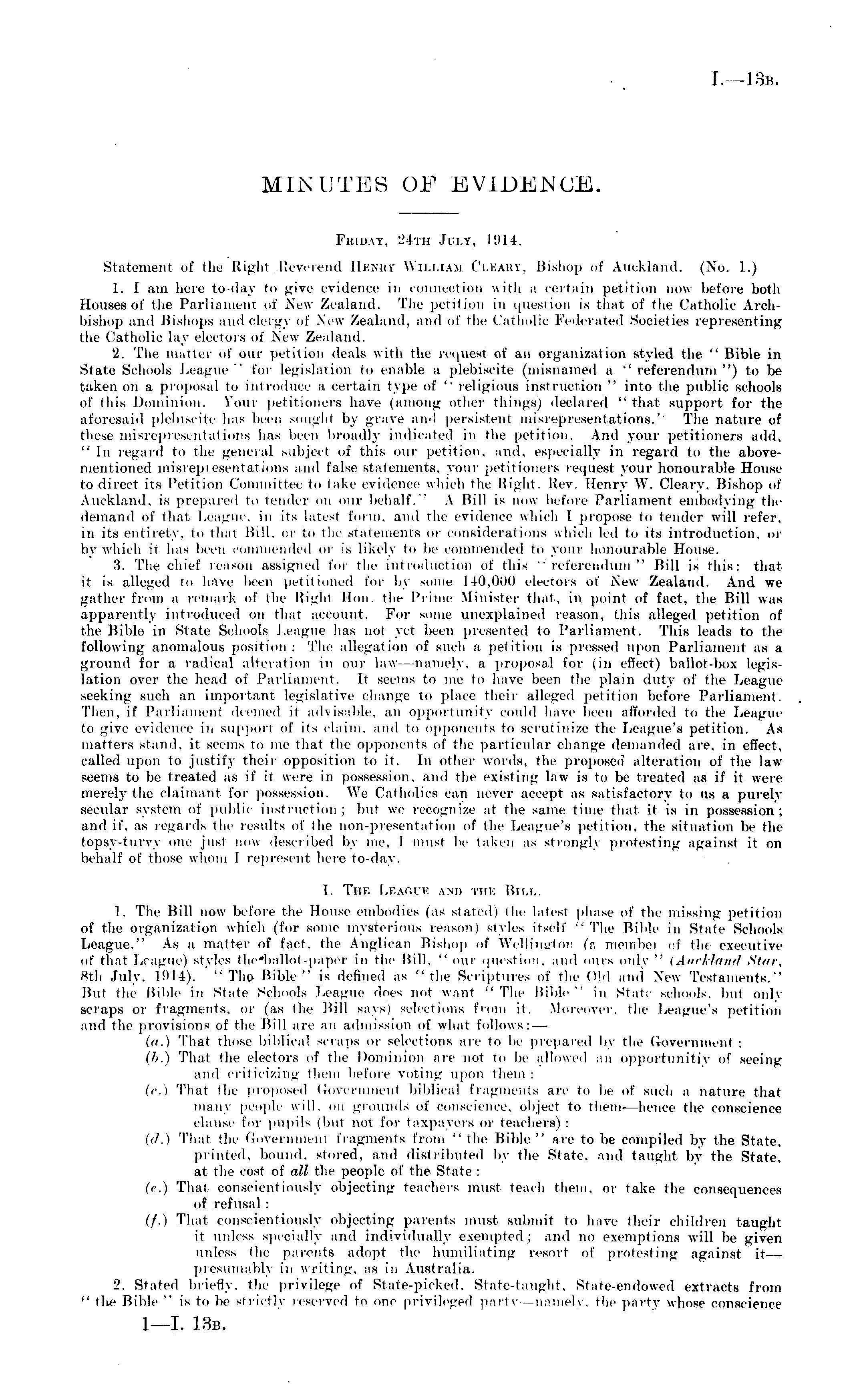MINUTES Otf EVIDENCE. Friday, 2!i ir .li i,v. 19] I. Statement of the Right Reverend Henri William Cleart, Bishop of Auckland. (No. 1.) 1. 1 am here to-day to give evidence in connection %\it J i a certain petition now before both Houses of tlic Parliament of New Zealand. The petition in question is that of the Catholic Archbishop and Bishops and clergy of New Zealand, and of the Catholic Federated Societies representing the Catholic lay electors of New Zealand. 2. The matter of our petition deals with the request of an organization styled the " Bible in Slate Schools League" for legislation to enable a plebiscite (misnamed a "referendum") to be taken on a proposal to introduce a certain type of " religious instruction " into the public schools of this Dominion. Four petitioners have (among other things) declared "that support for the aforesaid plebiscite has been sought by grave and persistent misrepresentations. , ' The nature of these misrepresentations has been broadly indicated in the petition. And your petitioners add, " In regard to the general subject of this our petition, and. especially in regard to the abovementioned misrepiesentations and false statements, your petitioners request your honourable House to direct its Petition Committee to take evidence which the Right. Rev. Henry W. Cleary, Bishop of Auckland, is prepared to tender on our behalf." A Bill is now before Parliament embodying the demand of that League, in its latest form, and the evidence which I propose to tender will refer, in its entirety, to that Hill, or to the statements or considerations which led to its introduction, or by which it has been commended or is likely to be commended to pour honourable House. 3. The chief reason assigned for the introduction of this "referendum" Bill is this: that it is alleged to have been petitioned for b\ some 140,000 electors of New Zealand. And we gather from a remark of the Right Hon. the Prune Minister that, in point of fact, the Bill was apparently introduced on that account. For some unexplained reason, this alleged petition of the Bible in State Schools League has nol yet bi ;nted to Parliament. This leads to ihc following anomalous position: The allegation of such a petition is pressed upon Parliament as a ground for a radical alteration in our law —namely, a proposal for (in effect) ballot-box legislation over the head of Parliament. It seems to me to have been the plain duty of the League seeking such an important legislative change to place their alleged petition before Parliament. Then, if Parliament deemed it advisable, an opportunity could have been afforded to the League to give evidence in support of its claim, and to opponents to scrutinize the League's petition. As matters stand, it seems to me that the opponents of the particular change demanded are. in effect, called upon to justify their opposition to it. In other words, the proposed alteration of the law seems to be treated as if it were in possession, anil Ihe existing law is to be treated as if it were merely Ihe claimant for possession. We Catholics can never accept as satisfactory to us a purely secular system of public instruction; but we recognize at the same time thai it is in possession: and if, as regards the results of the non-presentation of the League's petition, the situation be the topsy-turvy one just no\i described by me, i must be taken as strongly protesting against it on behalf of those whom I represent here to-day. I. Tiik League and this Bill. 1. The Bill now before the House embodies (as stated) the iaiest phase of the missing petition of the organization which (for some mysterious reason) styles itself "The Bible in State Schools League." As n matter of fact, the Anglican Bishop of Wellington (a membei of the executive of that League) styles the'ballot-paper in the Bill. " our question, anil ours only " (Auckland Star. Bth July, I!>I4). " The- Bible " is defined as "the Scriptures of the Old and' New Testaments." But the Bible in State Schools League does not want "The Bible" in Stat; schools, but only scraps or fragments, or (as the Bill says) selections from it. Moreover. Ihe League's petition and the provisions of the Bill arc an admission of what follows: — (a.) That those biblical scraps or selections are to lie prepared by tin . Government: (f>.) That the electors of the Dominion arc nol to be allowed an opportunity of seeing ami criticizing them before voting upon them: (c.) That the proposed Government biblical fragments arc to be of such a nature that many people will, on grounds of conscience, object to them—hence the conscience clause for pupils (but not for taxpayers or teachers) : I-/.) Thai the Government fragments from " the Bible " are to be compiled by the State, printed, bound, stored, and distributed by the State, and taught by the State, at the cost of all the people of tin Si (c.) Thai conscientiously objecting teachers must teach them, or take the consequences of refusal : (/.) That conscientiously objecting parents must submit to have their children taught it unless specially and individually exempted; and no exemptions will be given unless the parents adopt the humiliating resort of protesting against it— umably in writing, as in Australia. 2. Stated briefly, the privilege of State-picked. State-taught, State-endowed extracts from " the Bible " is to lie slriclly reserved to one privileged party namely, Ihe party whose conscience