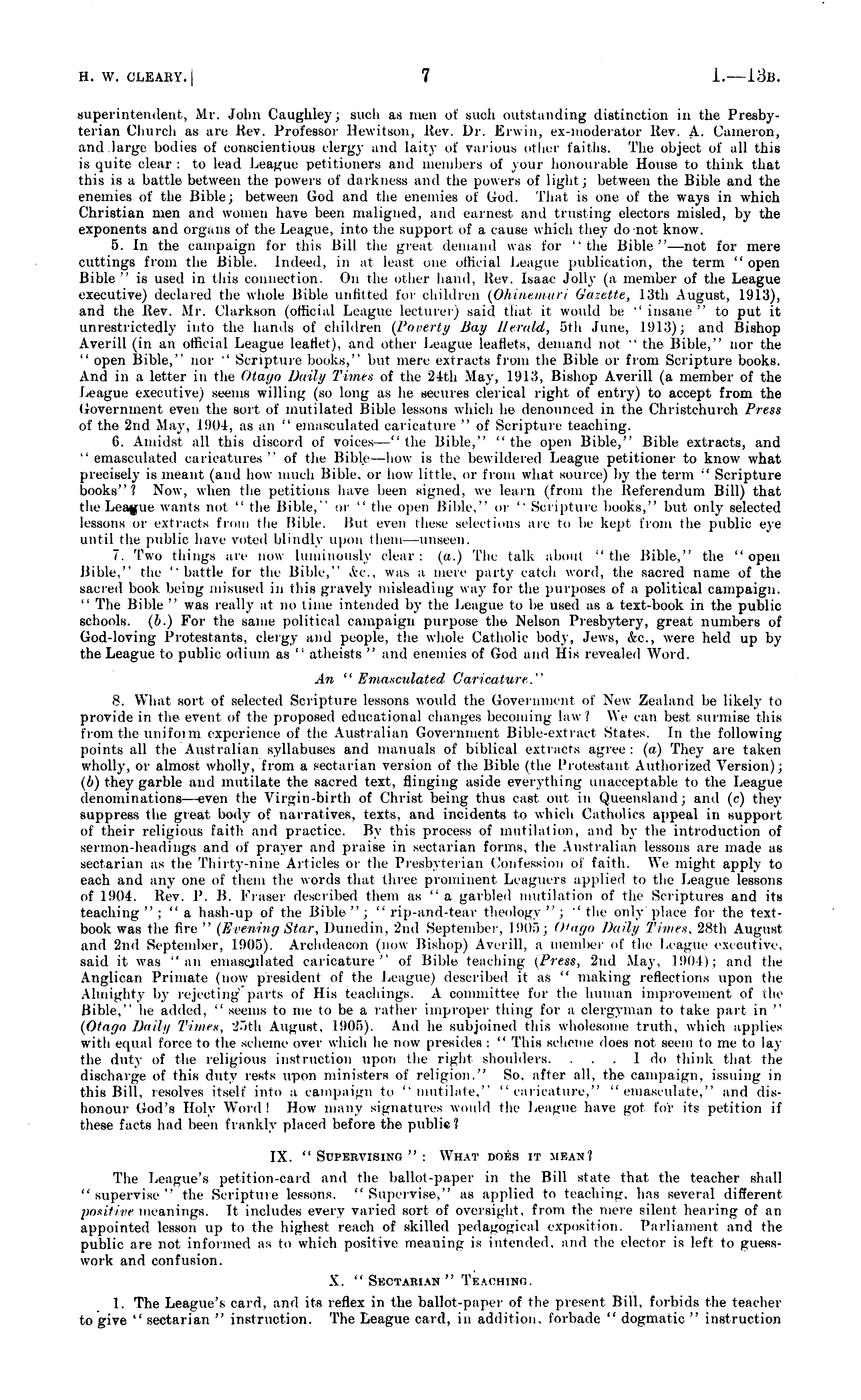 superintendent, Mr. John Caughlej ; euch as men of such outstanding distinction in the Presbyterian Church as are Rev. Professor Hewitson, Rev. Dr. Erwin, ex-moderator Rev. A. Cameron, and Large bodies of conscientious clergj and laity of various other Faiths. The object of all this is quite clear: to load League petitioners and members of your honourable House to think that this is a battle between the powers of darkness and the powers of Light; between the Bible and the enemies of the iiiblu; between God and the enemies of God. Hiai is one of the ways in which Christian men and women have been maligned, and earnest am! I lusting electors misled, by the exponents and organs of the League, into the support of a cause which they do not know. 5. In the campaign for this Bill the great demand was for "the Bible"—not for mere cuttings from the Bible. Indeed, in ai least one official League publication, the term "open Bible" is used in this connection. <m the other hand. Rev. Isaac Jolly (a member of the League executive) declared the whole Bible unfitted lor children (Ohinemuri Gazette, 13th August, 1913), and the Rev. Mr. Clarkson (official League lecturer) said that ii would be "insane" to put it unrestrictedly into the bands of children (Poverty Bay Herald, sth June. 11)13); and Bishop Averill (in an official League Leaflet), and other League leaflets, demand not " the Bible," nor the "open Bible," nor " Scripture books," but mere extracts from the Bible or from Scripture books. And in a Letter in the Otago Daily Times of the 21th May, 1913, Bishop Averill (a member of the League executive) seems willing (so long as lie secures clerical right of entry) to accept from the Government even the sort of mutilated Bible lessons which he denounced in the Christchurch Press of the 2nd May, 1904, as an " emasculated caricature " of Scripture leaching. (i. Amidst all this discord of voices—" the Bible," " the open Bible," Bible extracts, and "emasculated caricatures" of the Bible how is the bewildered League petitioner to know what precisely is meant (and how much Bible, or how little, or from what source) by the term " Scripture hooks".' Now, when the petitions have been signed, we Learn (from the Referendum Bill) that the League wants not " the Bible," or " the open Bible." or " Scripture books," but only selected lessons or extracts from the Bible. But even these selections are lo he kepi from the public eye until the public have voted blindly upon them — unseen. 7. Two things an- now luminously clear: (<i.) The talk about ''the Bible," the "open Bible," the ''battle for the Bible," &C, was a mere party catch word, the sacred name of the sacred book being misused in this gravely misleading way for the purposes of a political campaign. " The Bible " was really al no time intended by the League lo lie used as a text-book in the public schools, (l>.) For the same political campaign purpose the Nelson Presbytery, great numbers of God-loving Protestants, clergy ami people, the whole Catholic body, .lews. &c, were held up by the League to public odium as " atheists " and enemies of God and ilis revealed Word. An "Emasculated Caricature." 8. What sort of selected Scripture lessons would the Government of New Zealand be likely to proVide in the event of the propOßed educational changes becoming law ! We can best surmise this from-the uniform experience of the Australian Government Bible-extract States. In the following points all the Australian syllabuses and manuals of biblical extracts agree: (a) They are taken wholly, or almost wholly, from a sectarian version of the Bible (the Protestant Authorized Version); (A) they garble and mutilate the sacred text. Hinging aside everything unacceptable to the League denominations —even the Virgin-birl h of Christ being thus cast out in Queensland; ami (<•) they Suppress the great body of narratives. textß, and incidents to which Catholics appeal in support of their religious faith and practice. By this process of mutilation, and by the introduction of sermon-headings and of prayer and praise in sectarian forms, the Australian lessons are made as arian as the Thirty-nine Articles or the Presbyterian Confession of faith. We might apply to each and any one of them the weirds that three prominent Leaguers applied to the League lessons of 1904. Rev. I. B. Fraser described them as "a garbled mutilation of the Scriptures and its teaching"; "a hash-up of the Bible"; " rip-and-tear theology"; 'the only place for the textbook was the lire " (Evening Star, Dunedin, "2nd September, [905; O*ago Daily Times, 28th August ami 2nd September, 1905). Archdeacon (now Bishop) Averill, a member of the League executive, said it was "an emascjilated caricature" of Bible leaching (Press, 2nd May. 1904); and the Anglican Primate (now president of the League) described it as " making reflections upon the Almighty by rejecting parts of Ilis teachings. A committee for the human improvement of 'he Bible," he added, "seems lo me to be a rather improper thing for a clergyman to take part in (Otago Daily Times, 25th August. 1905). And he subjoined this wholesome truth, which applies with equal force to the scheme over which he now presides : " This echeme does not seem to me to hi \ the duty of the religious instruction upon the right shoulders. ... I do think that the discharge of this duty rests upon ministers of religion." So, after all, the campaign, issuing in this Bill, resolves itself into ;i campaign to '"mutilate." "caricature," "emasculate." and dishonour God's Holy Word! How many signatures would the League have got for its petition if these facts had been frankly placed before the public 1 IX. " SUPERVISING " : What ikh:s it mk.w.' The League's petition-card and the ballot-paper in the Bill slate that the teacher shall "supervise" the Scripture lessons. "Supervise." as applied to teaching, lias several different positive meanings. It includes every varied sort of oversi