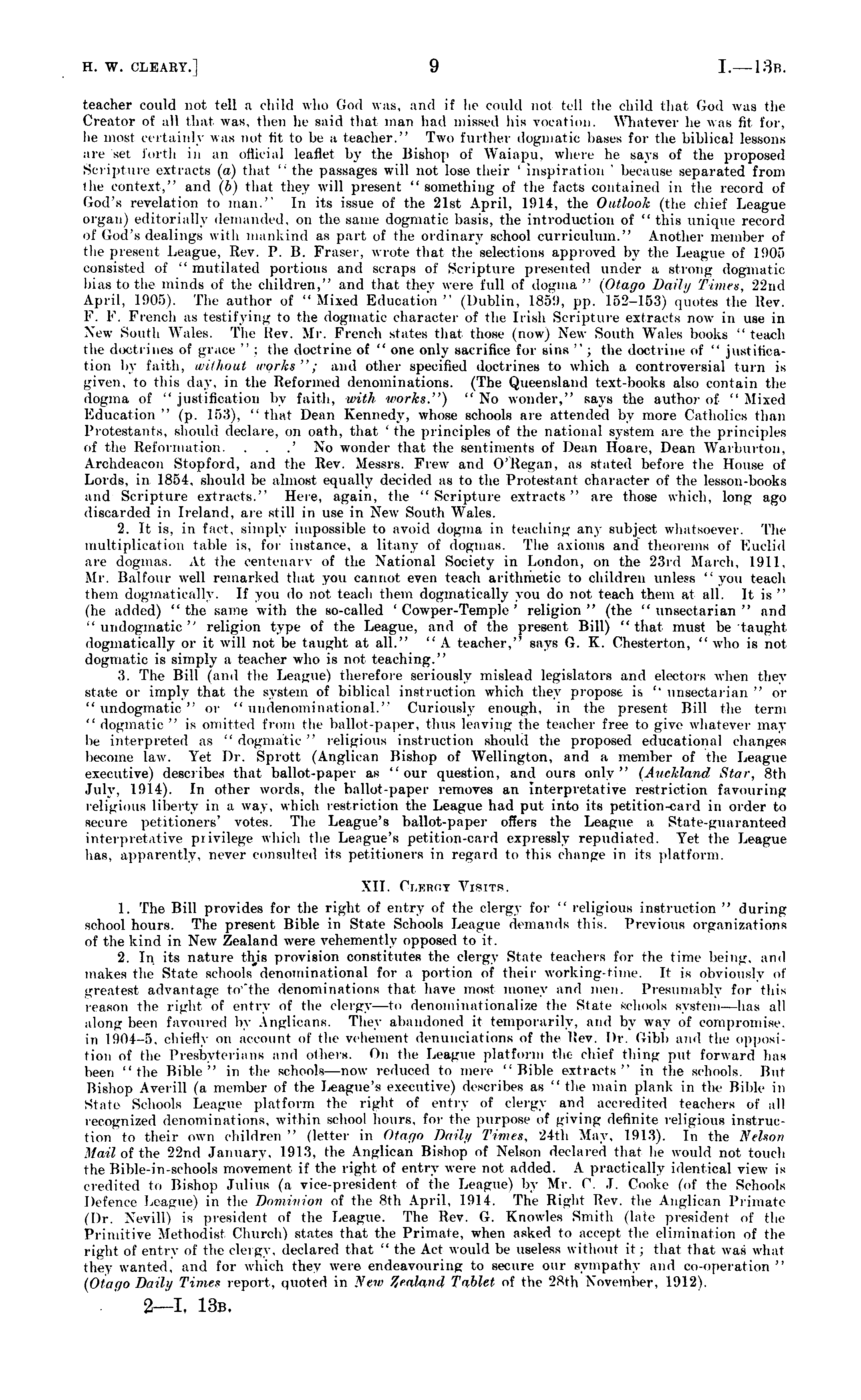 teacher could not tell a child who God was. and if he could not tell the child Unit God was the Creator of all that was, then he said thai man bad missed his vocation. Whatever lie was lit for, lie liHisi certainly was not tit to be a teacher." Two further dogmatic bases for the biblical lessons arc set forth in an official leaflet by the Bishop of Waiapu, where he says of the proposed Scripture extracts (a) that "the passages will not lose their ' inspiration ' because separated from the context," and (6) that they will present "something of the facts contained in the record of God's revelation to man." In its issue of the 21st April, 1914, the Outlook (the chief League organ) editorially demanded, on the same dogmatic basis, the introduction of "this unique record of God's dealings with mankind as pftri of the ordinary school curriculum." Another member of the present League, Rev. 1 , . ]!. Fraser, wrote that the selections approved by the League of 1905 consisted of " mutilated portions and scraps of Scripture presented under a strong dogmatic bias to the minds of the children," and that they were full of dogma" (Otago Daily Times, 22nd April. 1905). The author of "Mixed Education" (Dublin, 185!), pp. 152-153) quotes the Rev. I. K. French as testifying to the dogmatic character of the Irish Scripture extracts now in use in New South Wales. The Rev. Mr. French states that those (now) New South Wall's books •'teach the doctrines of grace " j the doctrine of " one only sacrifice for sins "; the doctrine of " justification by faith, without works"; and other specified doctrines to which a controversial turn is given, to this day. in the Reformed denominations. (The Queensland text-books also contain the dogma of ''justification by faith, with works.") "No wonder," says the author of "Mixed Education " (p. 153), "thai Dean Kennedy, whose schools are attended by more Catholics than Protestants, should dec],ire. on oath, that ' the principles of the national system are the principles of the Reformation. . . .' No wonder that the sentiments of Dean lloare, Dean Warburton, Archdeacon Stopford, and the Rev. Messrs. Frew and O'Hegan, as stated before the Mouse of Lords, in 1854, should be almost equally decided as to the Protestant oharacter of the lesson-books and Scripture extracts." Here, again, the "Scripture extracts" are those which, long ago discarded in Ireland, are still in use in New South "Wales. 2. It is, in fact, simply impossible to avoid dogma in teaching any subject whatsoever. The multiplication table is. for instance, a litany of dogmas. The axioms and theorems of Euclid are dogmas. At the cenleiiarv of the National Society in London, on the 2.3rd March, 1911, Mr. Balfour well remarked that you cannot even teach arithmetic to children unless "you teach them dogmatically. If you do not teach them dogmatically you do not teach them at all. It is" (he added) "the same with the so-called '('ow pel-Temple ' religion" (the " unsectarian " and •' undogmatic "' religion type of the League, and of the present Rill) " that must be taughi dogmatically or it will not be taughi at all." "A teacher, says (!. K. Chesterton, "who is not dogmatic is simply a teacher who is not teaching." .'i. The Bill (and the League) therefore seriously mislead legislators and electors when they slate or imply that the system of biblical instruction which they propose is " unsectarian " or " undogmatic " or "undenominational." Curiously enough, in the present Rill the term " dogmatic " is omitted from the ballot-paper, thus leaving the teacher free to give whatever may be interpreted as ''dogmatic" religious instruction should the proposed educational changes become law. Yet Dr. Spmtt (Anglican Bishop of Wellington, and a member of the League executive) describee that ballot-paper as ''our question, and ours only" (Auckland Star, Bth July, 1914). In other words, the ballot-paper removes an interpretative restriction favouring religious liberty in a way, which restriction the League had put into its petition-card in order to secure petitioners' votes. The League's ballot-paper offers the League a State-guaranteed interpretative privilege which the League's petition-card expressly repudiated. Vet the League has. apparently, never consulted its petitioners in regard to this change in its platform. XII. Clbrgy Visits. 1. The Bill provides for the right of entry of the clergy for " religious instruction " during school hours. The present Bible in Stale Schools League demands this. Previous organizations of the kind in New Zealand were vehemently opposed to it. 2. In its nature tins provision constitutes the clergy Stale teachers I'm , the time being, and makes the State schools denomina t ional for a portion of their work ing-1 ime. It is obviously of greatest advantage to the denominations that have inosl money and men. Presumably for this reason the right of entry of the clergy—to denoininationali/.c the Stale Schools system—has all along been favoured by Anglicans. They abandoned it temporarily, and by way of compromise, in 1904-5, chiefly on account of the vehement denunciations of the Rev. Dr. Cibb and the opposi i ion of ihe Presbyterians and others. On the League platform tin chief thing put forward has been "the Bible" in the schools—now reduced to mere "Bible extracts" in the schools. But Bishop Averill (a member of the League's executive) describes as " the main plank in the Bible in State Schools League platform the right of entry of clergy and accredited teachers of all recognized denominations, within school hours, for the purpose of giving definite religious instruc tion to their own children " (letter in Otago Daily Times, 24th May. 1913). In the Nelson Mail of the 22nd January. 1913, the \nglican Bishop of Nelson declared that he would not touch the Bible-in-Schools movement if the right of entry were nol added. A practically identical view is credited to Bishop Julius (a vice-president of