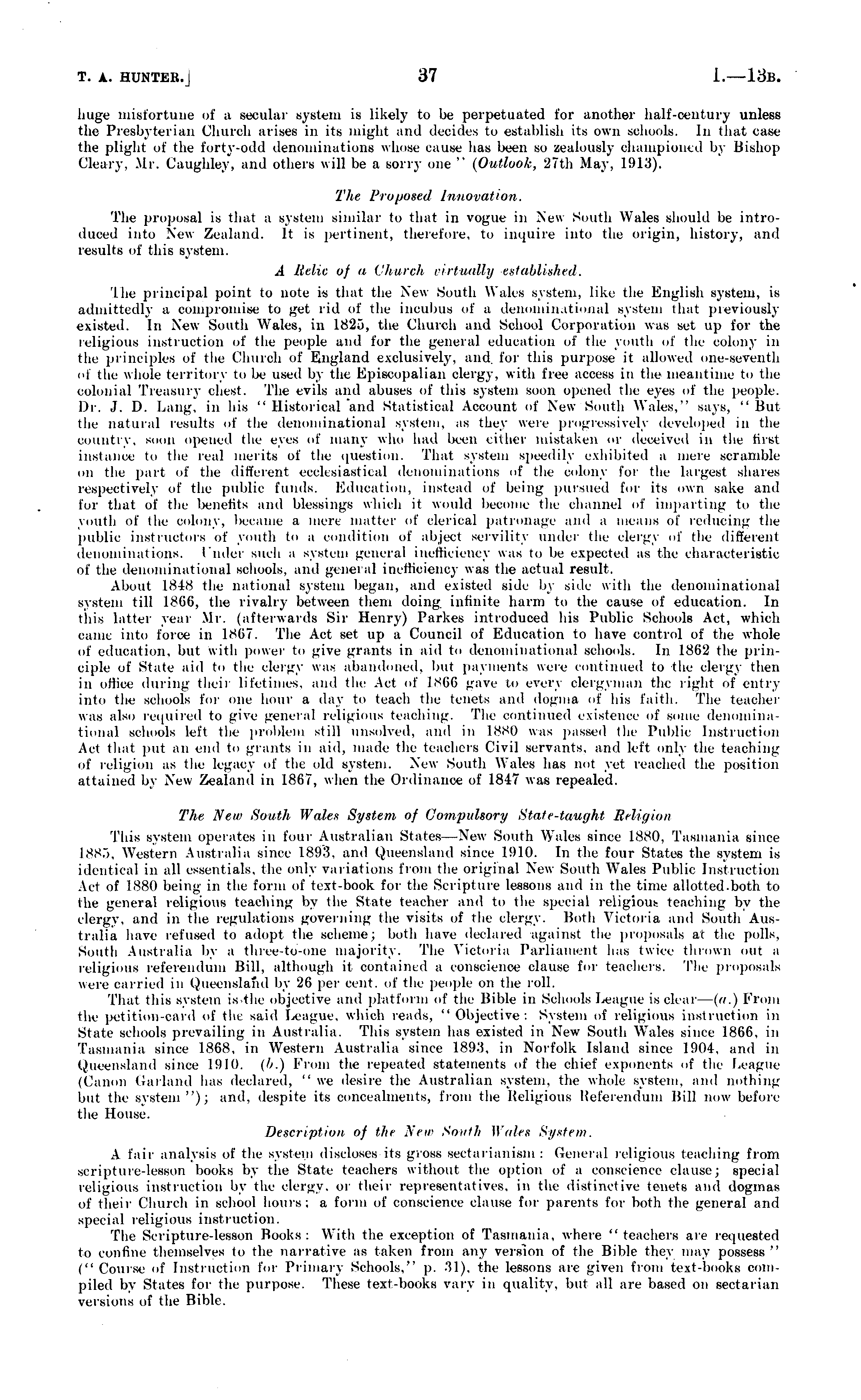 huge misfortune of a .secular system is likely to be perpetuated for another half-century unless the Presbyterian Church arises in its might and decides to establish its own schools. In that case the plight of the forty-odd denominations whose cause lias been so zealously championed by Bishop Cleary, Mr. Caughley, and others will be a sorry one " (Outlook, 27th May, 1913). The Proposed Innovation. The proposal is that a system similar to that in vogue in New Smith Wales should be introduced into New Zealand. It is pertinent, therefore, to inquire into the origin, history, and results of this system. A Relic of a Church virtually established. Ihe principal point to note is that the New South Wales system, like the English system, is admittedly a compromise to get rid of the incubus of a denominational system that previously existed. In New South Wales, in 1820, the Church and School Corporation was set up for the religious instruction of the people and for the general education of the youth of the colony in the principles of the Church of England exclusively, and for this purpose it allowed one-seventh of the whole territory to be used by the Episcopalian clergy, with free access iii the meantime to the colonial Treasury chest. The evils and abuses of this system sunn opened the eyes of the people. Dr. J. D. Lang, in his " Historical "and Statistical Account of New South Wales," says, "But the natural results of the denominational system, as they were progressively developed in the country, soon opened the eyes of many who had been either mistaken or deceived in the tirst instance to the real merits of the question. That system speedily exhibited a mere scramble on the part of the different ecclesiastical denominations of the colony for the largest shares respectively of the public funds. Education, instead of being pursued for its own sake and for that of the benefits and blessings which it would become the channel of imparting to the youth of the colony, became a mere matter of clerical patronage and a means of reducing the public instructors of youth to a condition of abject servility under the clergy of the different denominations. Under such a system general inefficiency was to lie expected as the characteristic of the denominational schools, and general inefficiency was the actual result. About 1848 the national system began, and existed side by side with the denominational system till ISGO, the rivalry between them doing, infinite harm to the cause of education. In this latter veal , Mr. (afterwards Sir Henry) l'arkes introduced his Public Schools Act, which calm into force in 1807. The Act set up a Council of Education to have control of the whole of education, but with power t" give grants in aid to denominational schools. In 1862 the principle of State aid to the clergy was abandoned, but payments were continued to the clergy then in office during their lifetimes, and the Act of 1866 gave to every clergyman the right of entry into the schools for one hour a day to teach the tenets and dogma of his faith. The teacher was also required to give general religious teaching. 'I , hi' continued existence of some denominational schools left the problem still unsolved, and in 1880 was passed the Public Instruction Act that put an end to grants in aid, made the teachers Civil servants, and left only the teaching of religion as the legacy of the old system. New South Wales has not yet reached the position attained by New Zealand in 1867, when the Ordinance of 1847 was repealed. The Neir South Wales System of Compulsory State-taught Religion This system operates in four Australian States—New South Wales since LBBO, Tasmania since 1885, Western Australia since IS!).'', and Queensland since 1910. In the four States the system is identical in all essentials, the only variations from the original New South Wales Public Instruction Act of 1880 being in the form of text-book for the Scripture lessons and in the time allotted.both to I Ik , general religious teaching by the State teacher and to the special religious teaching by the clergy, and in the regulations governing the visits of the clergy. Both Victoria and South Australia have refused to adopt the scheme; both have declared against the proposals at the polls. South Australia by a three-to-one majority. The Victoria Parliament has twice thrown out a religious referendum Bill, although it contained a conscience , clause for teachers. The proposals were carried in Queensland by '-'(i per cent, of the people on the roll. That this svsteni is the objective and platform of the Bible in Schools League is clear — (a.) From the petition-card of tin said League, which reads, "Objective: System of religious instruction in State schools prevailing in Australia. This system has existed in New South Wales since 1866, in Tasmania since 1868, in Western Australia since 1893, in Norfolk Island since 11)04. and in Queensland since MHO. ('/.) From the repeated statements of the chief exponents of the League (Canon Garland has declared, "we desire the Australian system, the whole system, and nothing lint the system"); and. despite its concealments, from the Religious Referendum Bill now before the House. Description of tin New South Wales System. A fair analysis of the system discloses its gross sectarianism : General religious teaching from scripture-lesson books by the State teachers without the option of a conscience clause; special religious instruction by the clergy, or their representatives, in the distinctive tenets ami dogmas of their Church in school hours; a form of conscience clause for parents for both the general ami special religious instruction. The Scripture-lesson Rooks; With the exception of Tasmania, where "teachers are requested to confine themselves to the narrative as taken from any version of the Bible they may possess" (" Course of Instruction for Primary Schools." p. 31), the lessons are given from text-books compiled by States f