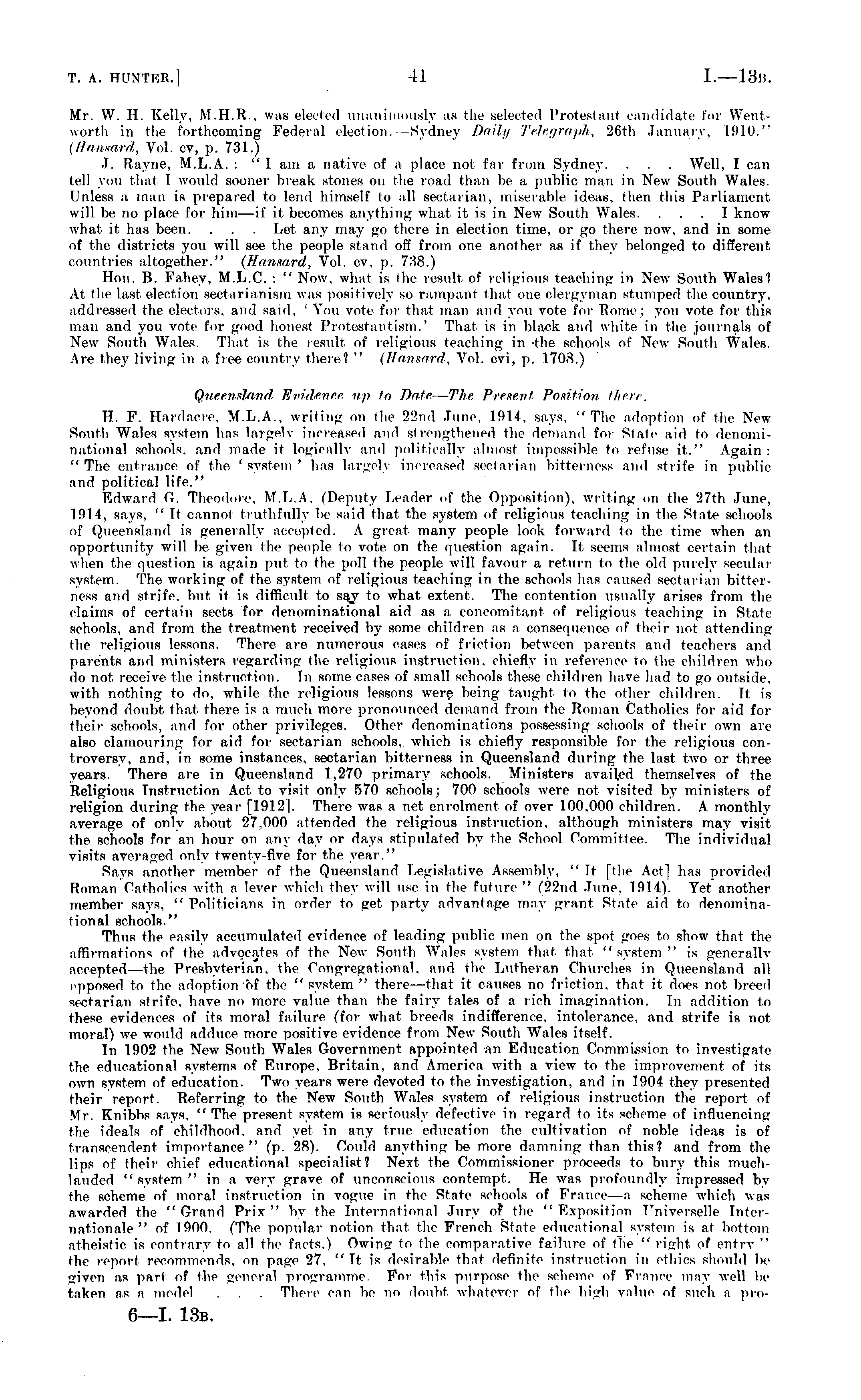 Mi , . W. 11. Kelly, M.H.R., was elected unanimously as the selected Protestani candidate for Wentworth in the forthcoming Federal election. —Sydney Daily Telegraph, 26th January, 1910." (Hansard, Vol. cv, p. 731.) .). Rayne, M.L.A. : "I am a native of a place not far from Sydney. . . . Well, I can tell you thai I would sooner break stones on Iho road than be a public man in New South Wales. Unless a man is prepared to lend himself to all sectarian, miserable ideas, then this Parliament will be no place for him— if it becomes anything what it is in New South Wales. ... I know what it has been. . . . Let any may go there in election time, or go there now, and in some of the districts you will see the people stand off from one another as if they belonged to different countries altogether." (Hansard, Vol. cv, p. 7-'?8.) TTon. B. Fahey, M.L.C. : " Now. what is the result of religious teaching in New South Wales? At the last election sectarianism was positively so rampant that one clergyman stumped the country, addressed the electors, and said, ' You vote for that man and you vote for Rome ; you vote for this man and you vote for good honest Protestantism.- , That is in black and white in the journals of New South Wales. That is the result of religious teaching in -the schools of New South Wales. Are they living in a free oountry there! " (Hansard, Vol. ovi, p. 1703.) Queensland Evidence up to Dale—The Present Position there, H. F. Hardacre, M.L.A., writing on the '-'"-'ml June. 1914, says. "The adoption of the New South Wales system has largely increased and strengthened the demand for Stale aid to denominational schools, and made it logically and politically almost impossible to refuse it." Again: "The entrance of the 'system' has largely increased sectarian bitterness and strife in public and political life." Edward (I. Theodore, M.L.A. (Deputy Leader of the Opposition), writing on the 27th June, 1914, says, " It cannot truthfully be said that the system of religious teaching in the State schools of Queensland is generally accepted. A greal many people look forward to the time when an opportunity will be given the people to vote on the question again. Tt seems almost certain that when the question is again put to the poll the people will favour a return to the old purely secular system. The working of the system of religious teaching in the schools has caused sectarian bitterness and strife, but it is difficult to say to what extent. The contention usually arises from the claims of certain sects for denominational aid as a concomitant of religious teaching in State schools, and from the treatment received by some children as a consequence of their not attending the religious lessons. There are numerous cases of friction between parents and teachers ami parents and ministers regarding the religious instruction, chiefly in reference to the children who do not receive the instruction. In some cases of small schools these children have hail to go outside, with nothing to do, while the religious lessons were being taught to the other children. Tt is beyond doubt that there is a much more pronounced demand from the Roman Catholics for aid for their schools, and for other privileges. Other denominations possessing schools of their own are also clamouring for aid for sectarian schools, which is chiefly responsible for the religious controversy, and, in some instances, sectarian bitterness in Queensland during the last two or three years. There are in Queensland 1,270 primary schools. Ministers availed themselves of the Religious Instruction Act to visit only 570 schools; 700 schools were not visited by ministers of religion during the year [1912|. There was a net enrolment of over 100.000 children. A monthly average of only about 27,000 attended the religious instruction, although ministers may visit the schools for an hour on any day or days stipulated by the School Committee. The individual visits averaged only twenty-five for the year." Says another member of the Queensland Legislative Assembly, " Tt [the Act] has provided Roman Catholics with a lever which they will use in the future" ('22 nd June. 1914). Yet another member says, " Politicians in order to get party advantage may grant State aid to denominational schools." Thus the easily accumulated evidence of leading public men on the spot goes to show that the affirmations of the advocates of the New South Wales system thai that " system " is generally accepted—the Presbyterian, the Congregational, and the Lutheran Churches in Queensland all epposed to the adoption of the " system " there—that it causes no friction, that it does not breed sectarian strife, have no more value than the fairy tales of a rich imagination. Tn addition to these evidences of its moral failure (for what breeds indifference, intolerance, and strife is not moral) we would adduce more positive evidence from New South Wales itself. Tn 1902 the New South Wales Government appointed an Education Commission to investigate the educational systems of Europe, Britain, and America with a view to the improvement of its own system of education. Two years were devoted to the investigation, and in 1904 they presented their report. Referring to the New South Wales system of religious instruction the report of Mr. Knibbs says. " The present system is seriously defective in regard to its scheme of influencing the ideals of childhood, and vet in any fine education the cultivation of noble ideas is of transcendent importance" (p. 28). Could anything be more damning than this? and from the lips of their chief educational specialist? Next the Commissioner proceeds to bury this muchlauded " system " in a very grave of unconscious contempt. He was profoundly impressed by the scheme of moral instruction in vogue in the State schools of France—a scheme which was awarded the "Grand Prix" by the International Jury of the "Exposition T'niverselle Internationale" of 1900. (The popula