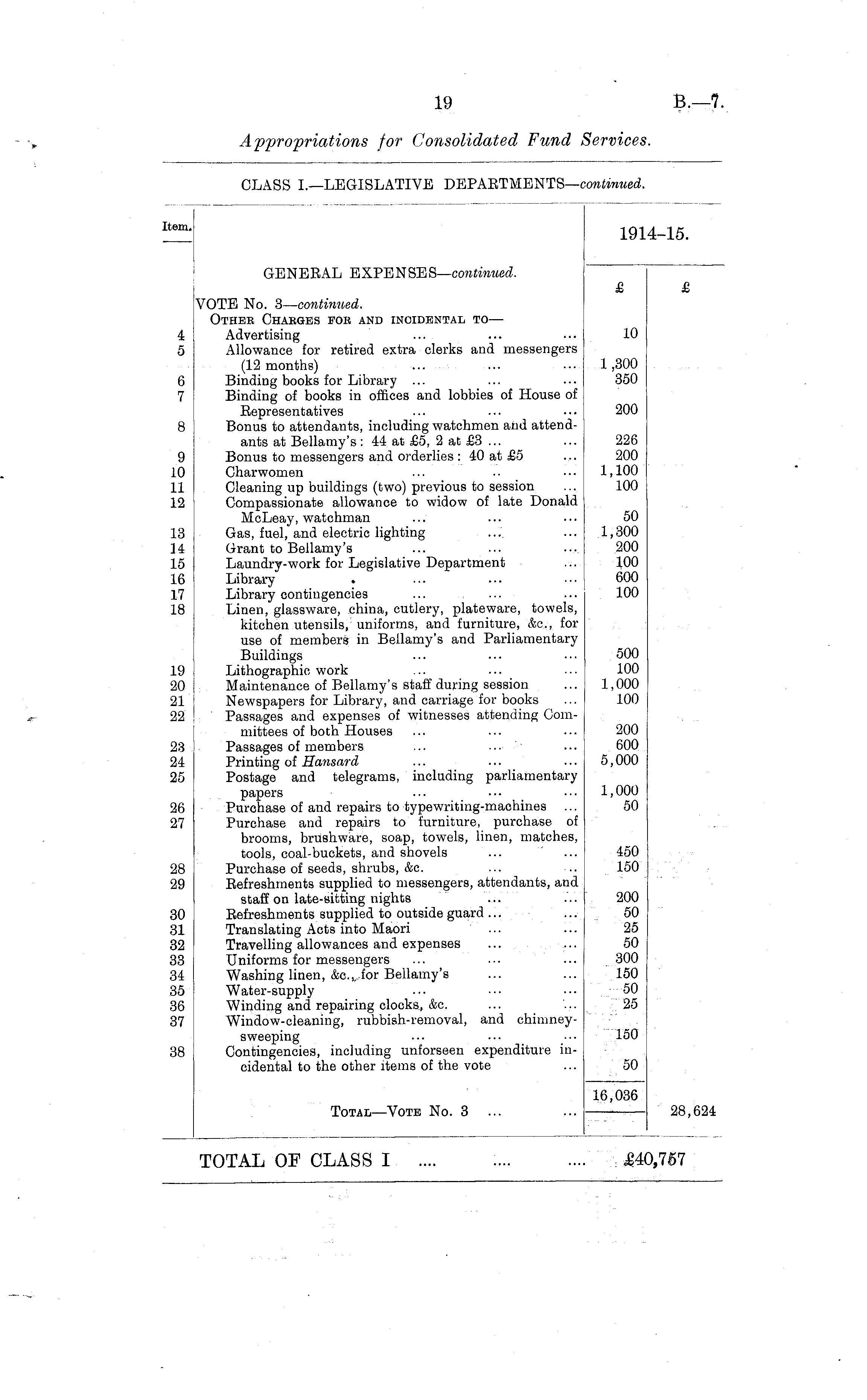 [tern. 1914-15. GENERAL EXPENSES— continued. VOTE No. 3— continued. Other Chaegbs foe and incidental to — Advertising Allowance for retired extra clerks and messengers (12 months) Binding books for Library ... Binding of books in offices and lobbies of House of Eepresentatives Bonus to attendants, including watchmen arid attendants at Bellamy's: 44 at £5, 2 at £3 ... Bonus to messengers and orderlies : 40 at £5 Charwomen Cleaning up buildings (two) previous to session Compassionate allowance to widow of late Donald McLeay, watchman Gas, fuel, and electric lighting Grant to Bellamy's Laundry-work for Legislative Department LibraryLibrary contingencies Linen, glassware, china, cutlery, plateware, towels, kitchen utensils, uniforms, and furniture, &c, for use of members in Bellamy's and Parliamentary Buildings Lithographic work Maintenance of Bellamy's staff during session Newspapers for Library, and carriage for books Passages and expenses of witnesses attending Committees of both Houses h Passages of members Printing of Hansard Postage and telegrams, including parliamentary papers Purchase of and repairs to typewriting-machines ... Purchase and repairs to furniture, purchase of brooms, brushware, soap, towels, linen, matches, tools, coal-buckets, and shovels Purchase of seeds, shrubs, &c. Refreshments supplied to messengers, attendants, and staff on late-sitting nights Refreshments supplied to outside guard ... Translating Acts into Maori Travelling allowances and expenses ... . ... Uniforms for messengers Washing linen, &c.,. for Bellamy's Water-supply Winding and repairing clocks, &c. Window-cleaning, rubbish-removal, and chimneysweeping Contingencies, including unforseen expenditure incidental to the other items of the vote £ 10 4 5 6 7 1,300 350 200 8 226 200 1,100 100 9 10 11 12 13 14 15 16 17 18 50 1,300 200 100 600 100 19 20 21 22 500 100 1,000 100 23 24 25 200 600 5,000 26 27 1,000 50 450 150 28 29 30 31 32 33 34 35 36 37 200 50 25 50 300 150 50 25 150 38 50 Total —Vote No. 3 16,036 28,624 TOTAL OF CLASS I £4i 1,767