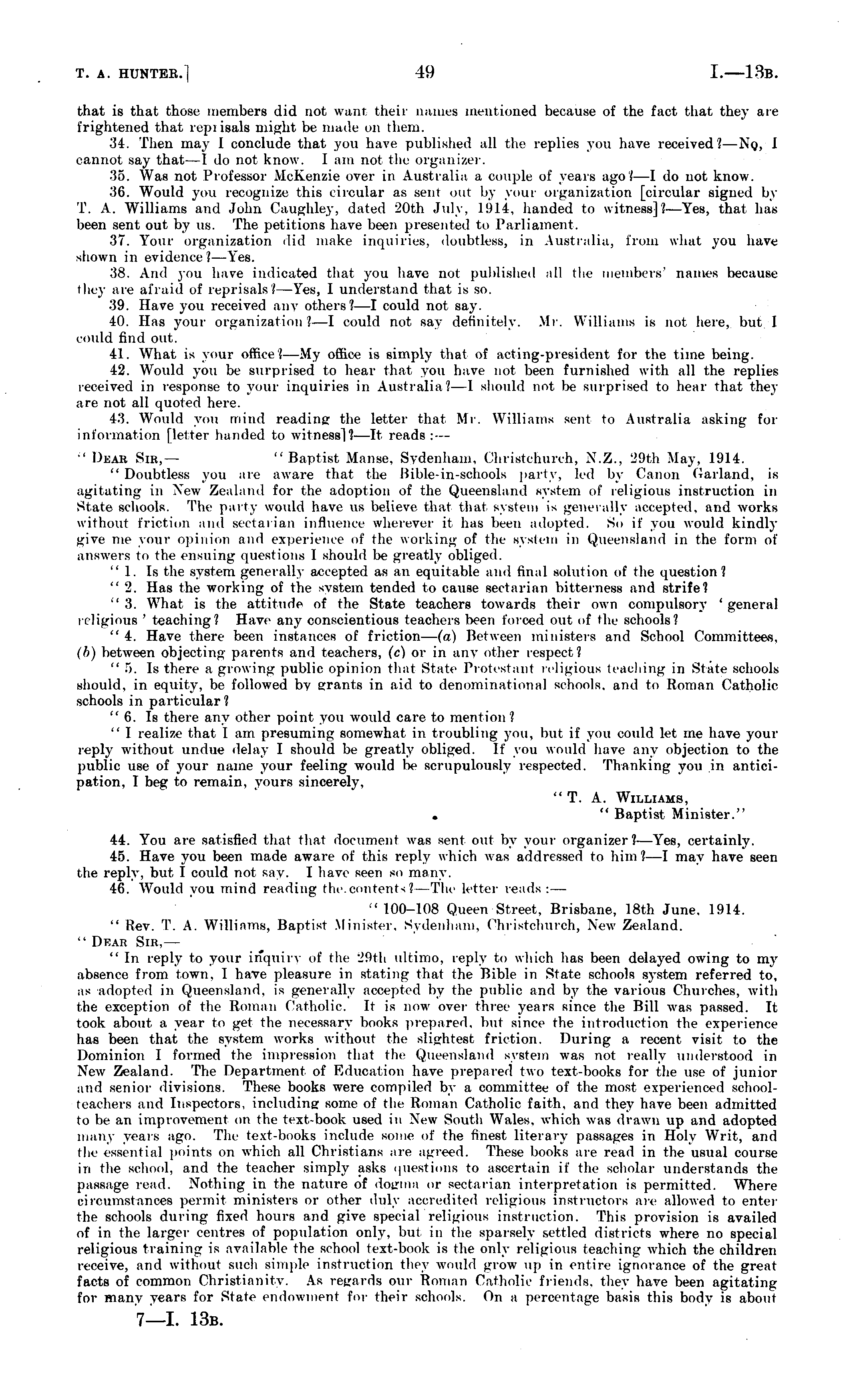 that is that those members did not wani their names mentioned because of the fact that they are frightened that reprisals might be made on them. 34. Then may 1 conclude that you have published all the replies you have received]— No., 1 cannot say that—l do not know. lam not the organizer. ■').">. Was not Professor McKenzie over in Austiali;: a couple of years ago] —1 do not know. •'SG. Would you recognize this circular as seni oui by your organization [circular signed by T. A. Williams and John Caughley, dated 20th July. l!)ll. handed to witness] J —Yes, that has been sent out by us. The petitions have been presented tci Parliament. 37. Your organization did make inquiries, doubtless, in Australia, from what you have shown in evidence] — Yes. 38. And you have indicated that you have m>l published ill the members' names because they are afraid of reprisals? —Yes, 1 understand that is so. .'i9. Have you received any others?—l could not say. 40. Has your organization) — l could not say definitely. Mr. Williams is m>l here, but 1 could find out. 41. What is your office , !—My office is simply that of acting-president for the time being. 42. Would you be surprised to hear that you have not been furnished with all the replies received in response to your inquiries in Australia? —I should not be surprised to hear that they are not all quoted here. 43. Would you mind reading the letter that Mr. Williams sent to Australia asking for information [letter handed to witness"!? —It reads: — ■ Dkak Sir,— "Baptist Manse, Sydenham. Christcnurch, N.Z., 29th May, 1914. "Doubtless you are aware that the Hible-in-schools party, led by Canon Garland, is agitating in New Zealand for the adoption of the Queensland system of religious instruction in Slate schools. The party would have us believe that that system is generally accepted, and works without friction and sectarian influence wherever it has been adopted. So if you would kindly give me your opinion and experience of the working of the .system iv Queensland in the form of answers to the ensuing questions 1 should be greatly obliged. " 1. Is the system generally accepted as an equitable and final solution of the question! " 2. Has the working of the system tended to cause sectarian bitterness and strife? ■'.'!. What is the attitude of the State teachers towards their own compulsory 'general religious ' teaching.' Have any conscientious teachers been forced out of the schools? " 4. Have there been instances of friction —(a) Between ministers and School Committees. ( li i lietween objecting parents and teachers, (c) or in any other respect? " 5. Is there a growing public opinion that State Protestant religious teaching in State schools should, in equity, be followed by grants in aid to denominational schools, and to Roman Catholic schools in particular? " 6. Is there any other point you would care to mention ! " I realize that I am presuming somewhat in troubling you, but if you could let me have your reply without undue delay I should be greatly obliged. If you would have any objection to the public use of your name your feeling would be scrupulously respected. Thanking you in anticipation. I beg to remain, yours sincerely, "T. A. Williams, " Baptist Minister." 44. You are satisfied that that document was sent out by your organizer?— Yes, certainly. 45. Have you been made aware of this reply which was addressed to him? —I may have seen the reply, but I could not say. I have seen so many. 46. Would you mind reading the.contents I —The letter reads:— "100-108 Queen Street, Brisbane, 18th June. 1914. " Rev. T. A. Williams, Baptist Minister. Sydenham, Christchureh, New Zealand. " Dear Sir, — " In reply to your inquiry of the 29th ultimo, reply to which has been delayed owing to my absence from town, I have pleasure in stating that the Bible in State schools system referred to, as adopted in Queensland, is generally accepted by the public and by the various Churches, with the exception of the Roman Catholic. It is now over three years since the Bill was passed. It took about a year to get the necessary books prepared, but since the introduction the experience has been that the system works without the slightest friction. During a recent visit to the Dominion I formed the impression that the Queensland system was not really understood in New Zealand. The Department of Education have prepared two text-books for the use of junior and senior divisions. These books were compiled by a committee of the most experienced schoolteachers and Inspectors, including some of the Roman Catholic faith, and they have been admitted to be an improvement on the text-book used in New South Wales, which was drawn up and adopted many years ago. The text-books include Borne of the finest literary passages in Holy Writ, and the essential points on which all Christians are agreed. These books are read in the usual course in the school, and the teacher simply asks questions to ascertain if the scholar understands the passage read. Nothing in the nature of dogmn or sectarian interpretation is permitted. Where circumstances permit ministers or other duly accredited religious instructors are allowed to enter the schools during fixed hours and give special religious instruction. This provision is availed of in the larger centres of population only, but in the sparsely settled districts where no special religious training is available (lie school text-book is the only religious teaching which the children receive, and without such simple instruction they would grow up in entire ignorance of the great facts of common Christianity. As regards our Roman Catholic friends, they have been agitating for many years for State endowment for their schools. On a percentage basis this body is about