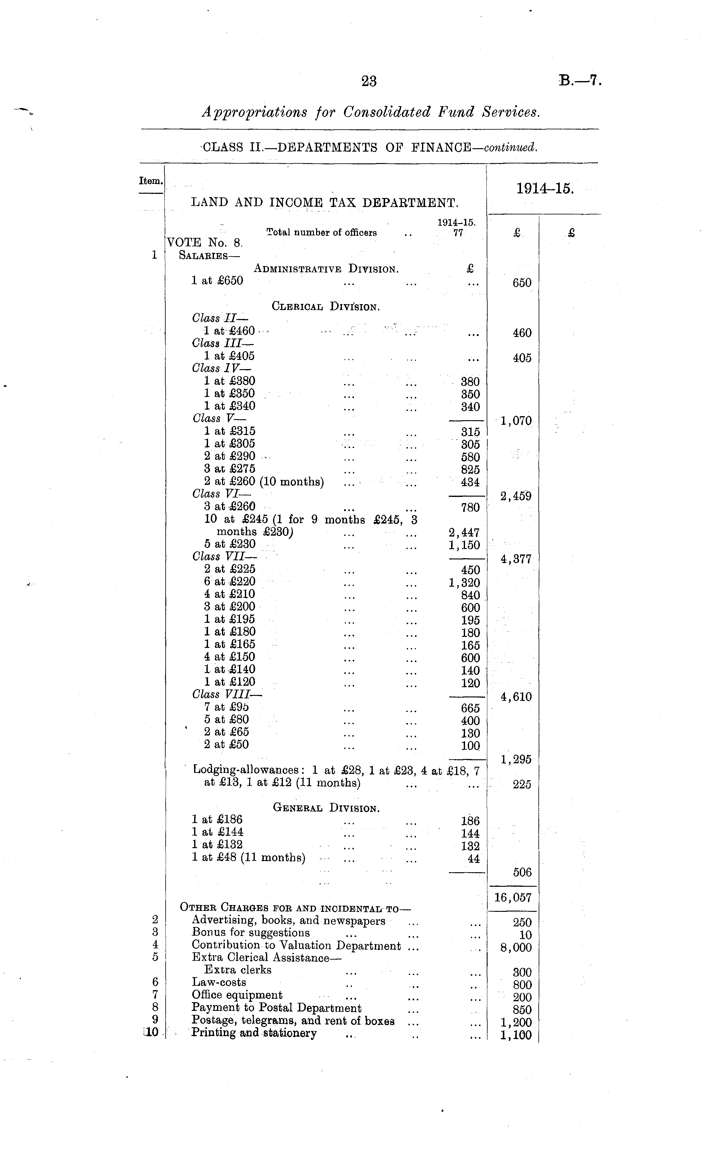 ;em. 1914-15. LAND AND INCOME TAX DEPAETMENT. 1914-15. Total number of officers .. 77 VOTE No. 8. Salaries— £ Administrative Division. £ 1 at £650 650 Clerical Division. Class II— 1 at £460 ■•■ ..; Class III— 1 at £405 ... . ... Class IV— 1 at £380 ... ... 380 1 at £350 ... 350 1 at £340 ... ... 340 Class V— 1 at £315 ... ... 315 1 at £305 ... ... 305 2 at £290 ... ... 580 3 at £275 ... ... 825 2 at £260 (10 months) ... ... 434 Class VI— 3 at £260 ... ... 780 10 at £245 (1 for 9 months £245, 3 months £230) ... ... 2,447 5 at £230 ... ... 1,150 Class VII— 2 at £225 ... ... 450 6 at £220 ... ... 1,320 4 at £210 ... ... 840 3 at £200 ... ... 600 1 at £195 ... ... 195 1 at £180 ... ... 180 1 at £165 ... ... 165 4 at £150 ... ... 600 1 at £140 ... ... 140 1 at £120 ... 120 Class VIII— 7 at £95 ... ... 665 5 at £80 ... ... 400 2 at £65 ... ... 130 2 at £50 ... ... 100 460 405 1,070 2,459 4,377 4,610 Lodging-allowances: 1 at £28, 1 at £23, 4 at £18, 7 at £13, 1 at £12 (11 months) 1,295 225 General Division. 1 at £186 ... ... 186 1 at £144 ... ... 144 1 at £132 ... 132 1 at £48 (11 months) ... ... 44 506 Other Charges for and incidental to — Advertising, books, and newspapers Bonus for suggestions Contribution to Valuation Department ... Extra Clerical Assistance— Extra clerks Law-costs Office equipment Payment to Postal Department Postage, telegrams, and rent of boxes ... Printing and stationery 16,057 2 3 4 5 250 10 8,000 6 7 8 9 10 300 800 200 850 1,200 1,100