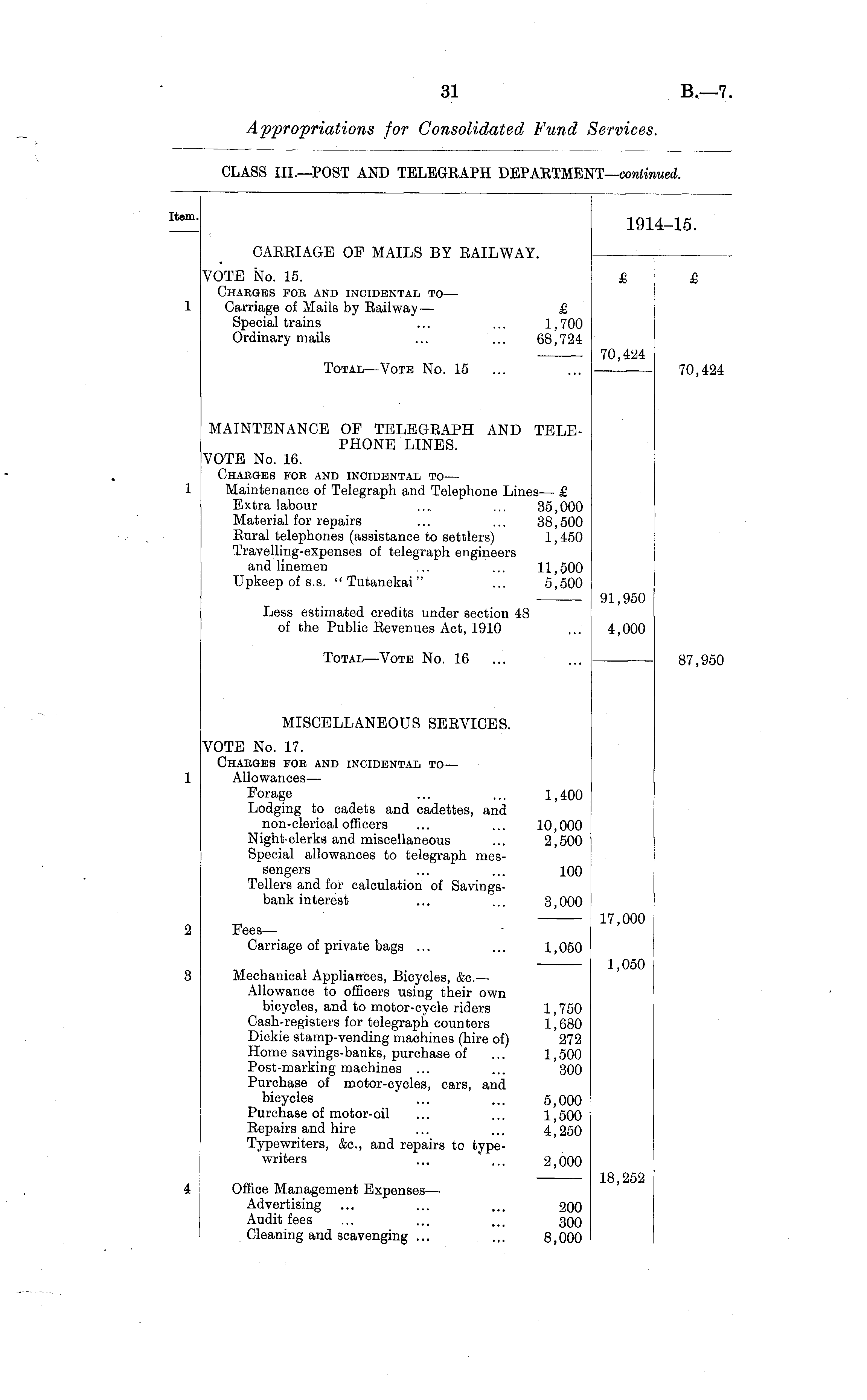 [tem. 1914-15. CAEEIAGB OF MAILS BY EAILWAY. VOTE No. 15. Charges foe and incidental to — Carriage of Mails by Eailway— £ Special trains ... ... 1,700 Ordinary mails ... ... 68,724 £ Total—Vote No. 15 MAINTENANCE OF TELEGEAPH AND TELEPHONE LINES. 70,424 70,424 VOTE No. 16. Charges for and incidental to — Maintenance of Telegraph and Telephone Lines— £ Extra labour ... ... 35,000 Material for repairs ... ... 38,500 Eural telephones (assistance to settlers) 1,450 Travelling-expenses of telegraph engineers and linemen ... ... 11,500 Upkeep of s.s. " Tutanekai" ... 5,500 87,950 Less estimated credits under section 48 of the Public Eevenues Act, 1910 91,950 4,000 Total—Vote No. 16 MISCELLANEOUS SEEVICES. VOTE No. 17. Charges for and incidental to — Allowances— Forage ... ... 1,400 Lodging to cadets and cadettes, and non-clerical officers ... ... 10,000 Night clerks and miscellaneous ... 2,500 Special allowances to telegraph messengers ... ... 100 Tellers and for calculation of Savingsbank interest ... ... 3,000 FeesCarriage of private bags ... ... 1,050 17,000 1,050 Mechanical Appliances, Bicycles, &c.— Allowance to officers using their own bicycles, and to motor-cycle riders 1,750 Cash-registers for telegraph counters 1,680 Dickie stamp-vending machines (hire of) 272 Home savings-banks, purchase of ... 1,500 Post-marking machines ... ... 300 Purchase of motor-cycles, cars, and bicycles ... ... 5 ; 000 Purchase of motor-oil ... ... 1,500 Eepairs and hire ... ... 4. 1 250 Typewriters, &c, and repairs to typewriters ... ... 2,000 18,252 Office Management Expenses— Advertising ... ... ... 200 Audit fees ... ... ... 300 Cleaning and scavenging ... ... 8,000