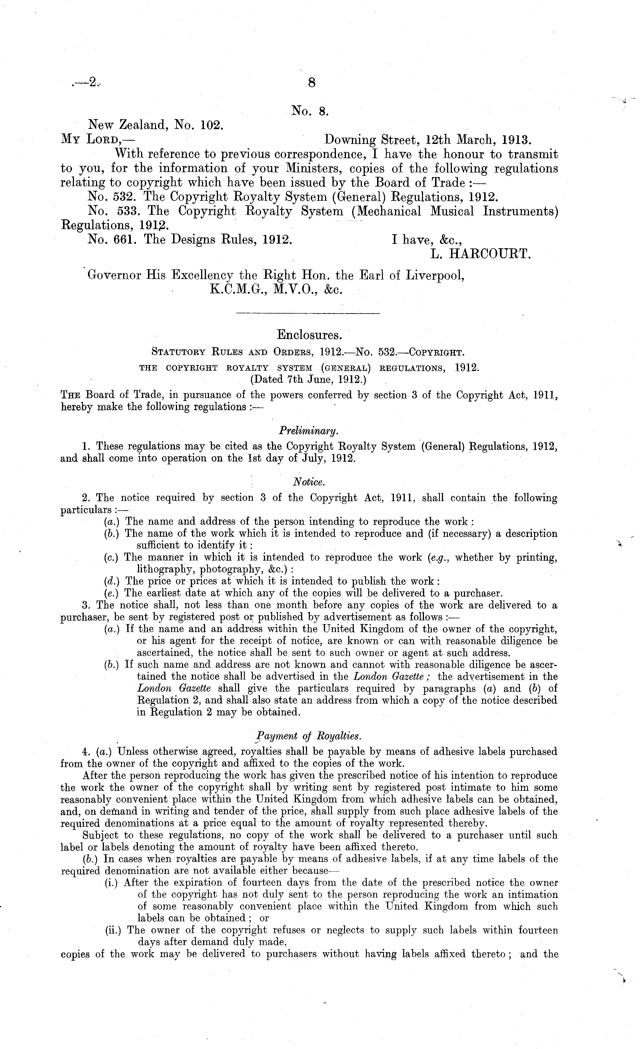 No. 8. New Zealand, No. 102. My Lord,— Downing Street, 12th March, 1913. With reference to previous correspondence, I have the honour to transmit to you, for the information of your Ministers, copies of the following regulations relating to copyright which have been issued by the Board of Trade : — No. 532. The Copyright Royalty System (General) Regulations, 1912. No. 533. The Copyright Royalty System (Mechanical Musical Instruments) Regulations, 1912. No. 661. The Designs Rules, 1912. I have, &c, L. HARCOURT. Governor His Excellency the Right Hon. the Earl of Liverpool, K.C.M.G., M.V.0., &c.