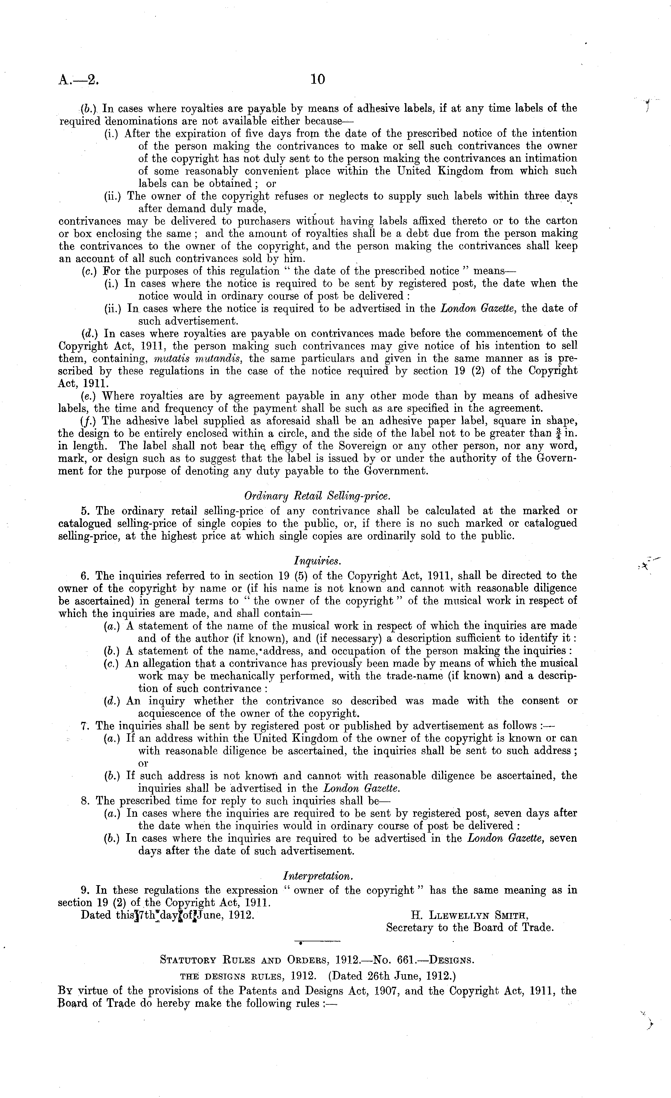 (b.) In oases where royalties are payable by means of adhesive labels, if at any time labels of the required 'denominations are not available either because— (i.) After the expiration of five days from the date of the prescribed notice of the intention of the person making the contrivances to make or sell such contrivances the owner of the copyright has not duly sent to the person making the contrivances an intimation of some reasonably convenient place within the United Kingdom from which such labels can be obtained ; or (ii.) The owner of the copyright refuses or neglects to supply such labels within three days after demand duly made, contrivances may be delivered to purchasers without having labels affixed thereto or to the carton or box enclosing the same ; and the amount of royalties shall be a debt due from the person making the contrivances to the owner of the copyright, and the person making the contrivances shall keep an account of all such contrivances sold by him. (c.) For the purposes of this regulation " the date of the prescribed notice " means— (i.) In cases where the notice is required to be sent by registered post, the date when the notice would in ordinary course of post be delivered : (ii.) In cases where the notice is required to be advertised in the London Gazette, the date of such advertisement. (d.) In cases where royalties are payable on contrivances made before the commencement of the Copyright Act, 1911, the person making such contrivances may give notice of his intention to sell them, containing, mutatis mutandis, the same particulars and given in the same manner as is prescribed by these regulations in the case of the notice required by section 19 (2) of the Copyright Act, 1911. (c.) Where royalties are by agreement payable in any other mode than by means of adhesive labels, the time and frequency of the payment shall be such as are specified in the agreement. (/.) The adhesive label supplied as aforesaid shall be an adhesive paper label, square in shape, the design to be entirely enclosed within a circle, and the side of the label not to be greater than | in. in length. The label shall not bear the. effigy of the Sovereign or any other person, nor any word, mark, or design such as to suggest that the label is issued by or under the authority of the Government for the purpose of denoting any duty payable to the Government. Ordinary Retail Selling-price. 5. The ordinary retail selling-price of any contrivance shall be calculated at the marked or catalogued selling-price of single copies to the public, or, if there is no such marked or catalogued selling-price, at the highest price at which single copies are ordinarily sold to the public. Inquiries. 6. The inquiries referred to in section 19 (5) of the Copyright Act, 1911, shall be directed to the owner of the copyright by name or (if his name is not known and cannot with reasonable diligence be ascertained) in general terms to " the owner of the copyright " of the musical work in respect of which the inquiries are made, and shall contain — (a.) A statement of the name of the musical work in respect of which the inquiries are made and of the author (if known), and (if necessary) a description sufficient to identify it: (6.) A statement of the name,'address, and occupation of the person making the inquiries : (c.) An allegation that a contrivance has previously been made by means of which the musical work may be mechanically performed, with the trade-name (if known) and a description of such contrivance : (d.) An inquiry whether the contrivance so described was made with the consent or acquiescence of the owner of the copyright. 7. The inquiries shall be sent by registered post or published by advertisement as follows :— (a.) If an address within the United Kingdom of the owner of the copyright is known or can with reasonable diligence be ascertained, the inquiries shall be sent to such address ; or (6.) If such address is not known and cannot with reasonable diligence be ascertained, the inquiries shall be advertised in the London Gazette. 8. The prescribed time for reply to such inquiries shall be— (a.) In cases where the inquiries are required to be sent by registered post, seven days after the date when the inquiries would in ordinary course of post be delivered : (b.) In cases where the inquiries are required to be advertised in the London Gazette, seven days after the date of such advertisement. Interpretation. 9. In these regulations the expression " owner of the copyright " has the same meaning as in section 19 (2) of the Copyright Act, 1911. Dated this]7th"day|of|June, 1912. H. Llewellyn Smith, Secretary to the Board of Trade.