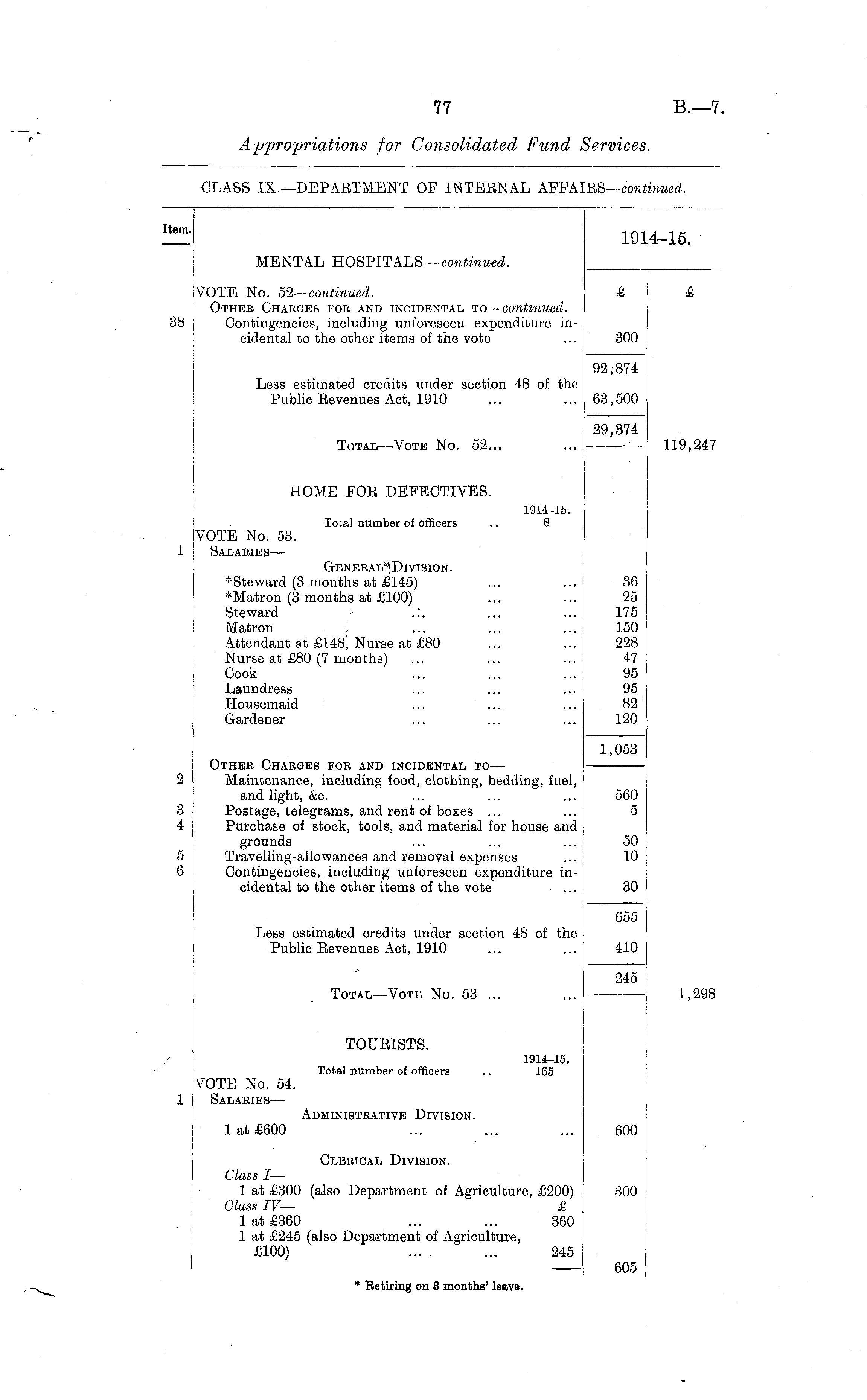 item. 19 .4-15. MENTAL HOSPITALS —continued. 38 VOTE No. 52— continued. Other Charges for and incidental to —continued. Contingencies, including unforeseen expenditure incidental to the other items of the vote £ 300 £ Less estimated credits under section 48 of the Public Revenues Act, 1910 92,874 63,500 Total—Vote No. 52... 29,374 119,247 HOME FOR DEFECTIVES. 1914-15. Toial number of officers .. 8 VOTE No. 53. Salaries— . (3 months at £145) *Matron (3 months at £100) Steward Matron Attendant at £148, Nurse at £80 Nurse at £80 (7 months) Cook Laundress Housemaid Gardener 36 25 175 150 228 47 95 95 82 120 Other Charges for and incidental to —■ Maintenance, including food, clothing, bedding, fuel, and light, &c. Postage, telegrams, and rent of boxes ... Purchase of stock, tools, and material for house and grounds Travelling-allowances and removal expenses Contingencies, including unforeseen expenditure incidental to the other items of the vote • ... 1,053 2 560 5 3 4 5 6 50 10 30 Less estimated credits under section 48 of the Public Revenues Act, 1910 655 410 245 Total—Vote No. 53 ... 1,298 TOURISTS. 1914-15. Total number of officers .. 165 VOTE No. 54. Salaries— Administrative Division. 1 at £600 600 Clerical Division. Class I — 1 at £300 (also Department of Agriculture, £200) Class IV— £ 1 at £360 ... ... 360 1 at £245 (also Department of Agriculture, £100) ... ... 245 300 605 * Retiring on 3 months' leave.