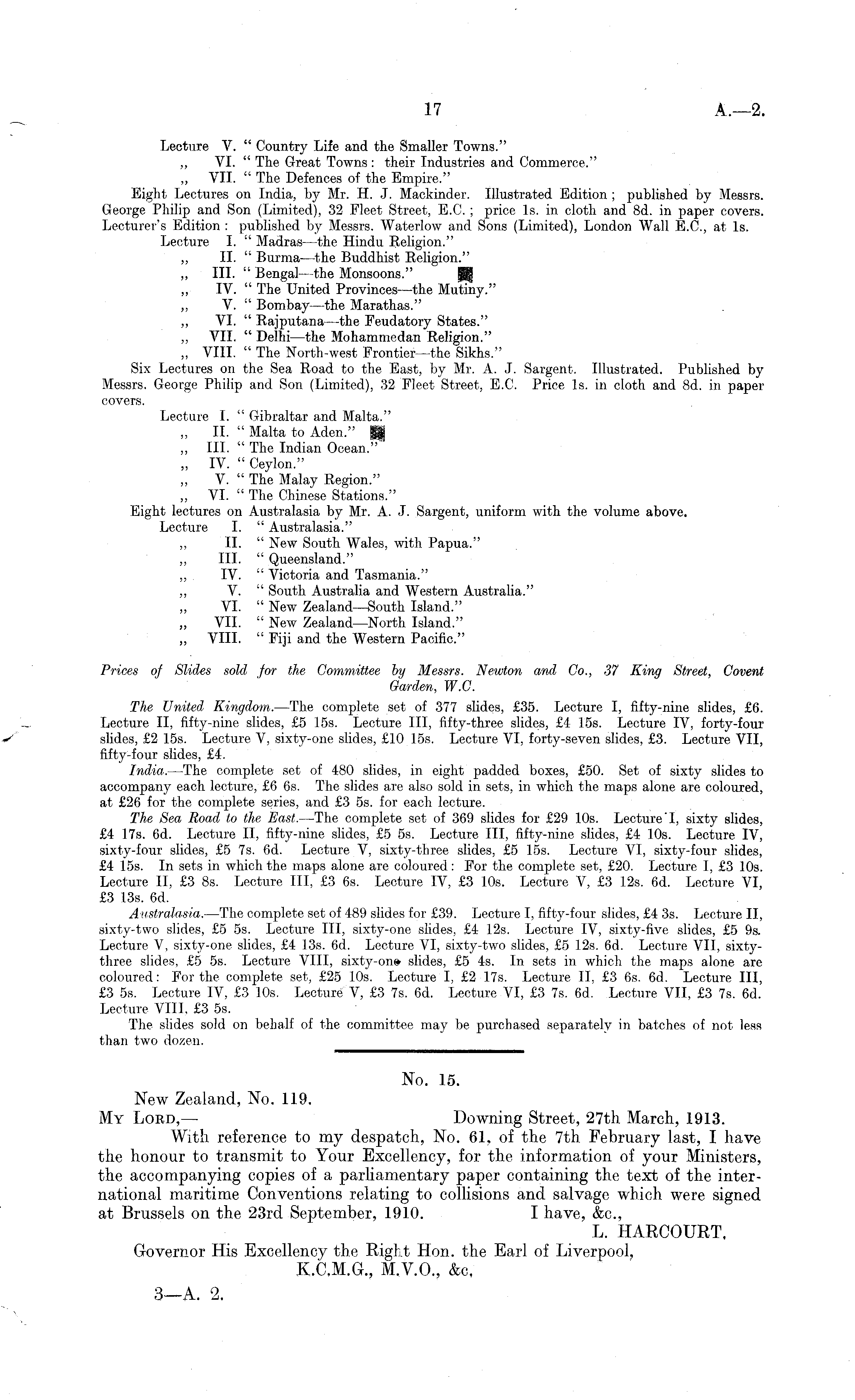 Lecture V. " Country Life and the Smaller Towns." ~ VI. " The Great Towns : their Industries and Commerce." „ VII. " The Defences of the Empire." Eight Lectures on India, by Mr. H. J. Mackinder. Illustrated Edition ; published by Messrs. George Philip and Son (Limited), 32 Fleet Street, E.C. ; price Is. in cloth and Bd. in paper covers. Lecturer's Edition : published by Messrs. Waterlow and Sons (Limited), London Wall E.C., at Is. Lecture I. " Madras—the Hindu Religion." „ 11. " Burma—the Buddhist Religion." ~ 111. " Bengal—the Monsoons." HI IV. " The United Provinces—the Mutiny." „ V. " Bombay—the Marathas." „ VI. " Rajputana—the Feudatory States." ~ VII. " Delhi—the Mohammedan Religion." „ VIII. " The North-west Frontier—the Sikhs." Six Lectures on the Sea Road to the East, by Mr. A. J. Sargent. Illustrated. Published by Messrs. George Philip and Son (Limited), 32 Fleet Street, E.C. Price Is. in cloth and Bd. in paper covers. Lecture I. " Gibraltar and Malta." 11. " Malta to Aden." || „ 111. " The Indian Ocean."" „ IV. " Ceylon." V. " The Malay Region." „ VI. " The Chinese Stations." Eight lectures on Australasia by Mr. A. J. Sargent, uniform with the volume above. Lecture I. " Australasia." ~ 11. " New South Wales, with Papua." 111. " Queensland." „ IV. " Victoria and Tasmania." ~ V. " South Australia and Western Australia." VI. " New Zealand—South Island." VII. " New Zealand—North Island." „ VIII. " Fiji and the Western Pacific." Prices of Slides sold for the Committee by Messrs. Newton and Co., 37 King Street, Covent Garden, W.C. The United Kingdom. —The complete set of 377 slides, £35. Lecture I, fifty-nine slides, £6. Lecture 11, fifty-nine slides, £5 15s. Lecture 111, fifty-three slides, £4 15s. Lecture IV, forty-four slides, £2 15s. Lecture V, sixty-one slides, £10 15s. Lecture VI, forty-seven slides, £3. Lecture VII, fifty-four slides, £4. India. —The complete set of 480 slides, in eight padded boxes, £50. Set of sixty slides to accompany each lecture, £6 6s. The slides are also sold in sets, in which the maps alone are coloured, at £26 for the complete series, and £3 ss. for each lecture. The Sea Road to the East. —The complete set of 369 slides for £29 10s. Lecture'l, sixty slides, £4 17s. 6d. Lecture 11, fifty-nine slides, £5 ss. Lecture 111, fifty-nine slides, £4 10s. Lecture IV, sixty-four slides, £5 7s. 6d. Lecture V, sixty-three slides, £5 15s. Lecture VI, sixty-four slides, £4 15s. In sets in which the maps alone are coloured : For the complete set, £20. Lecture I, £3 10s. Lecture 11, £3 Bs. Lecture 111, £3 6s. Lecture IV. £3 10s. Lecture V, £3 12s. 6d. Lecture VI, £3 13s. 6d. Australasia. —The complete set of 489 slides for £39. Lecture I, fifty-four slides, £4 3s. Lecture 11, sixty-two slides, £5 ss. Lecture 111, sixty-one slides, £4 12s. Lecture IV, sixty-five slides, £5 9s. Lecture V, sixty-one slides, £4 13s. 6d. Lecture VI, sixty-two slides, £5 12s. 6d. Lecture VII, sixtythree slides, £5 ss. Lecture VIII, sixty-on» slides, £5 4s. In sets in which the maps alone are coloured: For the complete set, £25 10s. Lecture I, £2 17s. Lecture 11, £3 6s. 6d. Lecture 111, £3 ss. Lecture IV, £3 10s. Lecture V, £3 7s. 6d. Lecture VI, £3 7s. 6d. Lecture VII, £3 7s. 6d. Lecture VIII, £3 ss. The slides sold on behalf of the committee may be purchased separately in batches of not less than two dozen.