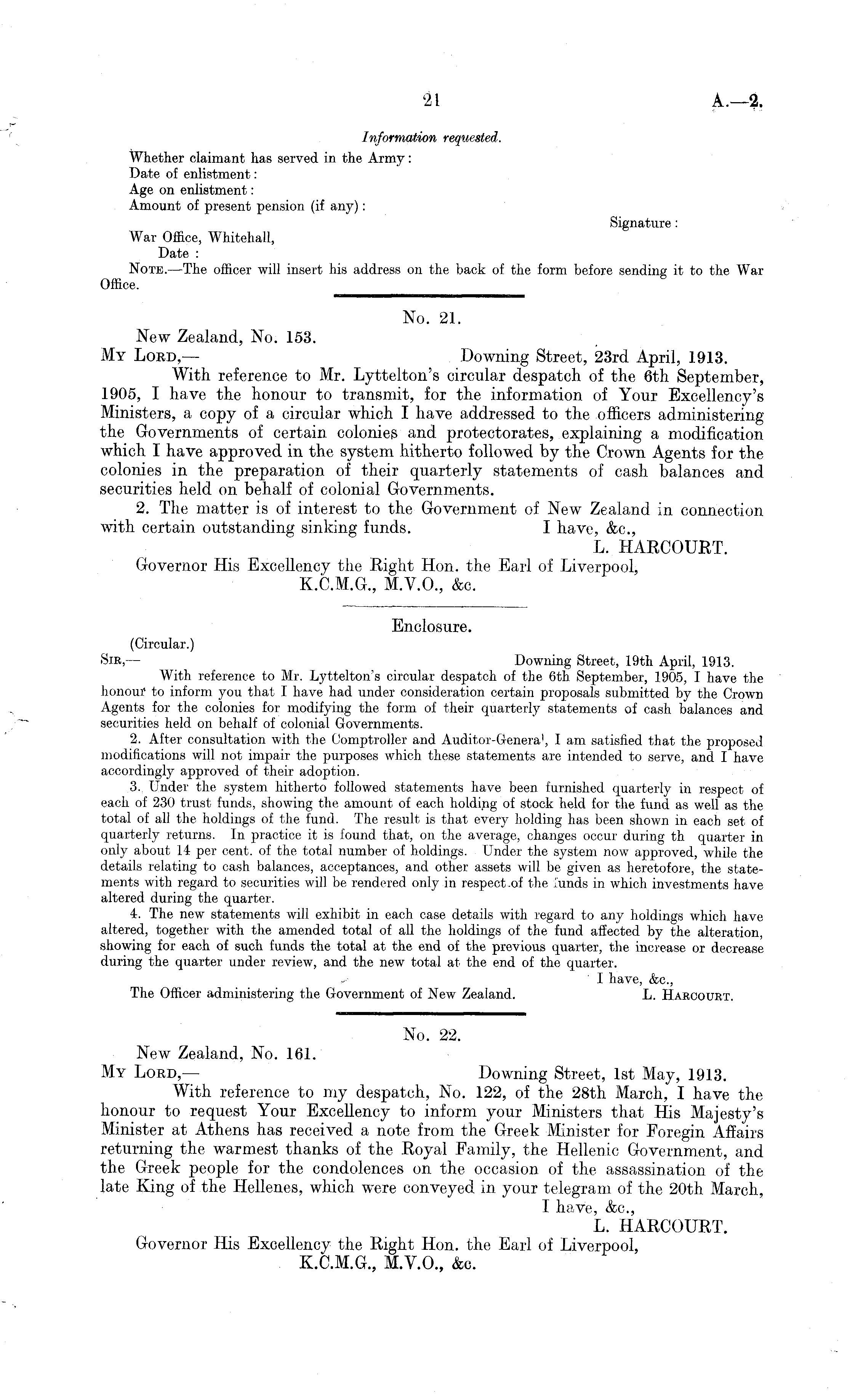 No. 21. New Zealand, No. 153. My Lord,— Downing Street, 23rd April, 1913. With reference to Mr. Lyttelton's circular despatch of the 6th September, 1905, I have the honour to transmit, for the information of Your Excellency's Ministers, a copy of a circular which I have addressed to the officers administering the Governments of certain colonies and protectorates, explaining a modification which I have approved in the system hitherto followed by the Crown Agents for the colonies in the preparation of their quarterly statements of cash balances and securities held on behalf of colonial Governments. 2. The matter is of interest to the Government of New Zealand in connection with certain outstanding sinking funds. I have, &c, L. HABCOURT. Governor His Excellency the Eight Hon. the Earl of Liverpool, K.C.M.G., M.V.0., &c. Enclosure. (Circular.) Sir,— Downing Street, 19th April, 1913. With reference to Mr. Lyttelton's circular despatch of the 6th September, 1905, I have the honoui , to inform you that I have had under consideration certain proposals submitted by the Crown Agents for the colonies for modifying the form of their quarterly statements of cash balances and securities held on behalf of colonial Governments. 2. After consultation with the Comptroller and Auditor-Genera l , I am satisfied that the proposed modifications will not impair the purposes which these statements are intended to serve, and. I have accordingly approved of their adoption. 3. Under the system hitherto followed statements have been furnished quarterly in respect of each of 230 trust funds, showing the amount of each holding of stock held for the fund as well as the total of all the holdings of the fund. The result is that every holding has been shown in each set of quarterly returns. In practice it is found that, on the average, changes occur during th quarter in only about 14 per cent, of the total number of holdings. Under the system now approved, while the details relating to cash balances, acceptances, and other assets will be given as heretofore, the statements with regard to securities will be rendered only in respect .of the iunds in which investments have altered during the quarter. 4. The new statements will exhibit in each case details with regard to any holdings which have altered, together with the amended total of all the holdings of the fund affected by the alteration, showing for each of such funds the total at the end of the previous quarter, the increase or decrease during the quarter under review, and the new total at the end of the quarter. I have, &c, The Officer administering the Government of New Zealand. L. Haroourt. No. 22. New Zealand, No. 161. My Lord,— Downing Street, Ist May, 1913. With reference to my despatch, No. 122, of the 28th March, I have the honour to request Your Excellency to inform your Ministers that His Majesty's Minister at Athens has received a note from the Greek Minister for Poregin Affairs returning the warmest thanks of the Royal Family, the Hellenic Government, and the Greek people for the condolences on the occasion of the assassination of the late King of the Hellenes, which were conveyed in your telegram of the 20th March, I have, &c, L. HABCOUBT. Governor His Excellency the Right Hon. the Earl of Liverpool, K.C.M.G., M.V.0., &c.