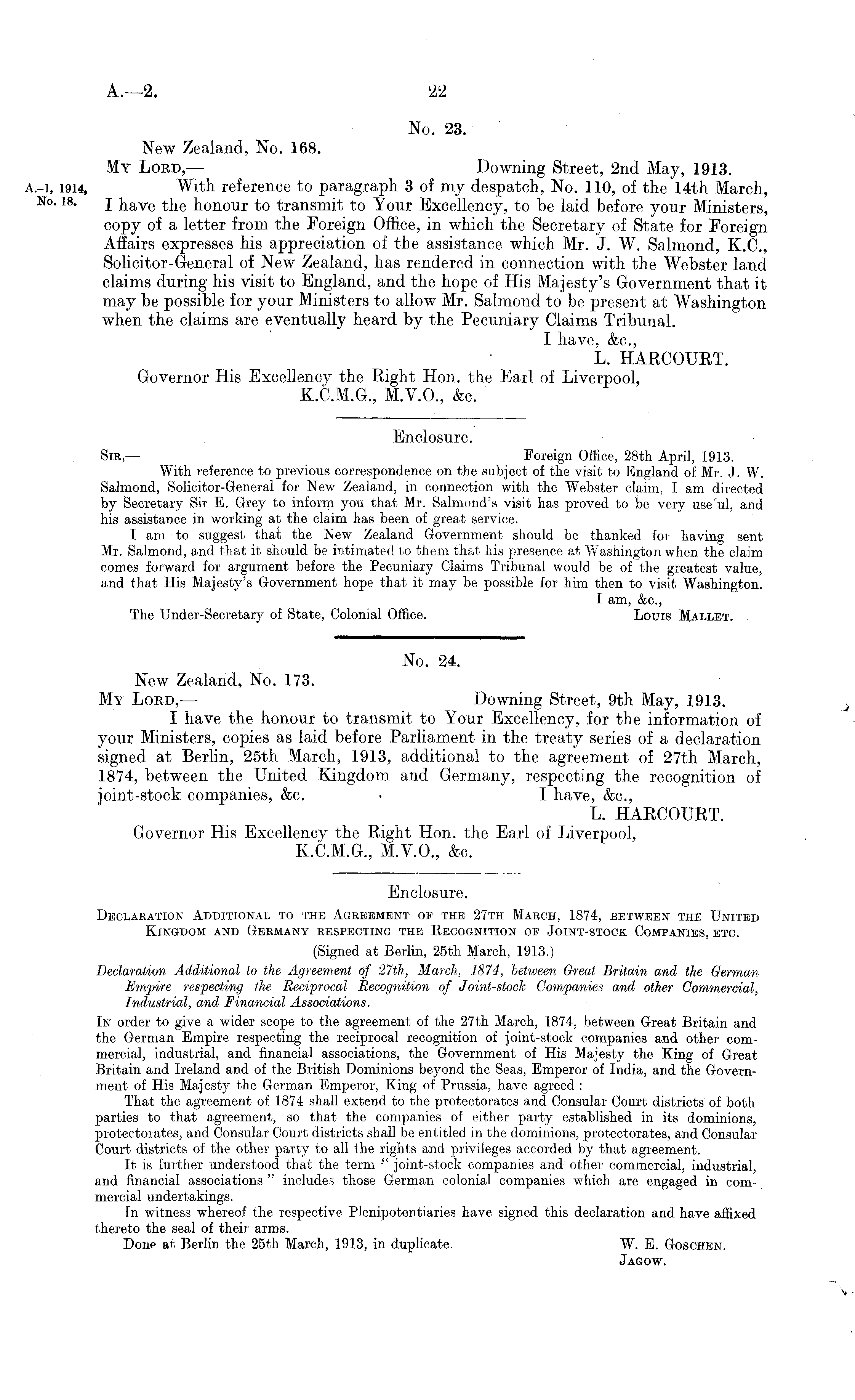 No. 23. New Zealand, No. 168. My Lord, — Downing Street, 2nd May, 1913. With reference to paragraph 3 of my despatch, No. 110, of the 14th March, I have the honour to transmit to Your Excellency, to be laid before your Ministers, copy of a letter from the Foreign Office, in which the Secretary of State for Foreign Affairs expresses his appreciation of the assistance which Mr. J. W. Salmond, K.C., Solicitor-General of New Zealand, has rendered in connection with the Webster land claims during his visit to England, and the hope of His Majesty's Government that it may be possible for your Ministers to allow Mr. Salmond to be present at Washington when the claims are eventually heard by the Pecuniary Claims Tribunal. I have, &c, L. HARCOURT. Governor His Excellency the Right Hon. the Earl of Liverpool, K.C.M.G., M.V.0., &c