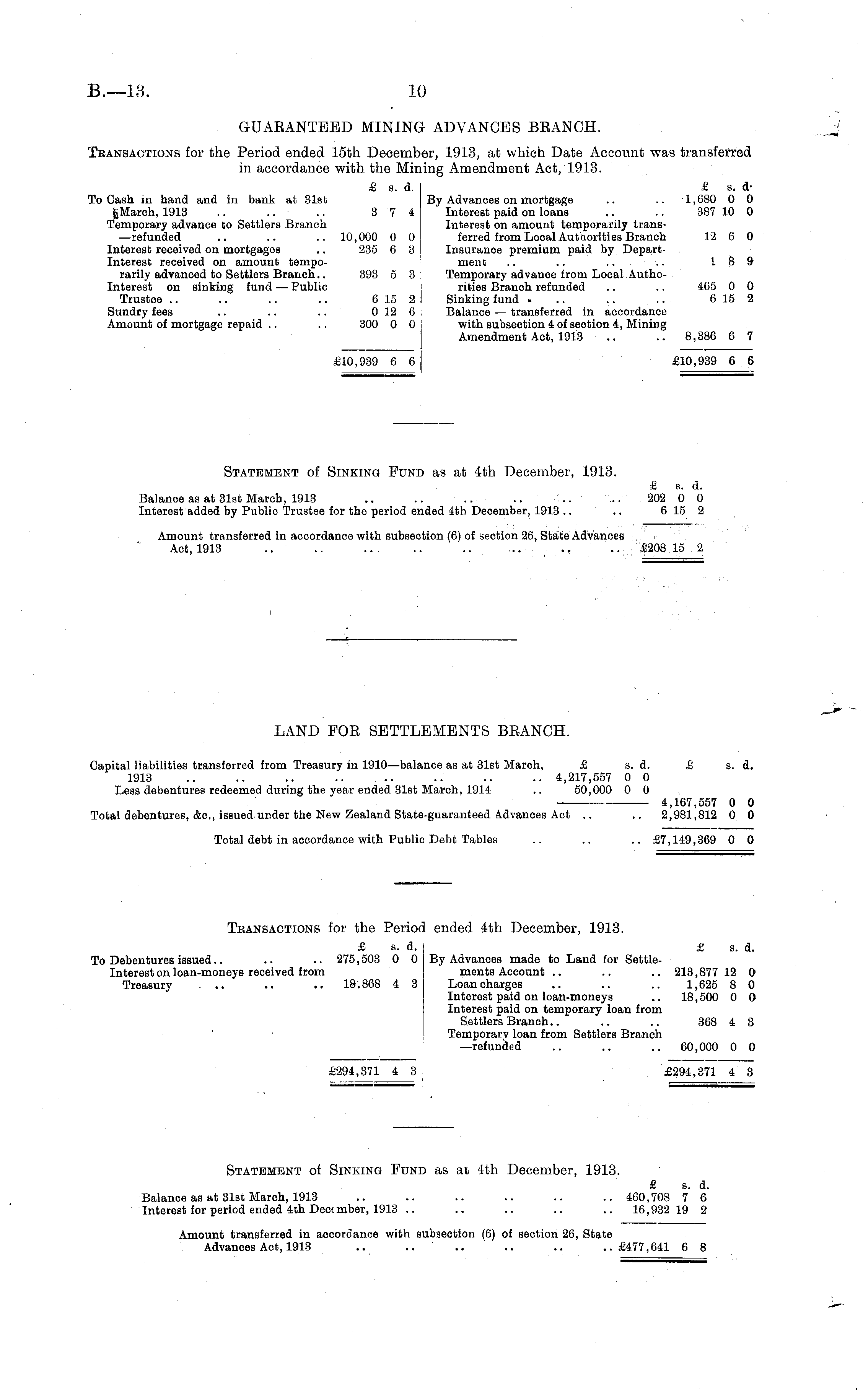 Transactions for the Period ended 4th December, 1913. £ s. d. £ s. d. To Debentures issued.. .. .. 275,503 0 0 By Advances made to Land for SettleInterest on loan-moneys received from ments Account .. .. .. 213,877 12 0 Treasury - .. .. .. 18.868 4 3 Loan charges .. .. .. 1,625 8 0 Interest paid on loan-moneys .. 18,500 0 O Interest paid on temporary loan from Settlers Branoh.. .. .. 368 4 3 Temporary loan from Settlers Branch —refunded .. .. .. 60,000 0 0 £294,371 4 3 £294,371 4 3 Statement of Sinking Fund as at 4th December, 1913. S. s. d. Balance as at 31st March, 1913 .. .. .. .. .. .. 460,708 7 6 Interest for period ended 4th Decimber, 1913 .. .. .. .. .. 16,932 19 2 Amount transferred in accordance with subsection (6) of section 26, State Advances Act, 1913 .. .. .. .. .. ..£477,641 6 8