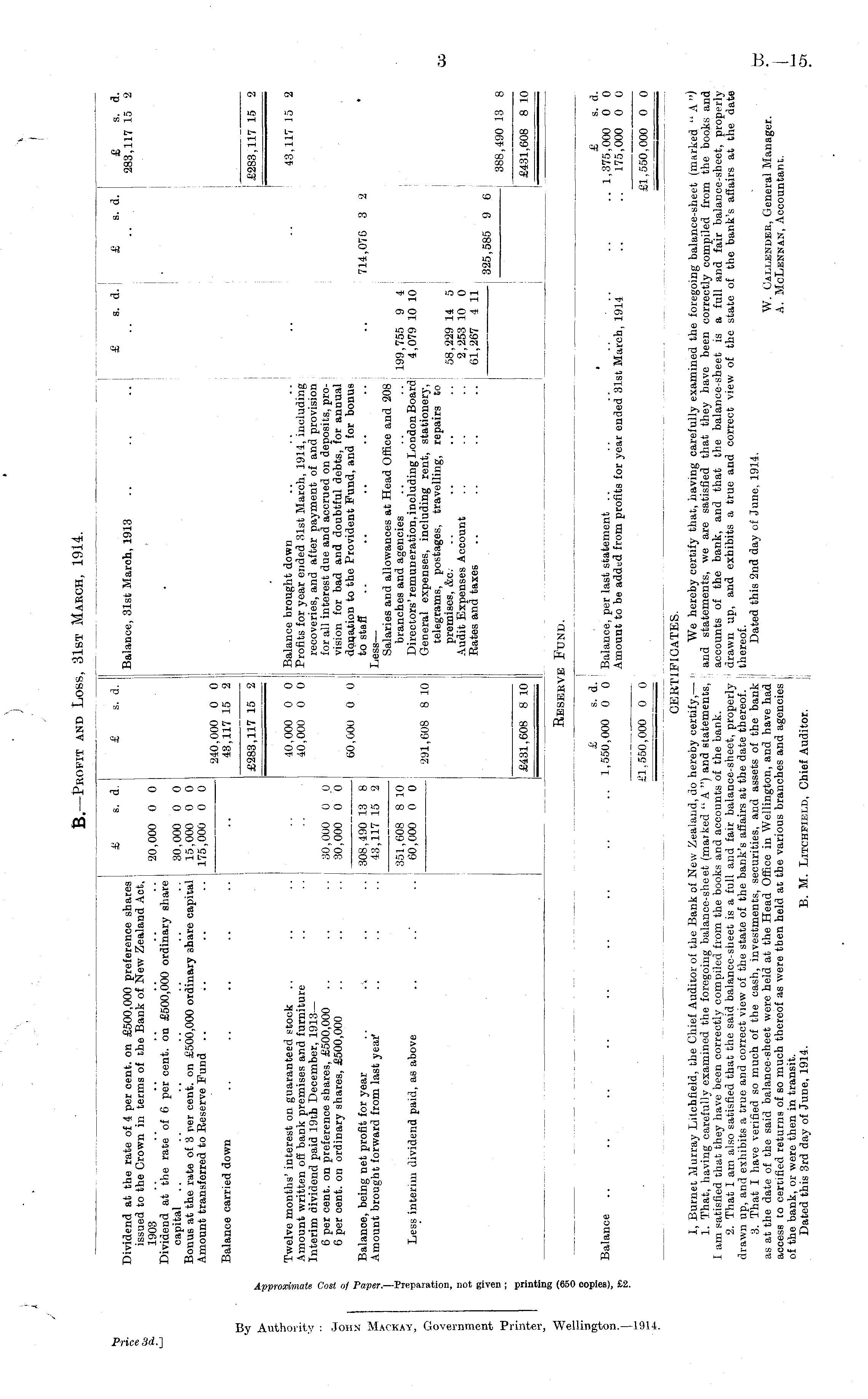 We hereby certify that, having carefully examined the foregoing balance-sheet (marked "A") and statements, we are satisfied that they have been correctly compiled from the books and accounts of the bank, and that the balance-sheet is a full and fair balance-sheet, properly drawn up, and exhibits a true and correct view of the state of the bank's affairs at the date thereof. Dated this 2nd day of June, 1914. W. Gallkndeb, General Manager. A. McLenkan, Accountant.