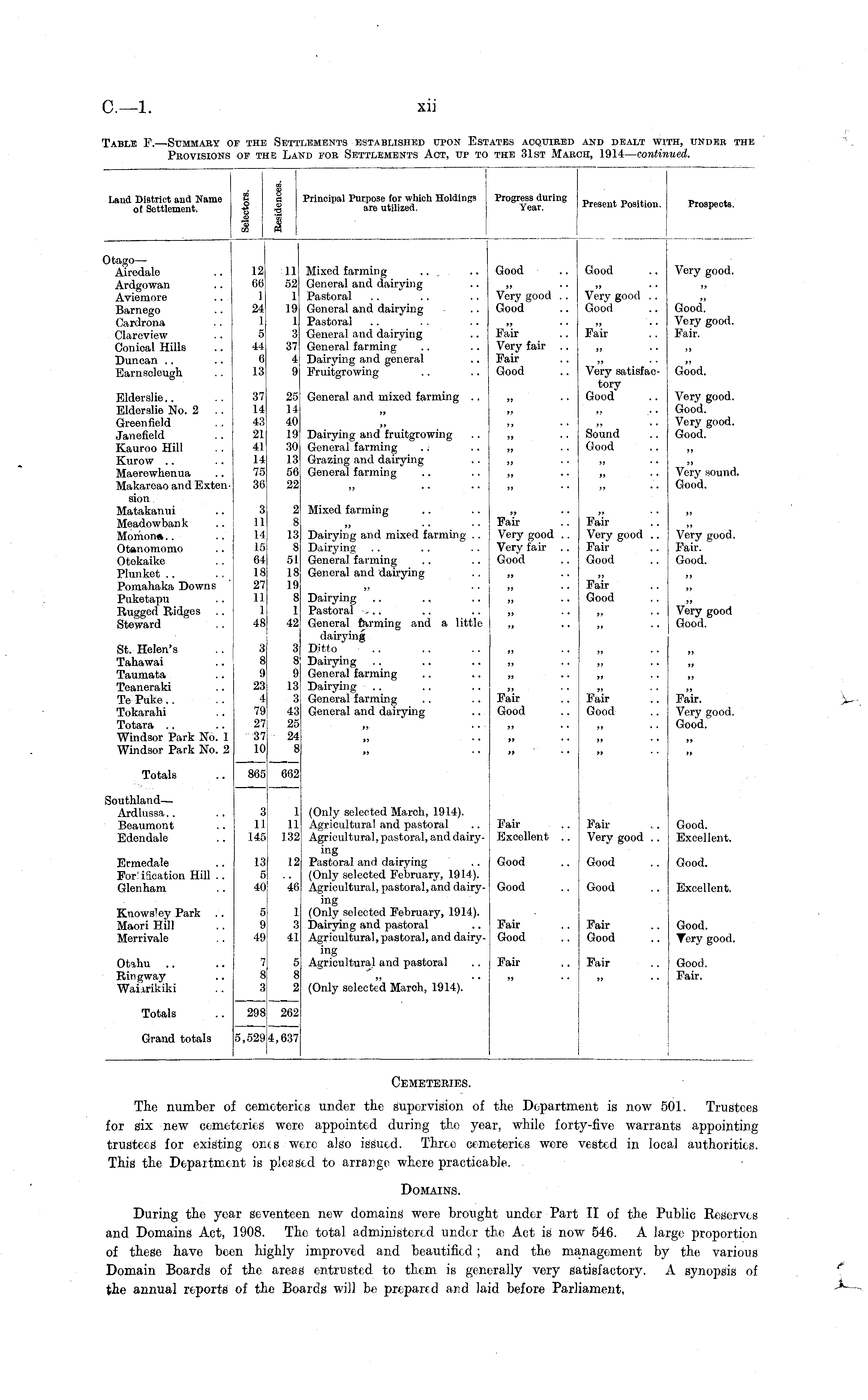 Cemetebies. The number of cemeteries under tho supervision of the Department is now 501. Trustees for six new cemeteries were appointed during tho year, while forty-five warrants appointing trustees for existing oihS wore also issued. Three cemeteries were vested in local authorities. This the Department is pleased to arrange where practicable. Domains. During the year Seventeen new domains were brought under Part II of the Public Reserves and Domains Act, 1908. Tho total administered under the Act is now 546. A largo proportion of these have been highly improved and beautified; and the management by the various Domain Boards of the areas entrusted to them is generally very Satisfactory. A synopsis of the annual reports of the Boards will be prepared and laid before Parliament,