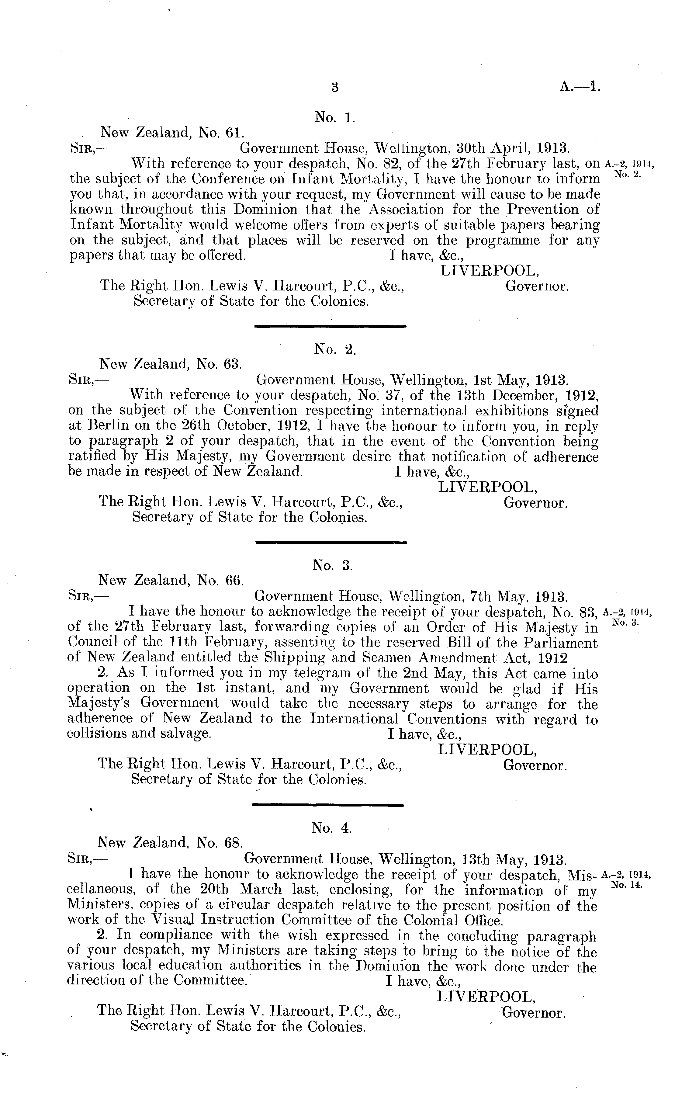 No. 3. New Zealand, No. 66. Sir, — Government House, Wellington, 7th May, 1913. I have the honour to acknowledge the receipt of your despatch, No. 83, of the 27th February last, forwarding copies of an Order of His Majesty in Council of the 11th February, assenting to the reserved Bill of the Parliament of New Zealand entitled the Shipping and Seamen Amendment Act, 1912 2. As I informed you in my telegram of the 2nd May, this Act came into operation on the Ist instant, and my Government would be glad if His Majesty's Government would take the necessary steps to arrange for the adherence of New Zealand to the International Conventions with regard to collisions and salvage. I have, &c, LIVERPOOL, The Right Hon. Lewis V. Harcourt, P.C., &c, Governor. Secretary of State for the Colonies.