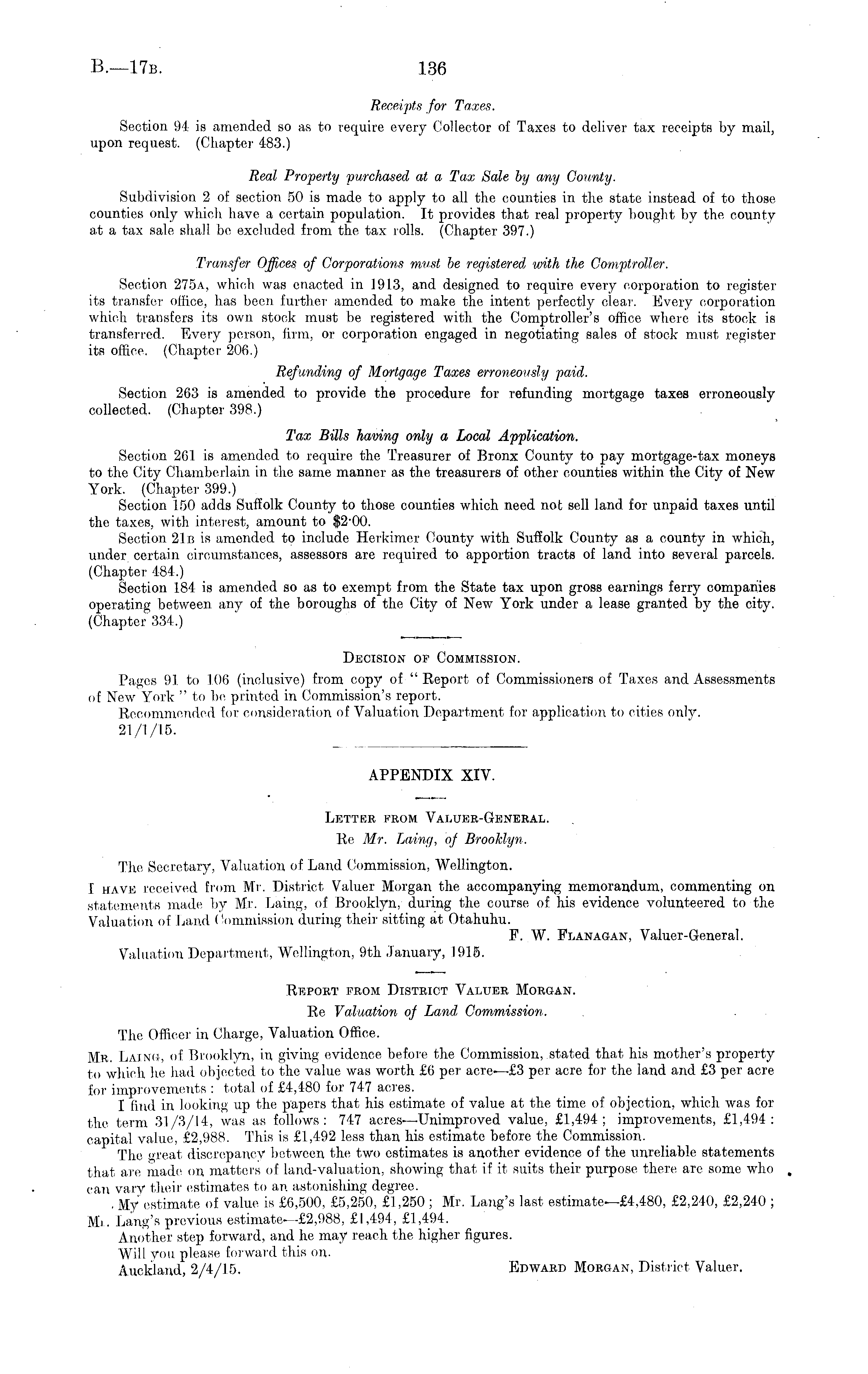 Receipts for Taxes. Section 94 is amended so as to require every Collector of Taxes to deliver tax receipts by mail, upon request. (Chapter 483.) Real Property purchased at a Tax Sale by any County. Subdivision 2 of section 50 is made to apply to all the counties in the state instead of to those counties only which have a certain population. It provides that real property bought by the, county at a tax sale shall bo excluded from the tax rolls. (Chapter 397.) Transfer Offices of Corporations must be registered, with the Comptroller. Section 275 a, which was enacted in 1913, and. designed to require every corporation to register its transfer office, has been further amended to make the intent perfectly clear. Every corporation which transfers its owii stock must be registered with the Comptroller's office where its stock is transferred. Every person, firm, or corporation engaged in negotiating sales of stock must register its office. (Chapter 206.) Refunding of Mortgage Taxes erroneously paid. Section 263 is amended to provide the procedure for refunding mortgage taxes erroneously collected. (Chapter 398.) Tax Bills having only a Local Application. Section 261 is amended to require the Treasurer of Bronx County to pay mortgage-tax moneys to the City Chamberlain in the same manner as the treasurers of other counties within the City of New York. (Chapter 399.) Section 150 adds Suffolk County to those counties which need not sell land for unpaid taxes until the taxes, with interest, amount to $2 - 00. Section 21b is amended to include Herkimer County with Suffolk County as a county in which, under certain circumstances, assessors are required to apportion tracts of land into several parcels. (Chapter 484.) Section 184 is amended so as to exempt from the State tax upon gross earnings ferry companies operating between, any of the boroughs of the City of New York under a lease granted by the city. (Chapter 334.) Decision of Commission. Pages 91 to 106 (inclusive) from copy of " Report of Commissioners of Taxes and Assessments of New York " to he printed in Commission's report. Recommended for consideration of Valuation Department for application to cities only. 21/1/15.