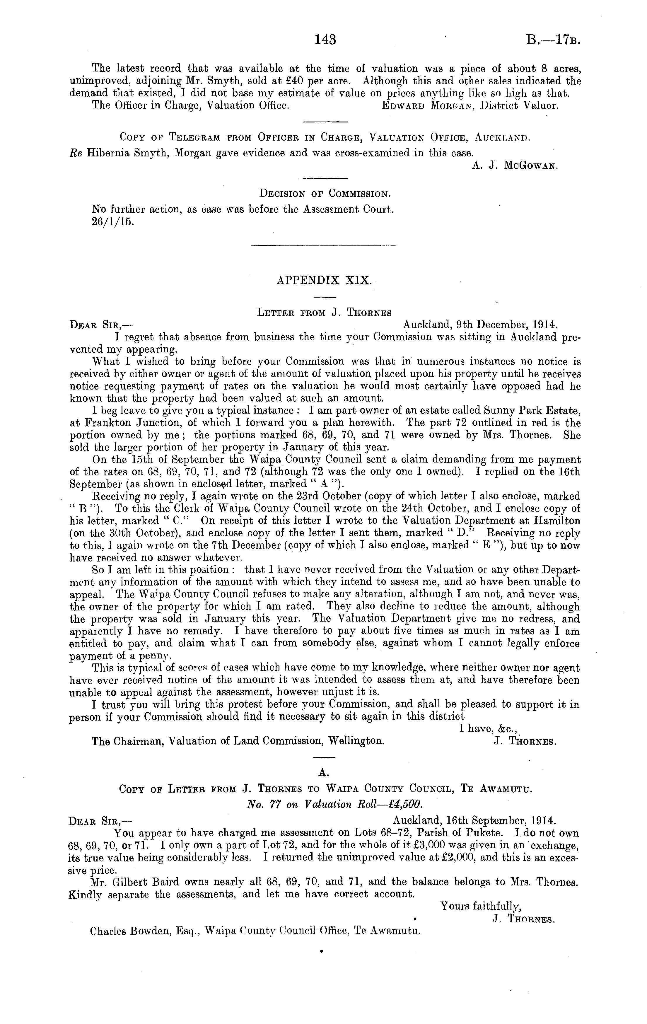 The latest record that was available at the time of valuation was a piece of about 8 acres, unimproved, adjoining Mr. Smyth, sold at £40 per acre. Although this and other sales indicated the demand that existed, I did not base my estimate of value on prices anything like, so high as that. The Officer in Charge, Valuation Office. Edward Morgan, District Valuer. Copy of Telegram from Officer in Charge, Valuation Office, Auckland. Re Hibernia Smyth, Morgan gave evidence and was cross-examined in this case. A. J. McGowan. Decision of Commission. No further action, as case was before the Assessment Court. 26/1/15.