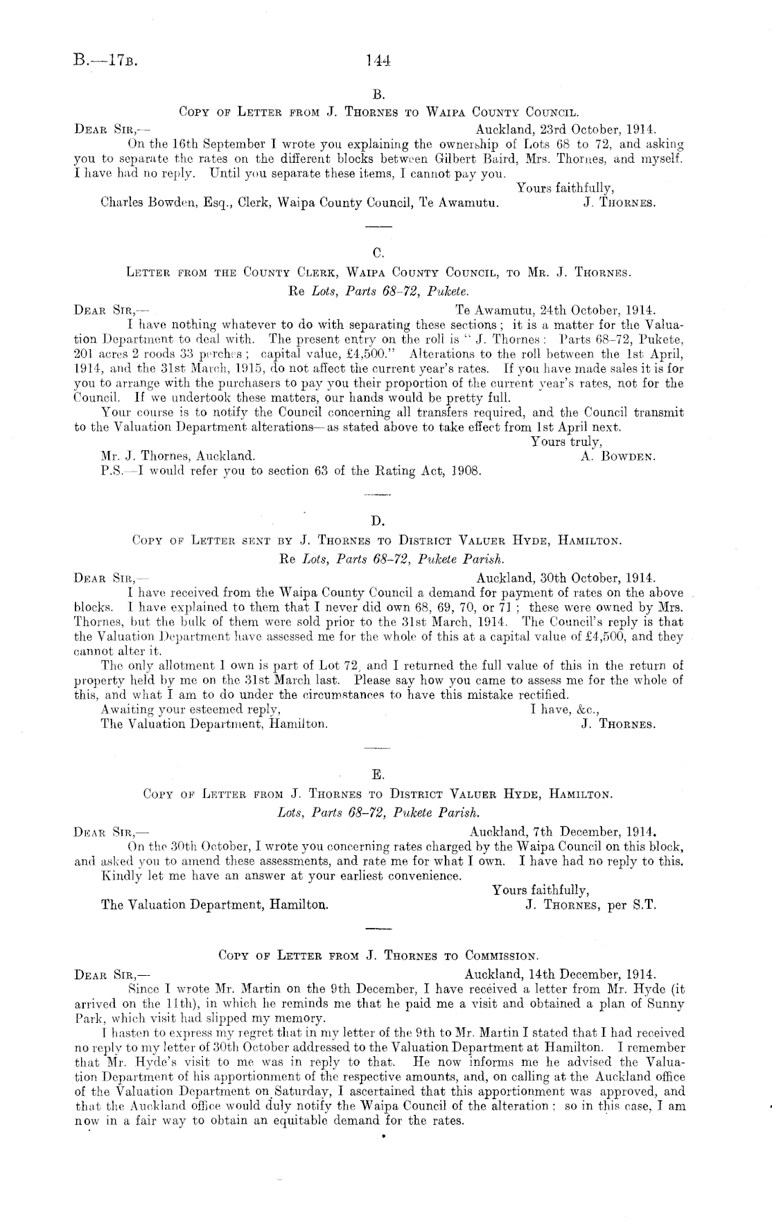 B. Copy of Letter from J. Thornes to Waipa County Council. Dear Sir, — Auckland, 23rd October, 1914. On the 16th September I wrote you explaining the ownership of Lots 68 to 72, and asking you to separate the rates on the different blocks between Gilbert Baird, Mrs. Thornes, and myself. I have had no reply. Until you separate these items, I cannot pay you. Yours faithfully, Charles Bowden, Esq., Clerk, Waipa County Council, Te Awamutu. J. Thornes. C. Letter from the County Clerk, Waipa County Council, to Mr. J. Thornes. Re Lots, Parts 68-72, Pukete. Dear Sir, — Te Awamutu, 24th October, 1914. I have nothing whatever to do with separating these sections ; it is a matter for the Valuation Department to deal with. The present entry on the roll is "J. Thornes : Parts 68-72, Pukete, 201 acres 2 roods 33 perches ; capital value, £4,500." Alterations to the roll between the Ist April, 1914, and the 31st March, 1915, do not affect the current year's rates. If have made sales it is for you to arrange with the purchasers to pay you their proportion of the current year's rates, not for the Council. If we undertook these matters, our hands would be pretty full. Your course is to notify the Council concerning all transfers required, and the Council transmit to the Valuation Department alterations —as stated above to take effect from Ist April next. Yours truly, Mr. J. Thornes, Auckland. A. Bowden. P.S. —I would refer you to section 63 of the Rating Act, 1908. D. Copy of Letter sent by J. Thornes to District Valuer Hyde, Hamilton. Re Lots, Parts 68-72, Pukete Parish. Dear Sir, — Auckland, 30th October, 1914. I have received from the Waipa County Council a demand for payment of rates on the above blocks. I have explained to them that I never did own 68, 69, 70, or 71 ; these were owned by Mrs. Thornes, but the bulk of them were sold prior to the 31st March, 1914. The Council's reply is that the Valuation Department have assessed me for the whole of this at a capital value of £4,500, and they cannot alter it. The only allotment I own is part of Lot 72; and I returned the full value of this in the return of property held by me on the 31 st March, last. Please say how you came to assess me for the whole of this, and what I am to do under the circumstances to have this mistake rectified. Awaiting your esteemed reply, I have, &c, The Valuation Department, Hamilton. J. Thornes. E. Copy of Letter from J. Thornes to District Valuer Hyde, Hamilton. Lots, Parts 68-72, Pukete Parish. Dear Sir, — Auckland, 7th December, 1914. On the 30th October, I wrote you concerning rates charged by the Waipa Council on this block, and asked you to amend these assessments, and rate me for what I own. I have had no reply to this. Kindly let me have an answer at your earliest convenience. Yours faithfully, The Valuation Department, Hamilton. J. Thornes, per S.T. Copy of Letter from J. Thornes to Commission. Dear Sir, — Auckland, 14th December, 1914. Since I wrote Mr. Martin on the 9th December, I have received a letter from Mr. Hyde (it arrived on the 11th), in which he reminds me that he paid me a visit and obtained a plan of Sunny Park, which visit had slipped my memory. I hasten to express my regret that in my letter of the 9th to Mr. Martin I stated that I had received no reply to my letter of 30th October addressed to the Valuation Department at Hamilton. I remember that Mr. Hyde's visit to me was in reply to that. He now informs me he advised the Valuation Department of his apportionment of the respective amounts, and, on calling at the Auckland office of the Valuation Department on Saturday, I ascertained that this apportionment was approved, and that the Auckland office would duly notify the Waipa Council of the alteration ; so in this case, I am now in a fair way to obtain an equitable demand for the rates.