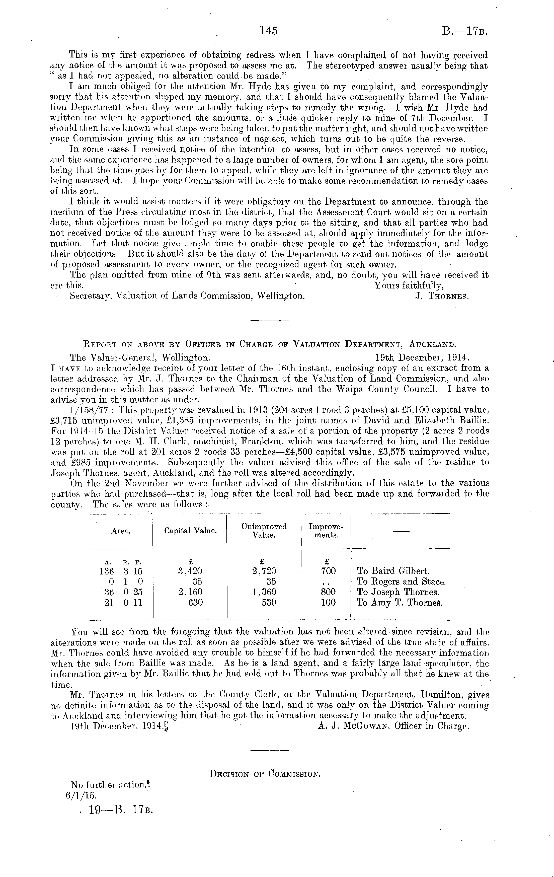 You will see from the foregoing that the valuation has not been altered since revision, and the alterations were made on the roll as soon as possible after we were advised of the true state of affairs. Mr. Thornes could have avoided any trouble, to himself if he had forwarded the necessary information when the sale from Baillie was made. As he is a land agent, and a fairly large land speculator, the information given by Mr. Baillie that he had sold out to Thornes was probably all that he knew at the time. Mr. Thornes in his letters to the County Clerk, or the Valuation Department, Hamilton, gives no definite information as to the disposal of the land, and it was only on the District Valuer coming to Auckland and interviewing him that he got the information necessary to make the adjustment. 19th December, 1914.j A. J. McGowan, Officer in Charge. Decision of Commission. No further action.'! 6/1 /l 5.