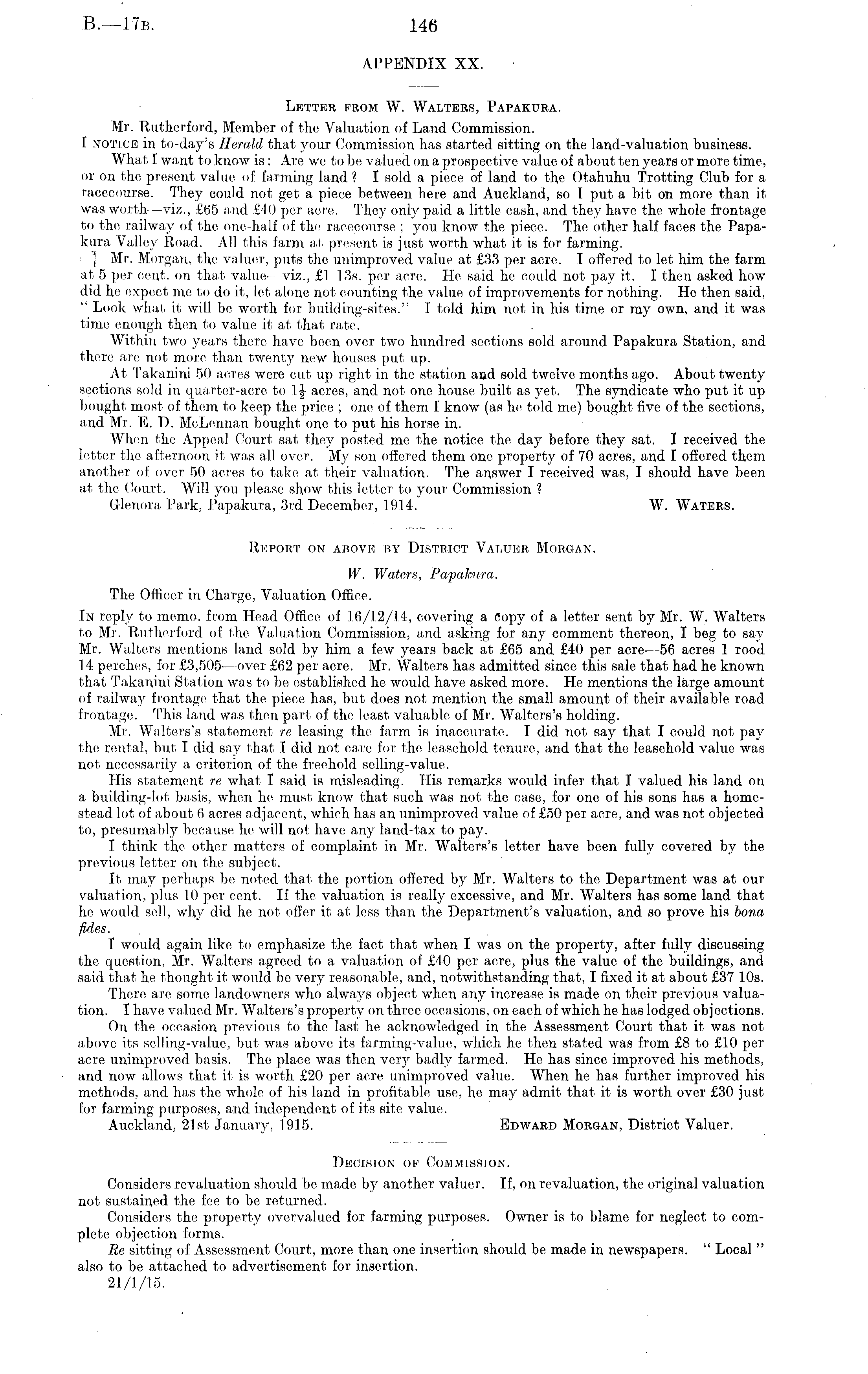 APPENDIX XX. Letter from W. Walters, Papakura. Mr. Rutherford, Member of the Valuation of Land Commission. I notice in to-day's Herald that your Commission has started sitting on the land-valuation business. What I want to know is : Are we to be valued on a prospective value of about ten years or more time, or on the present value of farming land ? I sold a piece of land to the Otahuhu Trotting Club for a racecourse. They could not get a piece between here and Auckland, so I put a bit on more than it was worth—viz., £65 and £40 per acre. They only paid a little cash, and they have the whole frontage to the railway of the one-half of the racecourse ; you know the piece. The other half faces the Papakura Valley Road. AH this farm at present is just worth what it is for farming. | Mr. Morgan, the valuer, puts tho unimproved value at £33 per acre. I offered to let him the farm at 5 per cent, on that value- viz., £1 13s. per acre. He said he could not pay it. I then asked how did he expect me to do it, let alone not counting the value of improvements for nothing. Ho then said, " Look what it will be worth for building-sites." I told him not in his time or my own, and it was time enough then to value it at that rate. Within two years there have been over two hundred sections sold around Papakura Station, and there are not more than twenty new houses put up. At Takanini 50 acres Were cut up right in the station and sold twelve months ago. About twenty sections sold in quarter-acre to If acres, and not one house built as yet. The syndicate who put it up bought most of them to keep the price ; one of them I know (as he told me) bought five of the sections, and Mr. E. D. McLennan bought one to put his horse in. When the Appeal Court sat they posted me the notice the day before they sat. I received the letter the afternoon it was all over. My son offered them one property of 70 acres, and I offered them another of over 50 acres to take at their valuation. The answer I received was, I should have been at the Court. Will you please show this letter to your Commission ? Glenora Park, Papakura, 3rd December, 1914. W. Waters. Report on above by District Valuer Morgan. W. Waters, Papakura. The Officer in Charge, Valuation Office. In reply to memo, from Head Office of 16/12/14, covering a Copy of a letter sent by Mr. W. Walters to Mr. Rutherford of the Valuation Commission, and asking for any comment thereon, I beg to sayMr. Walters mentions land sold by him a few years back at £65 and £40 per acre—s6 acres 1 rood 14 perches, for £3,505 —over £62 per acre. Mr. Walters has admitted since this sale that had he known that Takanini Station was to be established he would have asked more. He mentions the large amount of railway frontage that the piece has, but does not mention the small amount of their available road frontage. This land was then part of the least valuable of Mr. Walters's holding. Mr. Walters's statement re leasing the farm is inaccurate. I did not say that I could not pay the rental, but I did say that I did not care for the leasehold tenure, and that the leasehold value was not necessarily a criterion of the freehold selling-value. His statement re what I said is misleading. His remarks would infer that I valued his land on a building-lot basis, when he must know that such was not the case, for one of his sons has a homestead lot of about 6 acres adjacent, which has an unimproved value of £50 per acre, and was not objected to, presumably because he will not have any land-tax to pay. I think the other matters of complaint in Mr. Walters's letter have been fully covered by the previous letter on the subject. It may perhaps be noted that the portion offered by Mr. Walters to the Department was at our valuation, plus 10 per cent. If the valuation is really excessive, and Mr. Walters has some land that he would sell, why did he not offer it at less than the Department's valuation, and so prove his bona fides. I would again like to emphasize the fact that when I was on the property, after fully discussing the question, Mr. Walters agreed to a valuation of £40 per acre, plus the value of the buildings, and said that he thought it Would be very reasonable, and, notwithstanding that, I fixed it at about £37 10s. There are some landowners who always object when any increase is made on their previous valuation. I have valued Mr. Walters's property on three occasions, on each of which he has lodged objections. On the occasion previous to the last he acknowledged in the Assessment Court that it was not above its selling-value, but was above its farming-value, which he then stated was from £8 to £10 per acre unimproved basis. The place was then very badly farmed. He has since improved his methods, and now allows that it is worth £20 per acre unimproved value. When he has further improved his methods, and has the whole of his land in profitable use, he may admit that it is worth over £30 just for farming purposes, and independent of its site value. Auckland, 21st January, 1915. Edward Morgan, District Valuer. Decision of Commission. Considers revaluation should be made by another valuer. If, on revaluation, the original valuation not sustained the fee to be returned. Considers the property overvalued for farming purposes. Owner is to blame for neglect to complete objection forms. Re sitting of Assessment Court, more than one insertion should be made in newspapers. " Local " also to be attached to advertisement for insertion. 21/1/15.