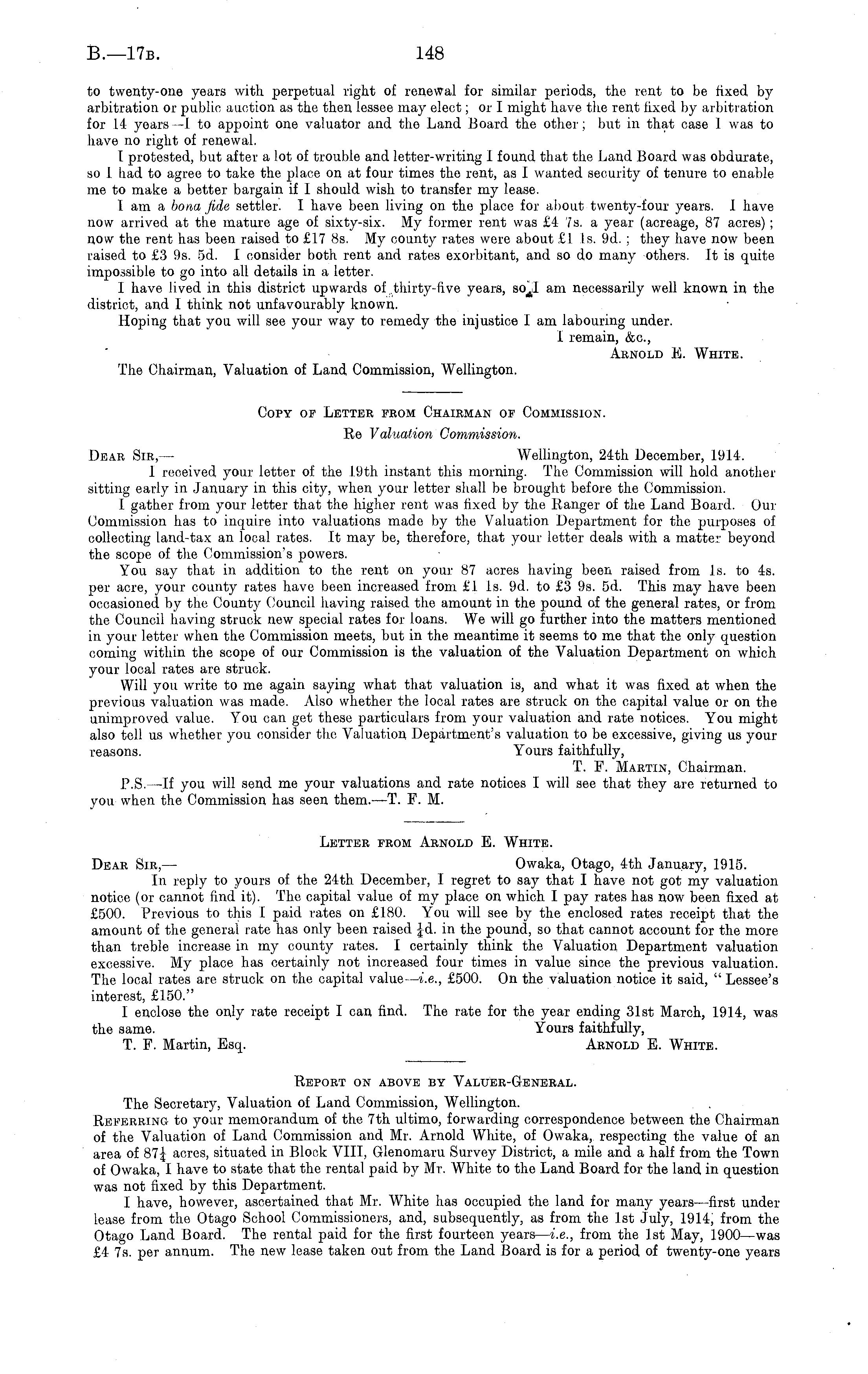 to twenty-one years with perpetual right of renewal for similar periods, the rent to be fixed by arbitration or public auction as the then lessee may elect; or I might have the rent fixed by arbitration for 14 years—l to appoint one valuator and the Land Board the other; but in that case 1 was to have no right of renewal. I protested, but after a lot of trouble and letter-writing 1 found that the Land Board was obdurate, so 1 had to agree to take the place on at four times the rent, as I wanted security of tenure to enable me to make a better bargain if I should wish to transfer my lease. lam a bona fide settler. I have been living on the place for about twenty-four years. 1 have now arrived at the mature age of sixty-six. My former rent was £4 7s. a year (acreage, 87 acres) ; now the rent has been raised to £17 Bs. My county rates were about £1 Is. 9d. ; they have now been raised to £3 9s. sd. I consider both, rent and rates exorbitant, and so do many others. It is quite impossible to go into all details in a letter. I have lived in this district upwards of thirty-five years, am necessarily well known in the district, and I think not unfavourably known. Hoping that you will see your way to remedy the injustice I am labouring under. I remain, &c, Arnold E. White. The Chairman, Valuation of Land Commission, Wellington. Copy of Letter from Chairman of Commission. Re Valuation Commission. Dear Sir,— Wellington, 24th December, 1914. 1 received your letter of the 19th instant this morning. The Commission will hold another sitting early in January in this city, when your letter shall be brought before the Commission. I gather from your letter that the higher rent was fixed by the Ranger of the Land Board. Our Commission has to inquire into valuations made by the Valuation Department for the purposes of collecting land-tax an local rates. It may be, therefore, that your letter deals with a matter beyond the scope of the Commission's powers. You say that in addition to the rent on your 87 acres having been raised from Is. to 4s. per acre, your county rates have been increased from £.1 Is. 9d. to £3 9s. sd. This may have been occasioned by the County Council having raised the amount in the pound of the general rates, or from the Council having struck new special rates for loans. We will go further into the matters mentioned in your letter when the Commission meets, but in the meantime it seems to me that the only question coming within the scope of our Commission is the valuation of the Valuation Department on which your local rates are struck. Will you write to me again saying what that valuation is, and what it was fixed at when the previous valuation was made. Also whether the local rates are struck on the capital value or on the unimproved value. You can get these particulars from your valuation and rate notices. You might also toll us whether you consider the Valuation Department's valuation to be excessive, giving us your reasons. Yours faithfully, T. P. Martin, Chairman. P.S. —If you will send me your valuations and rate notices I will soe that they are returned to you when the Commission has seen them. —T. F. M. Letter from Arnold E. White. Dear Sir, — Owaka, Otago, 4th January, 1915. In reply to yours of the 24th December, I regret to say that I have not got my valuation notice (or cannot find it). The capital value of my place on which I pay rates has now been fixed at £500. Previous to this I paid rates on £180. You will see by the enclosed rates receipt that the amount of the general rate has only been raised ]d. in the pound, so that cannot account for the more than treble increase in my county rates. I certainly think the Valuation Department valuation excessive. My place has certainly not increased four times in value since the previous valuation. The local rates are struck on the capital value— i.e., £500. On the valuation notice it said, " Lessee's interest, £150." I enclose the only rate receipt I can find. The rate for the year ending 31st March, 1914, was the same. Yours faithfully, T. F. Martin, Esq. Arnold E. White. Report on above by Valuer-General. The Secretary, Valuation of Land Commission, Wellington. Referring to your memorandum of the 7th ultimo, forwarding correspondence between the Chairman of the Valuation of Land Commission and Mr. Arnold White, of Owaka, respecting the value of an area of 87| acres, situated in Block VIII, Glenomaru Survey District, a mile and a half from the Town of Owaka, I have to state that the rental paid by Mr. White to the Land Board for the land in question was not fixed by this Department. I have, however, ascertained that Mr. White has occupied the land for many years—first underlease from the Otago School Commissioners, and, subsequently, as from the Ist July, 1914, from the Otago Land Board. The rental paid for the first fourteen years — i.e., from the Ist May, 1900—was £4 7s. per annum. The new lease taken out from the Land Board is for a period of twenty-one years
