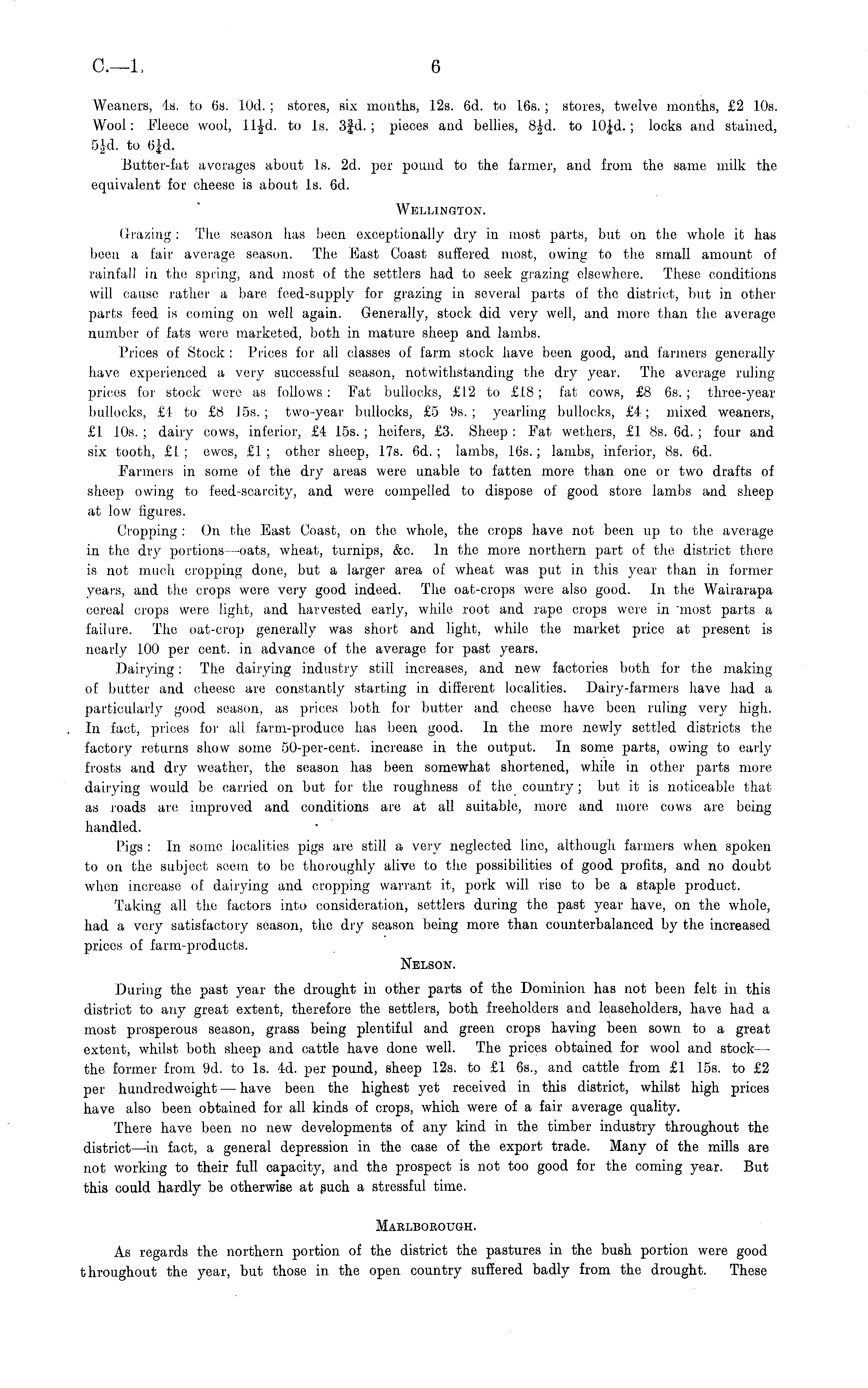 Weaners, 4s. to 6s. lOd. ; stores, six months, 12s. 6d. to 16s. ; stores, twelve months, £2 10s. Wool: Fleece wool, 11-|-d. to Is. 3|d. ; pieces and bellies, B|-d. to ; locks and stained, 5Jd. to 6£d. Butter-fat averages about Is. 2d. per pound to the farmer, and from the same milk the equivalent for cheese is about Is. 6d. Wellington. Crazing: The. season has been exceptionally dry in most parts, but on the whole it has been a fair average season. The East Coast suffered most, owing to the small amount of rainfall in the spring, and most of the settlers had to seek grazing elsewhere. These conditions will cause rather a bare feed-supply for grazing in several parts of the district, but in other parts feed is coming on well again. Generally, stock did very well, and more than the average number of fats were marketed, both in mature sheep and lambs. Prices of Stock : Prices for all classes of farm stock have been good, and farmers generally have experienced a very successful season, notwithstanding the dry year. The average ruling prices for stock were as follows: Fat bullocks, £12 to £18; fat cows, £8 65.; three-year bullocks, £4 to £8 155.; two-year bullocks, £5 95.; yearling bullocks, £4; mixed weaners, £1 10s. ; dairy cows, inferior, £4 15s. ; heifers, £3. Sheep : Fat wethers, £1 Bs. 6d. ; four and six tooth, £L ; ewes, £1; other sheep, 17s. 6d. ; lambs, 165.; lambs, inferior, Bs. 6d. Farmers in some of the dry areas were unable to fatten more than one or two drafts of sheep owing to feed-scarcity, and were compelled to dispose of good store lambs and sheep at low figures. Cropping : On the East Coast, on the whole, the crops have not been up to the average in the dry portions —oats, wheat, turnips, &c. In the more northern part of the district there is not much cropping done, but a larger area of wheat was put in this year than in former years, and the crops were very good indeed. The oat-crops were also good. In the Wairarapa cereal crops were light, and harvested early, while root and rape crops were in 'most parts a failure. The oat-crop generally was short and light, while the market price at present is nearly 100 per cent, in advance of the average for past years. Dairying: The dairying industry still increases, and new factories both, for the making of butter and cheese are constantly starting in different localities. Dairy-farmers have had a particularly good season, as prices both tor butter and cheese have been ruling very high. In fact, prices for all farm-produce has been good. In the more newly settled districts the factory returns show some 50-per-cent. increase in the output. In some parts, owing to early frosts and dry weather, the season has been somewhat shortened, while in other parts more dairying would be carried on but for the roughness of the country; but it is noticeable that as roads are improved and conditions are at all suitable, more and more cows are being handled. Pigs : In some localities pigs are still a very neglected line, although, farmers when spoken to on the subject seem to be thoroughly alive to the possibilities of good profits, and no doubt when increase of dairying and cropping warrant it, pork will rise to be a staple product. Taking all the factors into consideration, settlers during the past year have, on the whole, had a very satisfactory season, the dry season being more than counterbalanced by the increased prices of farm-products. Nelson. During the past year the drought in other parts of the Dominion has not been felt in this district to any great extent, therefore the settlers, both freeholders and leaseholders, have had a most prosperous season, grass being plentiful and green crops having been sown to a great extent, whilst both sheep and cattle have done well. The prices obtained for wool and stock — the former from 9d. to Is. 4d. per pound, sheep 12s. to £1 65., and cattle from £1 15s. to £2 per hundredweight — have been the highest yet received in this district, whilst high prices have also been obtained for all kinds of crops, which were of a fair average quality. There have been no new developments of any kind in the timber industry throughout the district —in fact, a general depression in the case of the export trade. Many of the mills are not working to their full capacity, and the prospect is not too good for the coming year. But this could hardly be otherwise at guch a stressful time. Marlborough. As regards the northern portion of the district the pastures in the bush portion were good throughout the year, but those in the open country suffered badly from the drought. These
