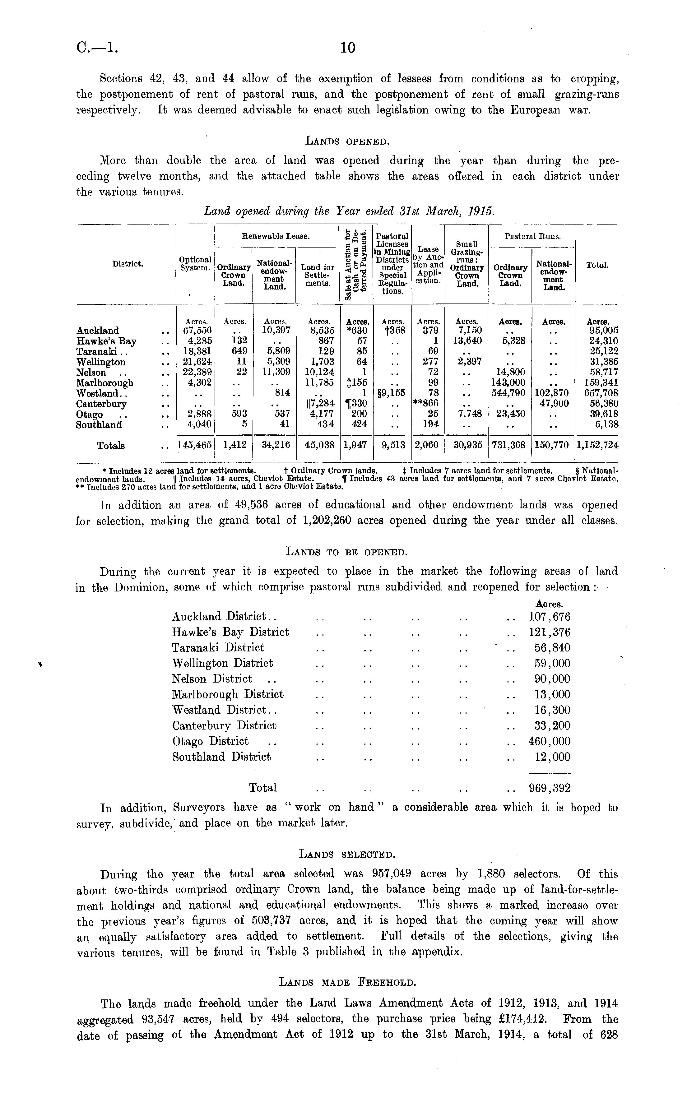 Sections 42, 43, and 44 allow of the exemption of lessees from conditions as to cropping, the postponement of rent of pastoral runs, and the postponement of rent of small grazing-runs respectively. It was deemed advisable to enact such legislation owing to the European war. Lands opened. More than double the area of land was opened during the year than during the preceding twelve months, and the attached table shows the areas offered in each district under the various tenures.