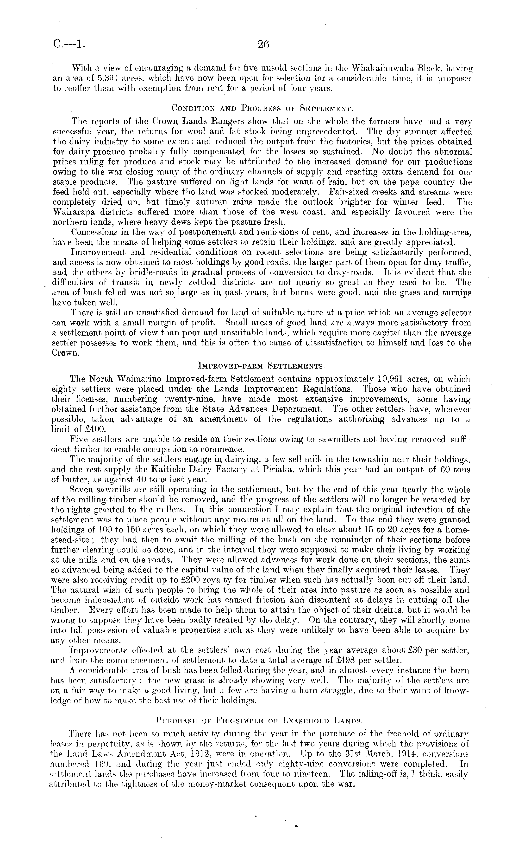 With a view of encouraging a demand for five unsold sections in the Whakaihuwaka Block, having an area of 5,391 acres, which have now been open for selection for a considerable time, it is proposed to reoffer them with exemption from rent for a period of four years. Condition and Progress of Settlement. The reports of the Crown Lands Rangers show that on the whole the farmers have had a very successful year, the returns for wool and fat stock being unprecedented. The dry summer affected the dairy industry to some extent and reduced the output from the factories, but the prices obtained for dairy-produce probably fully compensated for the losses so sustained. No doubt the abnormal prices ruling for produce and stock may be attributed to the increased demand for our productions owing to the war closing many of the ordinary channels of supply and creating extra demand for our staple products. The pasture suffered on light lands for want of rain, but on the papa country the feed held out, especially where the land was stocked moderately. Fair-sized creeks and streams were completely dried up, but timely autumn rains made the outlook brighter for winter feed. The Wairarapa districts suffered more than those of the west coast, and especially favoured were the northern lands, where heavy dews kept the pasture fresh. Concessions in the way of postponement and remissions of rent, and increases in the holding-area, have been the means of helping some settlers to retain their holdings, and are greatly appreciated. Improvement and residential conditions on recent selections are being satisfactorily performed, and access is now obtained to most holdings by good roads, the larger part of them open for dray traffic, and the others by bridle-roads in gradual process of conversion to dray-roads. It is evident that the difficulties of transit in newly settled districts are not nearly so great as they used to be. The area of bush felled was not so large as in past years, but burns were good, and the grass and turnips have taken well. There is still an unsatisfied demand for land of suitable nature at a price which an average selectorcan work with a small margin of profit. Small areas of good land are always more satisfactory from a settlement point of view than poor and unsuitable lands, which require more capital than the average settler possesses to work them, and this is often the cause of dissatisfaction to himself and loss to the Crown. Improved-farm Settlements. The North Waimarino Improved-farm Settlement contains approximately 10,961 acres, on which eighty settlers were placed under the Lands Improvement Regulations. Those who have obtained their licenses, numbering twenty-nine, have made most extensive improvements, some having obtained further assistance from the State Advances Department. The other settlers have, whereverpossible, taken advantage of an amendment of the regulations authorizing advances up to a, limit of £400. Five settlers are unable to reside on their sections owing to sawmillcrs not having removed sufficient timber to enable occupation to commence. The majority of the settlers engage in dairying, a few sell milk in the township near their holdings, and the rest supply the Kaitieke Dairy Factory at Piriaka, which this year had an output of 60 tons of butter, as against 40 tons last year. Seven sawmills are still operating in the settlement, but by the end of this year pearly the whole of the milling-timber should be removed, and the progress of the settlers will no longer be retarded by the rights granted to the millers. In this connection I may explain that the original intention of the settlement was to place people without any means at all on the land. To this end they were granted holdings of 100 to 150 acres each, on which they w-ere allowed to clear about 15 to 20 acres for a home-stead-site ; they had then to await the milling of the bush on the remainder of their sections before further clearing could be done, and in the interval they were supposed to make their living by working at the mills and on the roads. They were allowed advances for work done on their sections, the sums so advanced being added to the capital value of the land when they finally acquired their leases. They were also receiving credit up to £200 royalty for timber when such has actually been cut off their land. The natural wish of such people to bring the whole of their area into pasture as soon as possible and become independent of outside work has caused friction and discontent at delays in cutting off the timber. Every effort has been made to help them to attain the object of their desires, but it would be wrong to suppose they have been badly treated by the delay. On the contrary, they will shortly come into full possession of valuable properties such as they were unlikely to have been able to acquire by any other means. Improvements effected, at the settlers' own cost during the year average about £30 per settler-, and from the commencement of settlement to date a total average of £498 per settler. A considerable area of bush has been felled during the year, and in almost every instance the burn has been satisfactory ; the new grass is already showing very well. The majority of the settlers are on a fair way to make a good living, but a few are having a hard struggle, due to their want of knowledge of how to make the best use of their holdings. Purchase of Fee-simple ok Leasehold Lands. There has not been so much activity during the year in the purchase of the freehold of ordinary leases in perpetuity, as is shown by the returns, for the last two years during which the provisions of the Land Laws Amendment Act, 1912, were in operation. Up to the 31st March, 1914. conversions numbered 169, and during the year just ended only eighty-nine conversions were completed. In settlement lands the purchases have increased from four to nineteen. The falling-off is, I think, easily attributed to the tigh