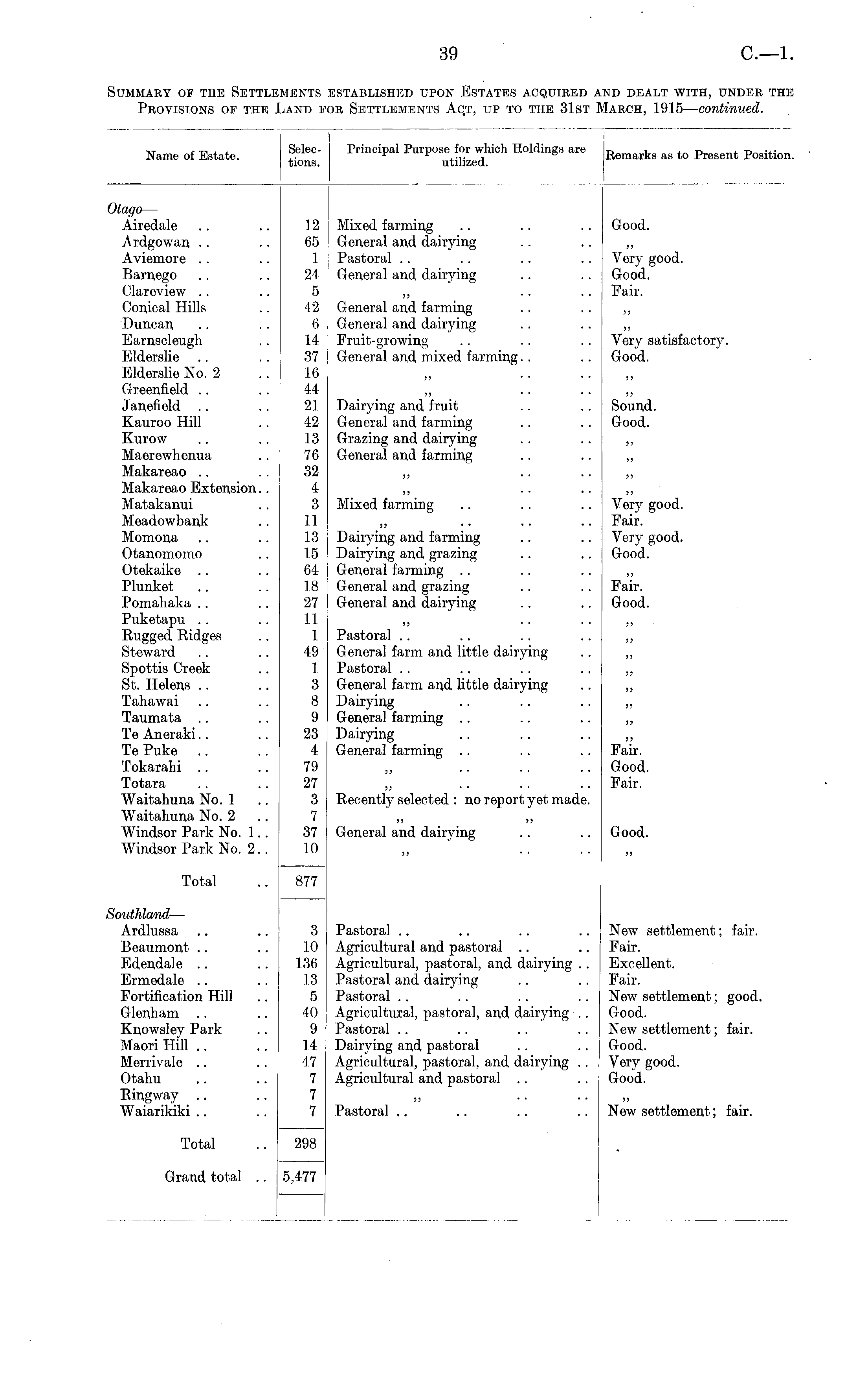 Name of Estate. Selections. Principal Purpose for which Holdings are utilized. Remarks as to Present Position. Otago — Airedale Ardgowan Aviemore Barnego Olareview Conical Hills Duncan Earnscleugh Elderslie Elderslie No. 2 Greenfield Janefield Kauroo Hill Kurow Maerewhenua Makareao Makareao Extension.. Matakanui Meadowbank Momona Otanomomo Otekaike Plunket Pomahaka Puketapu Rugged Ridges Steward Spottis Creek St. Helens Tahawai Taumata Te Aneraki Te Puke Tokarahi Totara Waitahuna No. 1 Waitahuna No. 2 Windsor Park No. 1.. Windsor Park No. 2.. 12 65 I 24 5 42 6 14 37 16 44 21 42 13 76 32 4 3 11 13 15 64 18 27 11 1 49 I 3 8 9 23 4 79 27 3 7 37 10 12 65 1 24 k 5 42 6 14 37 i a 44 21 42 13 76 oo 4 3 11 II 13 15 64 18 27 1 1 Mixed farming General and dairying Pastoral General and dairying General and farming General and dairying Fruit-growing G eneral and mixed farming ,, . . . . ,, Dairying and fruit General and farming Grazing and dairying General and farming ,, . . . . ,, . . . . Mixed farming Dairying and farming Dairying and grazing General farming General and grazing General and dairying Good. Very good. Good. Fair. J) ii Very satisfactory. Good. . j Sound. Good. H . ) a a Very good. Ei 1 ri . _. Fair. Very good. Good. ,, Fair. Good. Good. Very good. Good. Fair. J) a Very satisfactory. Good. . j Sound. Good. a a a a Very good. Fair. Very good. Good. Fair. Good. ,, . i . i 1 49 1 3 8 9 23 4 TO Pastoral General farm and little dairying Pastoral General farm and little dairying Dairying General farming Dairying General farming a a a a J? Fair, n— a .. a a a 55 a ,, Good. Fair. Good. Fair. 27 3 ,, . . . . . . Recently selected : no report yet made. Fair. 7 37 in General and dairying Good. Good. Total 10 877 ,, ,, ,, 877 Southland — Ardlussa Beaumont Edendale Ermedale Fortification Hill Glenham Knowsley Park Maori Hill Merrivale Otahu Ringway Waiarikiki 3 10 136 13 5 40 9 14 47 7 7 7 3 10 136 13 5 40 9 14 47 7 1 Pastoral Agricultural and pastoral Agricultural, pastoral, and dairying .. Pastoral and dairying Pastoral Agricultural, pastoral, and dairying .. Pastoral Dairying and pastoral Agricultural, pastoral, and dairying . . Agricultural and pastoral .. New settlement; fair. Fair. Excellent. Fair. New settlement; good. Good. New settlement; fair. Good. Very good. Good. New settlement; fair. Fair. Excellent. Fair. New settlement; good. Good. New settlement; fair. Good. Very good. Good. ,, ,, New settlement; fair. Total 298 7 298 Pastoral New settlement; fair. Grand total .. 5,477 5,477
