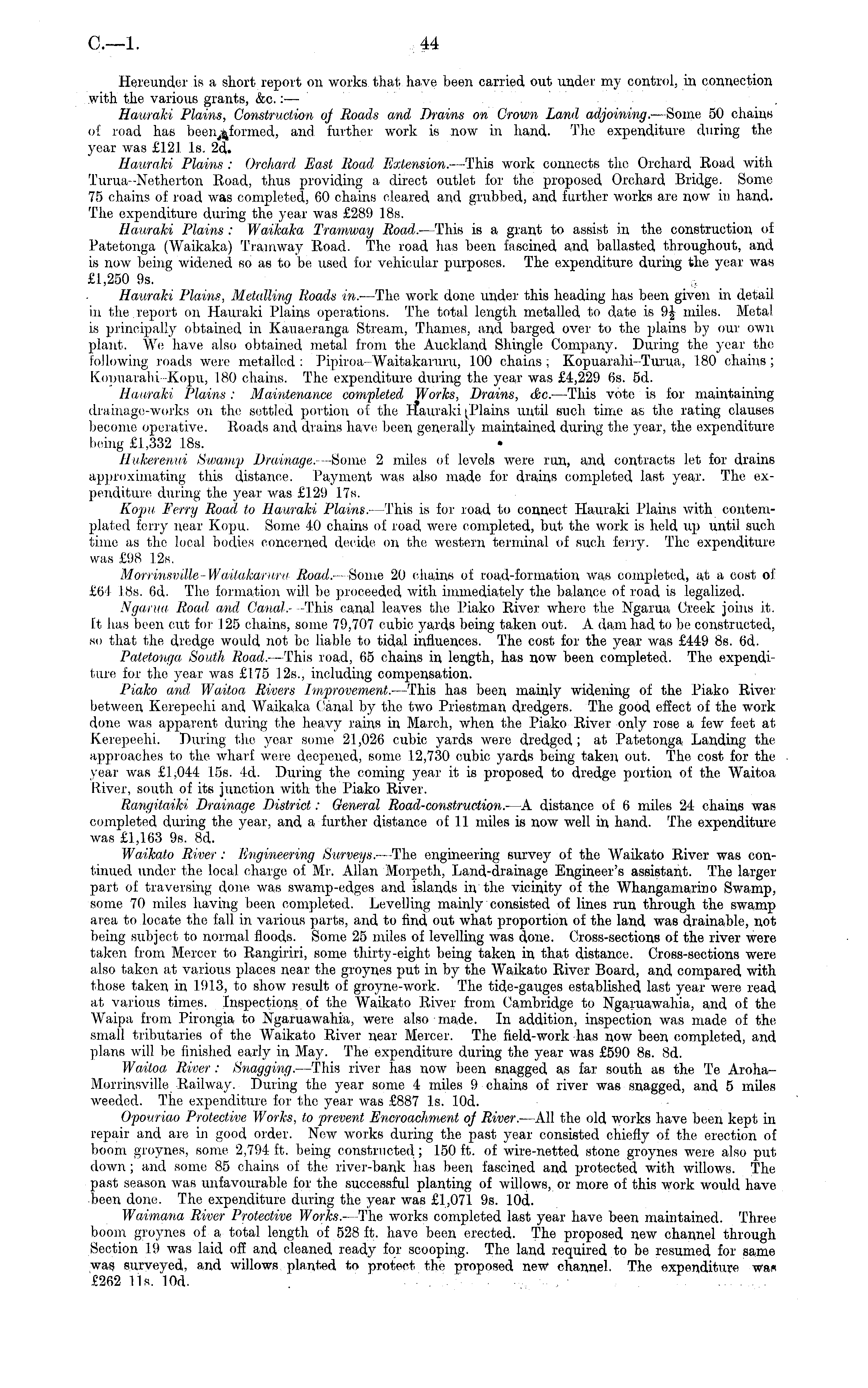 Hereunder is a short report on works that have been carried out under my control, in connection with the various grants, &c.: — Hauraki Plains, Construction of Roads and Drains on Crown Land adjoining. —Some 50 chains of road has beenjiformed, and further work is now in hand. The expenditure during the year was £121 Is. 2d. Hauraki, Plains : Orchard, East Road Extension. —This work connects the Orchard Road with Turua--Netherton Road, thus providing a direct outlet for the proposed Orchard Bridge. Some 75 chains of road was completed, 60 chains cleared and grubbed, and further works are now in hand. The expenditure during the year was £289 18s. Hauraki Plains : Waikaka Tramway Road. —This is a grant to assist in the construction of Patetonga (Waikaka) Tramway Road. The road has been fascined and ballasted throughout, and is now being widened so as to be used for vehicular purposes. The expenditure during the year was £1,250 9s. Hauraki Plains, Metalling Roads in. —The work done under this heading has been given in detail in the.report on Hauraki Plains operations. The total length metalled to date is 9J miles. Metal is principally obtained in Kauaeranga Stream, Thames, and barged over to the plains by our own plant. We have also obtained metal from the Auckland Shingle Company. During the year the following roads were metalled : Pipiroa-Waitakaruru, 100 chains; Kopuarahi-Turua, 180 chains; Kopuarahi-Kopii, 180 chains. The expenditure during the year was £4,229 6s. sd. Hauraki Plains: Maintenance completed Works, Drains, &c. —This vote is for maintaining drainage-works on the settled portion of the Hauraki (Plains until such time as the rating clauses become operative. Roads and, drains have been generally maintained during the year, the expenditure being £1,332 18s. Ilulcerenui Swamp Drainage.Some 2 miles of levels were run, and contracts let for drains approximating this distance. Payment was also made for drains completed last year. The expenditure during the year was £129 17s. Kopu Ferry Road to Hauraki Plains.- —This is for road to connect Hauraki Plains with contemplated ferry near Kopu. Some 40 chains of road were completed, but the work is held up until such time as the local bodies concerned decide on the western terminal of such ferry. The expenditure was £98 12s. Morrinsville~Waita/caru,ru Road. —Some 20 chains of road-formation was completed, at a cost of £64 18s. 6d. The formation will be proceeded with immediately the balance of road is legalized. Ngarua Road and Canal- -This canal leaves the Piako River where the Ngarua Creek joins it. It has been cut for 125 chains, some 79,707 cubic yards being taken out. A dam had to be constructed, so that the dredge would not be liable to tidal influences. The cost for- the year was £449 Bs. 6d. Patetonga South Road. —This road, 65 chains in length, has now been completed. The expenditure for the year was £175 125., including compensation. Piako and Waitoa Rivers Improvement. —This has been mainly widening of the Piako River between Kerepechi and Waikaka Canal by the two Priestman dredgers. The good effect of the work done was apparent during the heavy rains in March, when the Piako River only rose a few feet at Kerepeehi. During the year some 21,026 cubic yards were dredged; at Patetonga Landing the approaches to the wharf were deepened, some 12,730 cubic yards being taken out. The cost for the year was £1,044 15s. Id. During the coming year it is proposed to dredge portion of the Waitoa River, south of its junction with the Piako River. Rangitaiki Drainage District: General Road-construction. —A distance of 6 miles 24 chains was completed during the year, and a further distance of 11 miles is now well in hand. The expenditure was £1,163 9s. Bd. Waikato River: Engineering Surveys.—-The engineering survey of the Waikato River was continued under the local charge of Mr. Allan Morpeth, Land-drainage Engineer's assistant. The largerpart of traversing done was swamp-edges and islands in the vicinity of the Whangamarino Swamp, some 70 miles having been completed. Levelling mainly consisted of lines run through the swamp area to locate the fall in various parts, and to find out what proportion of the land was drainable, not being subject to normal floods. Some 25 miles of levelling was done. Cross-sections of the river were taken from Mercer to Rangiriri, some thirty-eight being taken in that distance. Cross-sections were also taken at various places near the groynes put in by the Waikato River Board, and compared with those taken in 1913, to show result of groyne-work. The tide-gauges established last year were read at various times. Inspections of the Waikato River from Cambridge to Ngaruawahia, and of the Waipa from Pirongia to Ngaruawahia, were also made. In addition, inspection was made of the small tributaries of the Waikato River near Mercer. The field-work has now been completed, and plans will be finished early in May. The expenditure during the year was £590 Bs. Bd. Waitoa River: Snagging. —This river has now been snagged as far south as the Te ArohaMorrinsville Railway. During the year some 4 miles 9 chains of river was snagged, and 5 miles weeded. The expenditure for the year was £887 Is. lOd. Opouriao Protective Works, to prevent, Encroachment of River. —All the old works have been kept in repair and are in good order. New works during the past year consisted chiefly of the erection of boom groynes, some 2,794 ft. being constructed; 150 ft. of wire-netted stone groynes were also put down; and some 85 chains of the river-bank has been fascined and protected with willows. The past season was unfavourable for the successful planting of willows, or more of this work would have been done. The expenditure during the year was £1,071 9s. lOd. Waimana River Protective Works. —The works completed last year have been maintained. Three boom groynes of a total length of 528 ft. have been erected. 