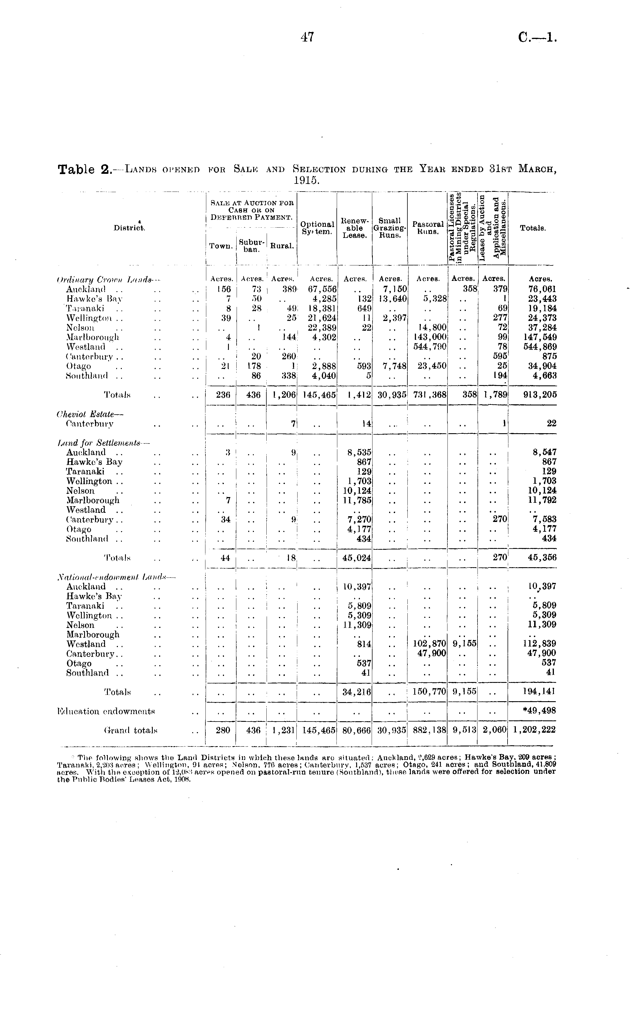 Table 2.—Lands opened for Sale and Selection during the Year ended 31st March, 1915.